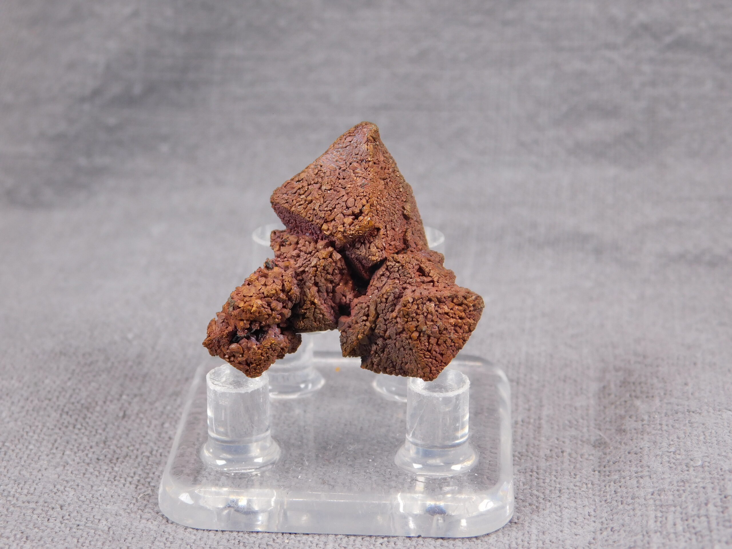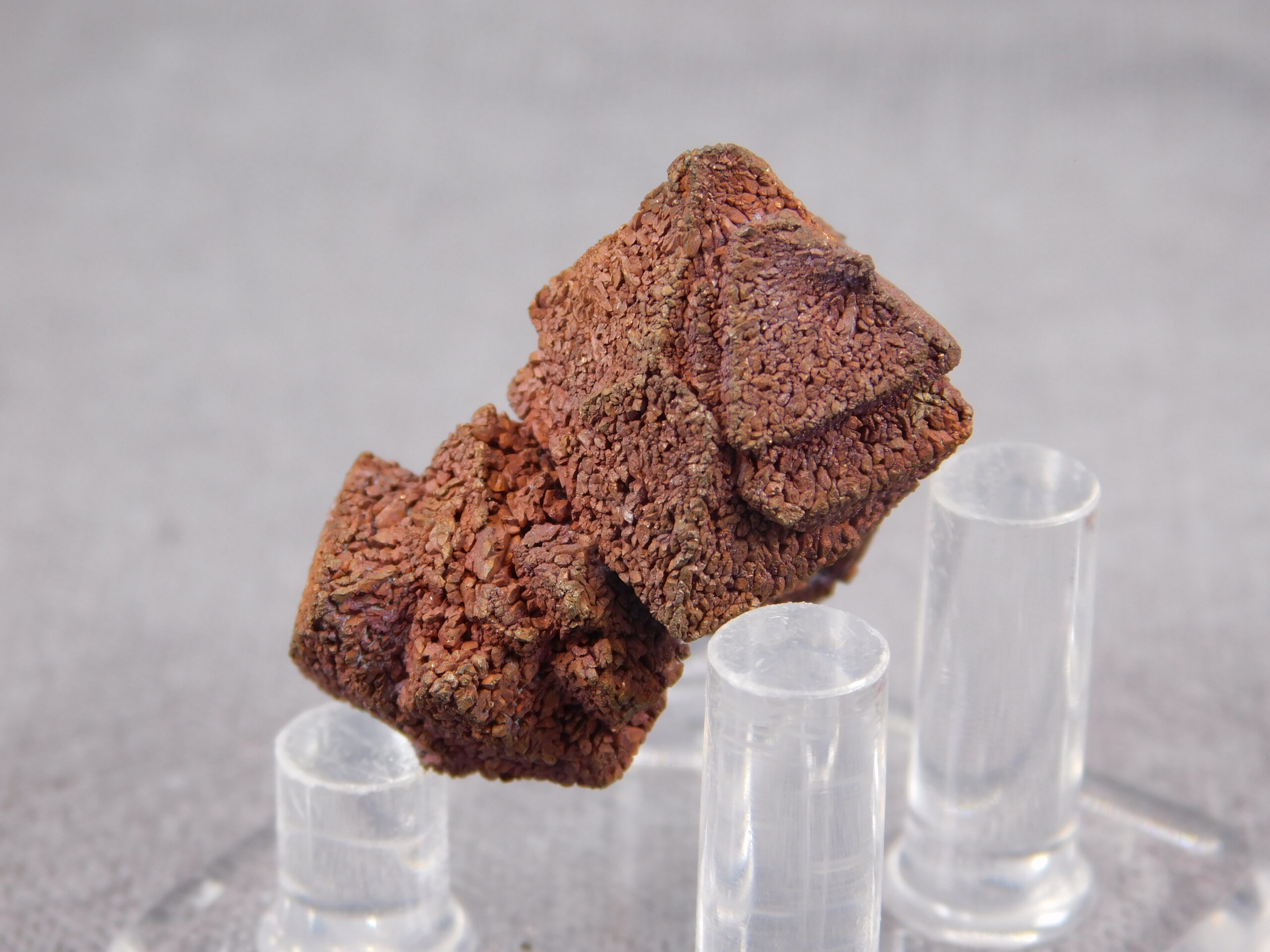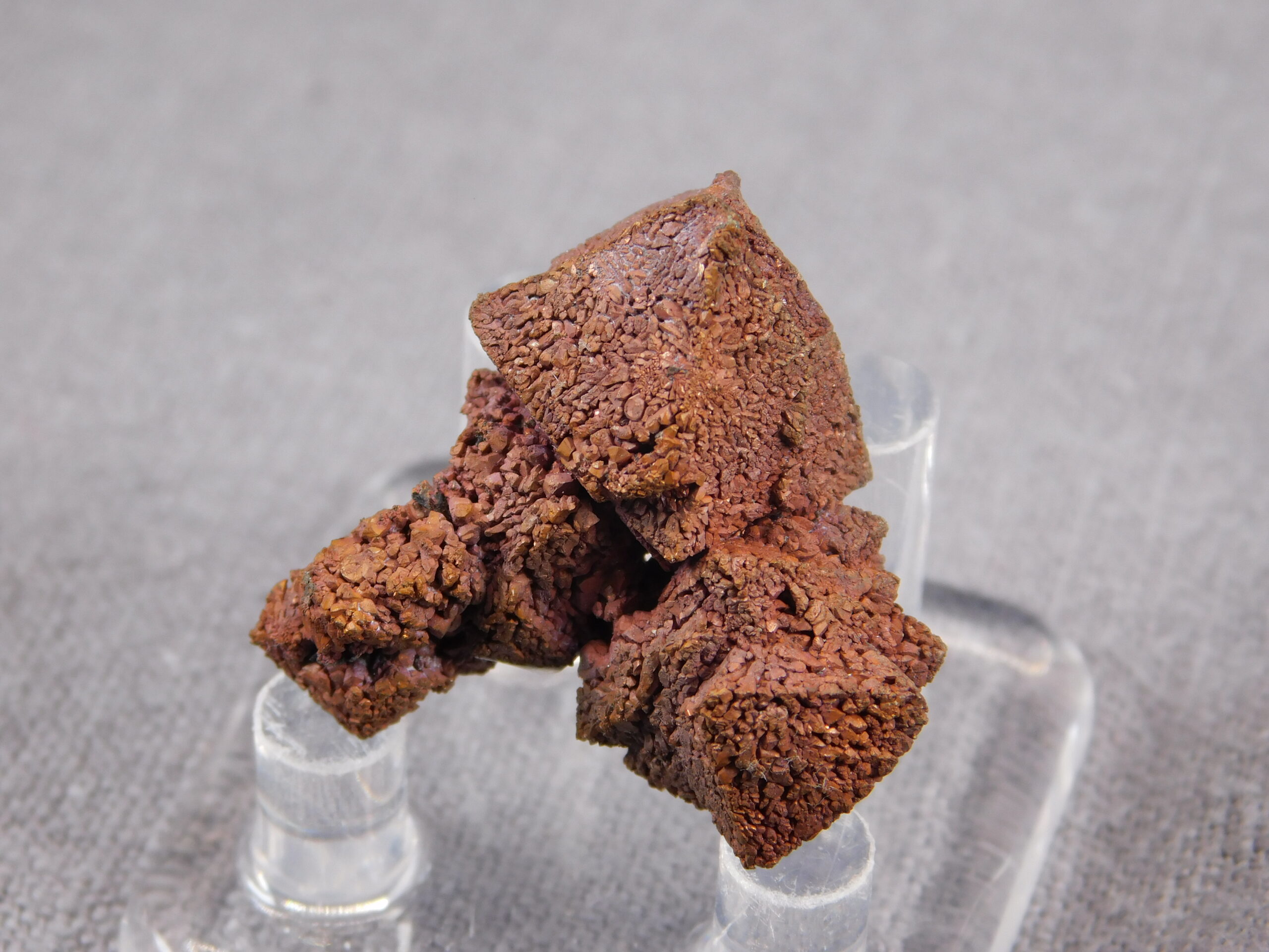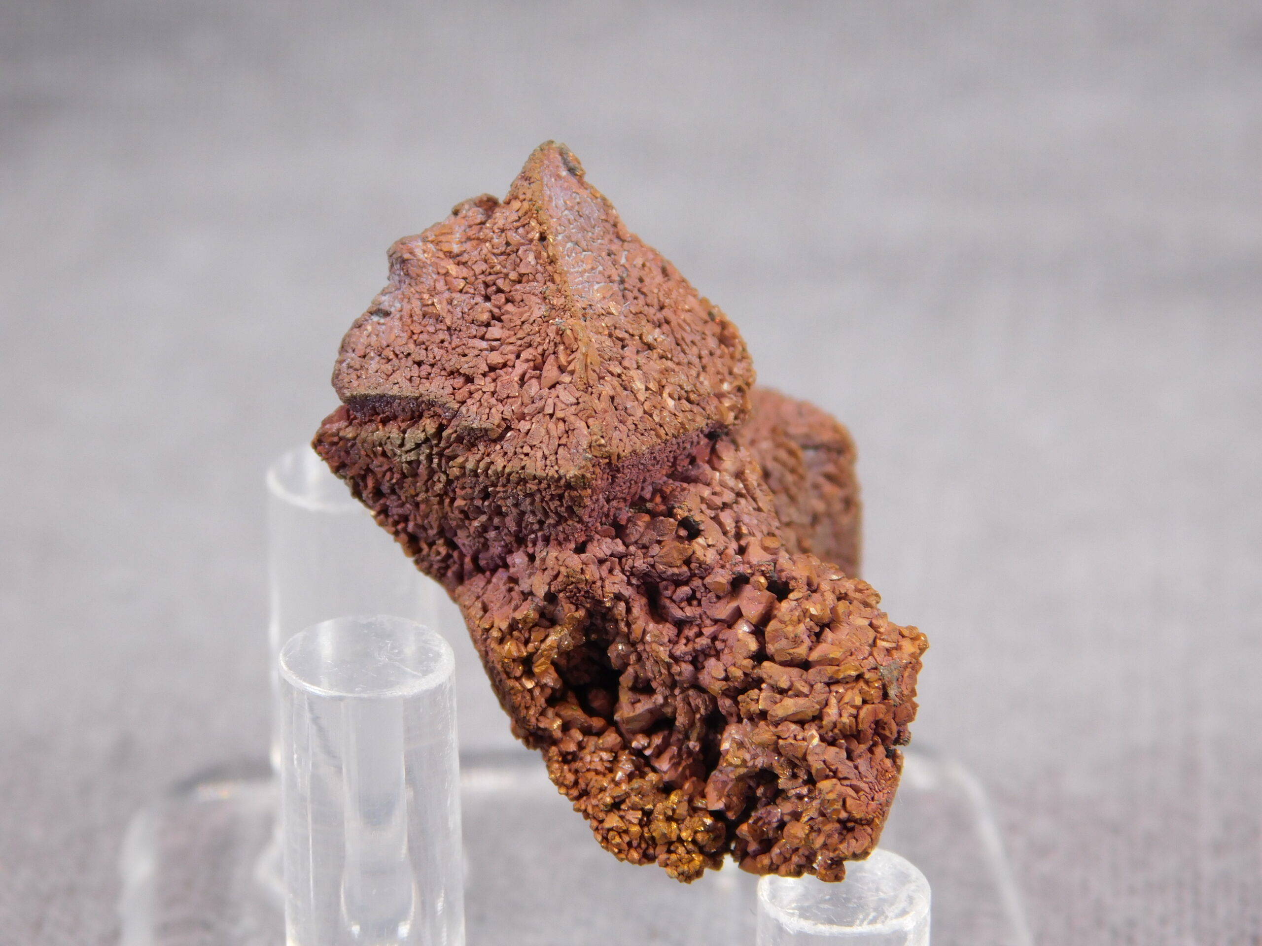 An exceptionally interesting collector’s specimen of copper pseudomorphosis after cuprite from Rubtsovsk, Russia. A fascinating specimen in which the original mineral cuprite has been replaced by fine crystals of pure copper while retaining the original crystal shape of cuprite. The specimen dates from 2010-2011; the locality has now been mined and reclaimed.