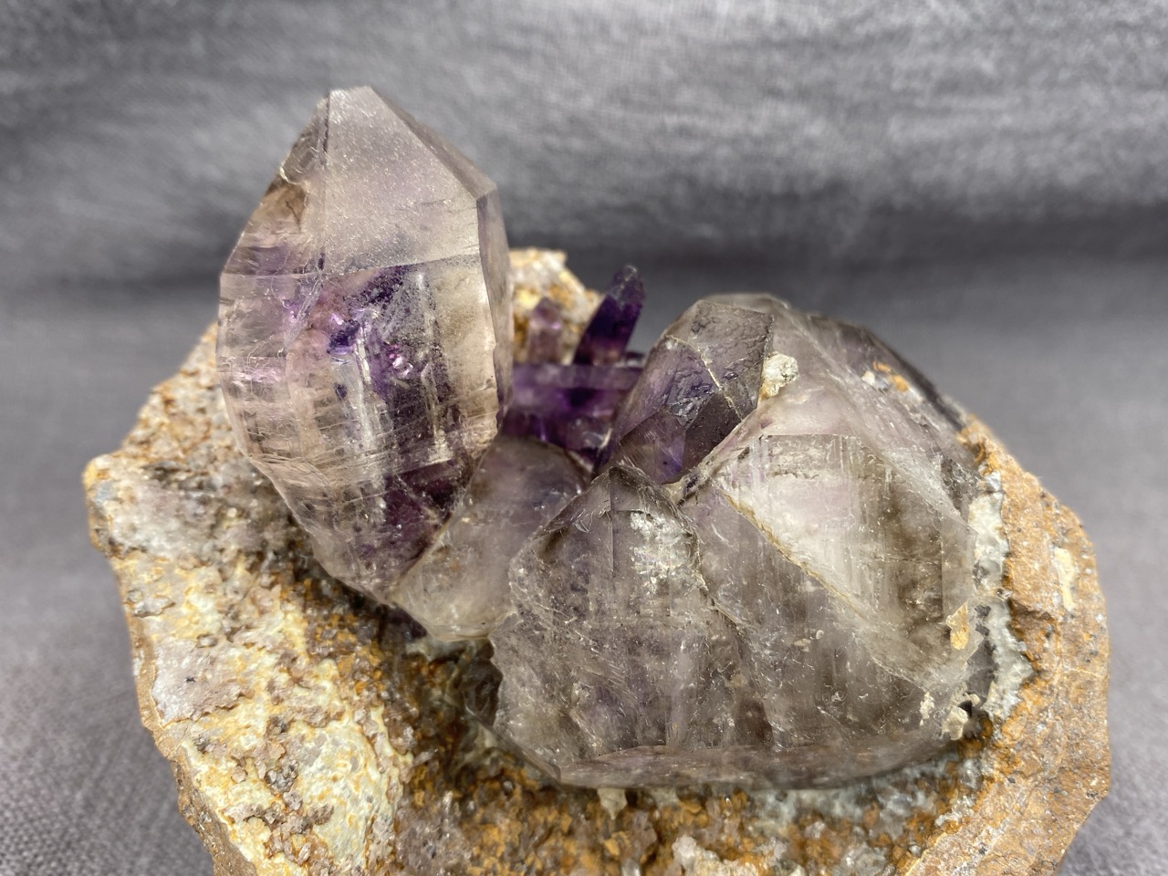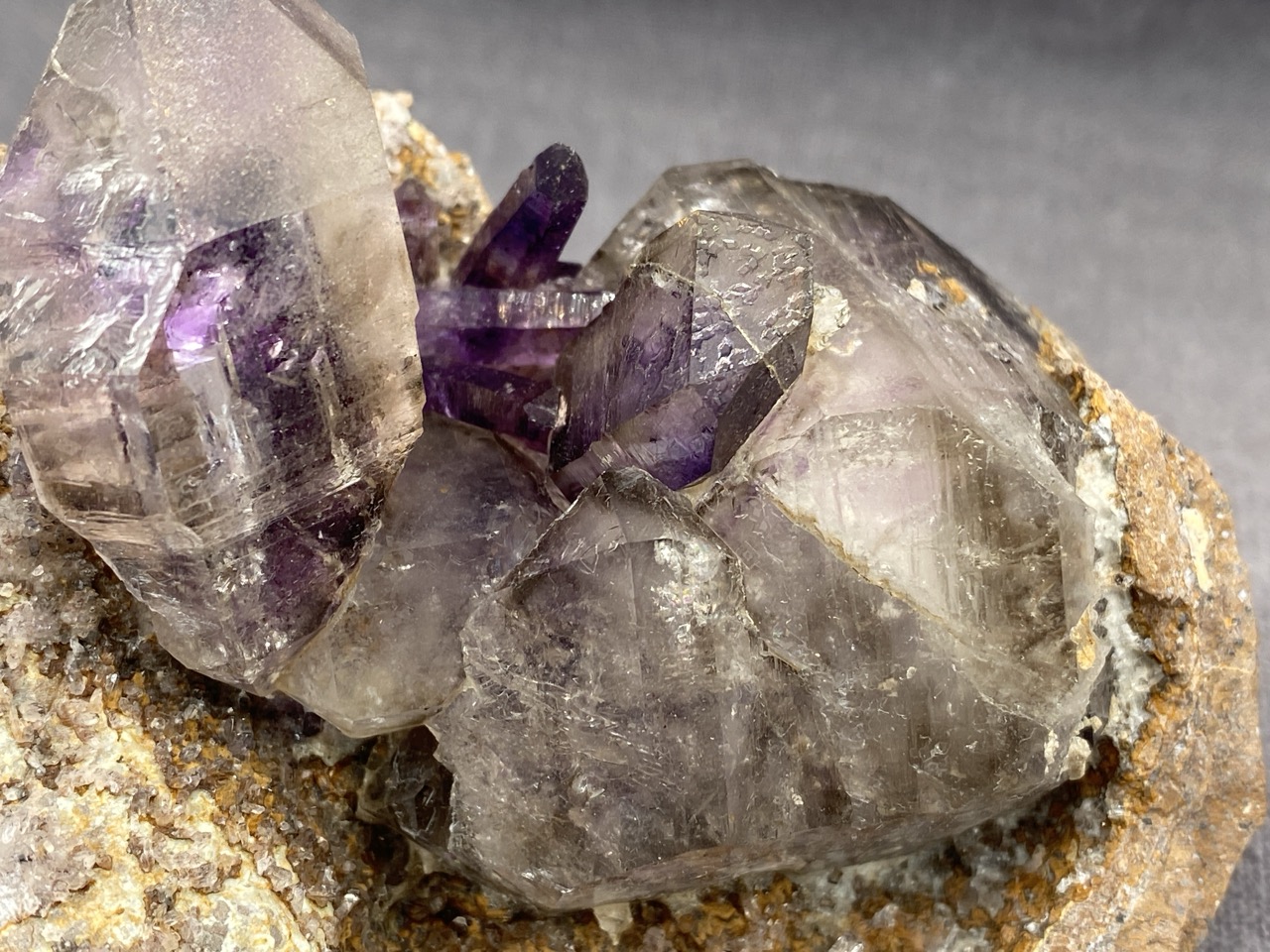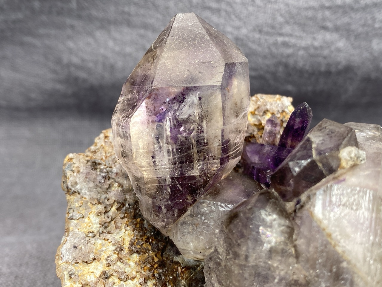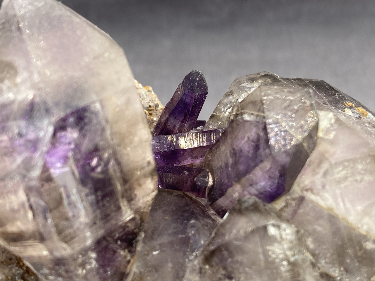 Kombinace ametystu a záhnědy z pohoří Goboboseb v Namibii – kompozičně zdařilá kombinace dominantního zonálního krystalu a menších sytě fialových krystalků.