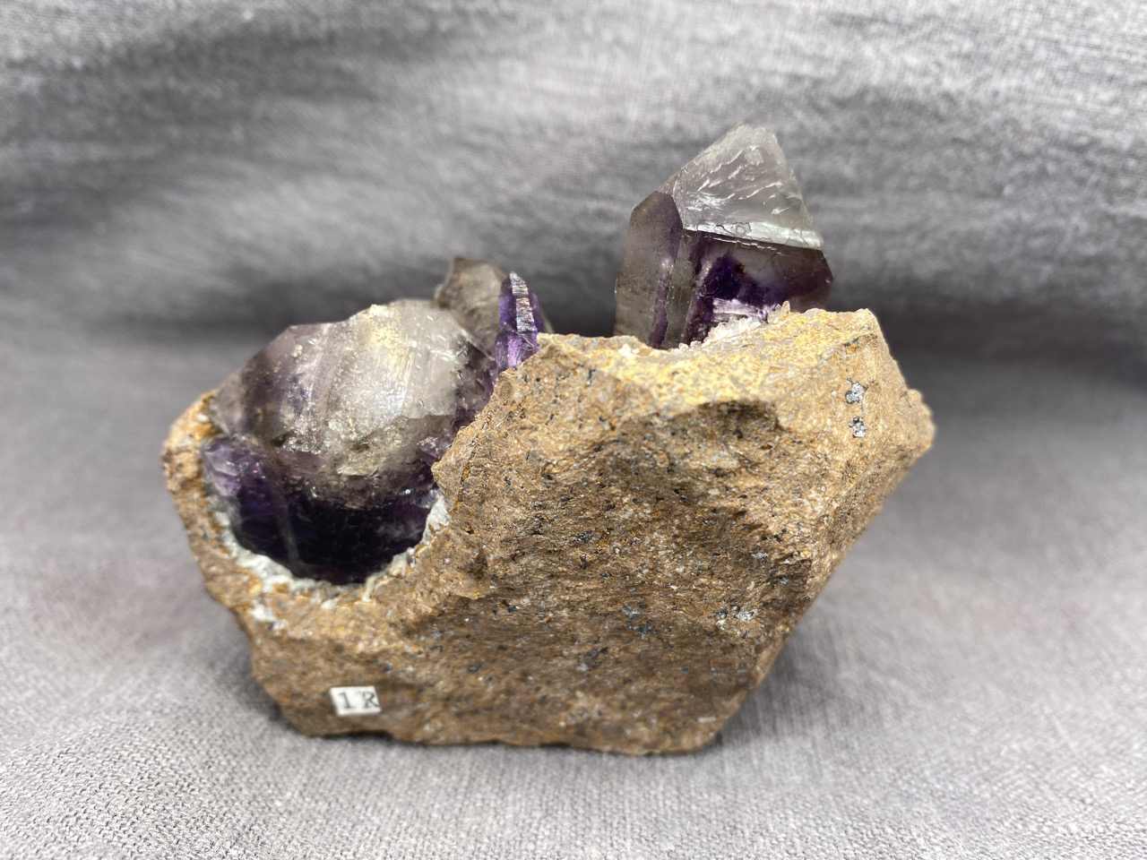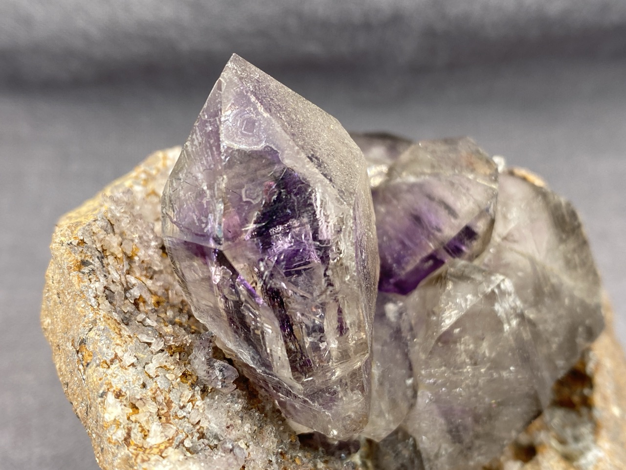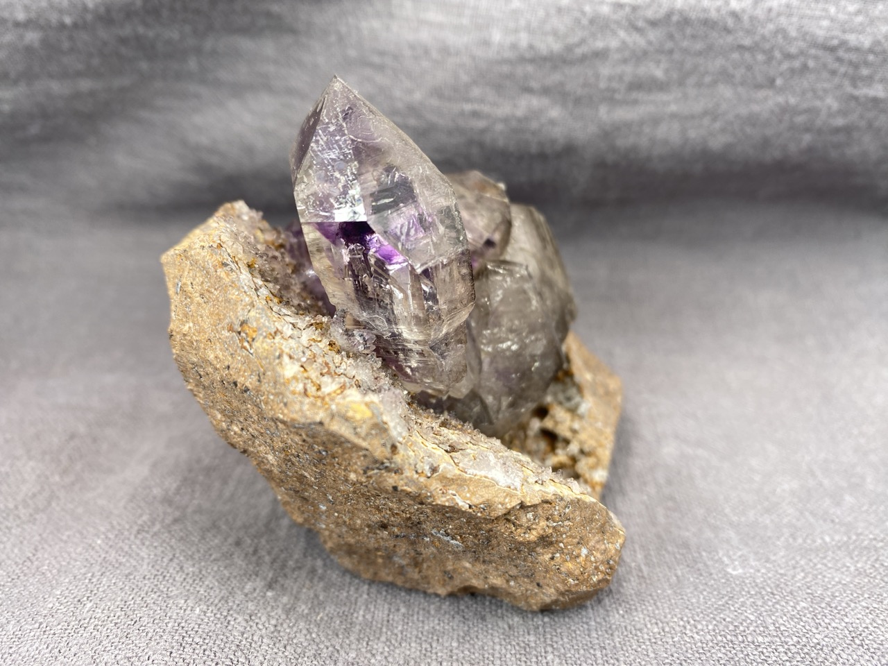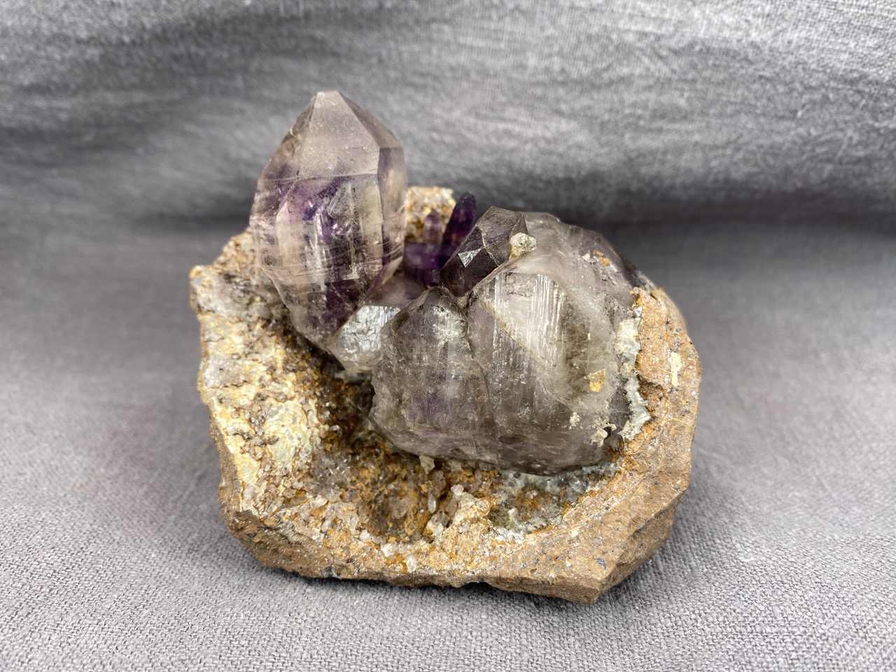 Kombinace ametystu a záhnědy z pohoří Goboboseb v Namibii – kompozičně zdařilá kombinace dominantního zonálního krystalu a menších sytě fialových krystalků.