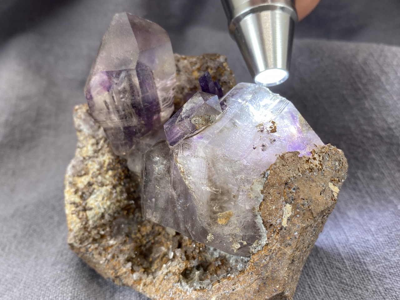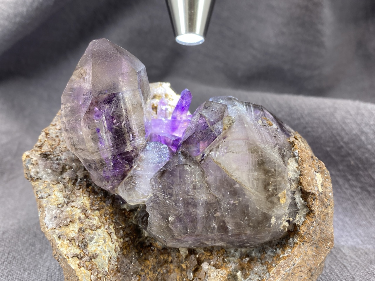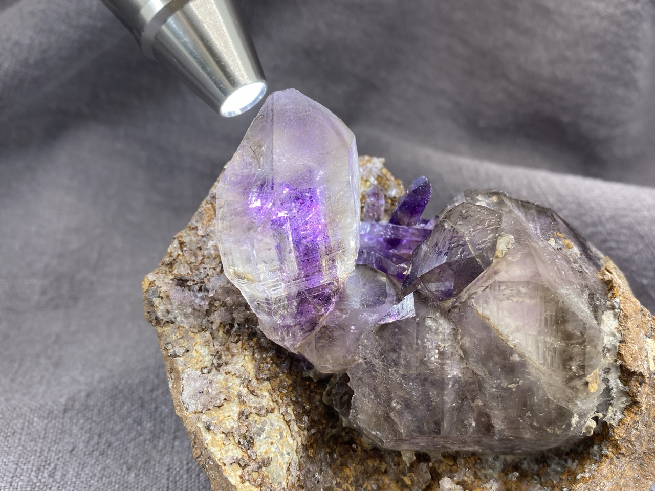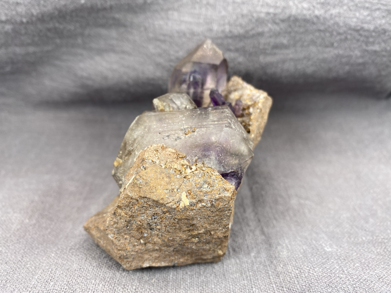 Kombinace ametystu a záhnědy z pohoří Goboboseb v Namibii – kompozičně zdařilá kombinace dominantního zonálního krystalu a menších sytě fialových krystalků.