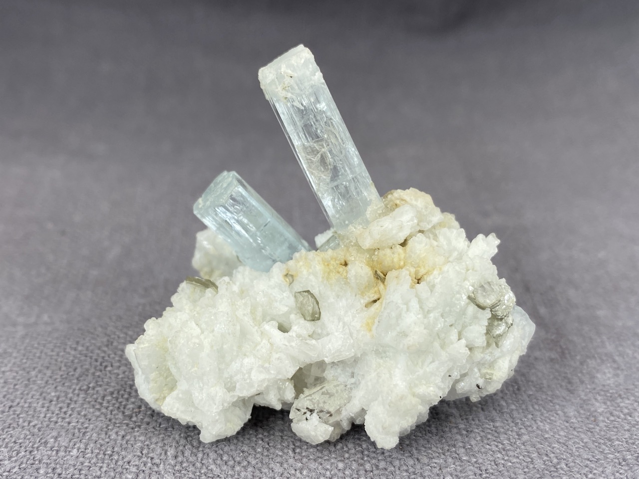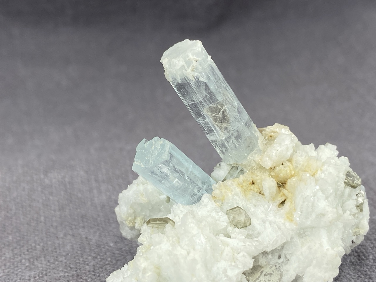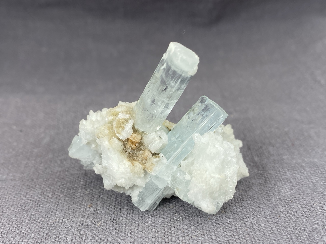Akvamarín z lokality Skardu v Pákistánu – dva jemně zbarvené, téměř průzračné krystaly narůstající na drobných krystalech živce vytvářejí malý působivý vzorek.