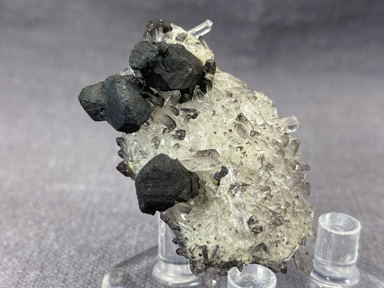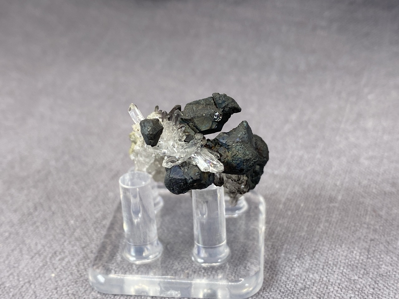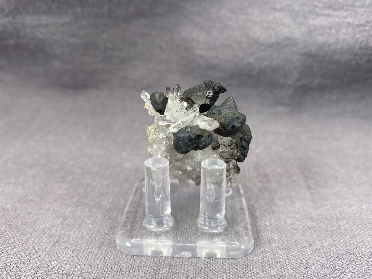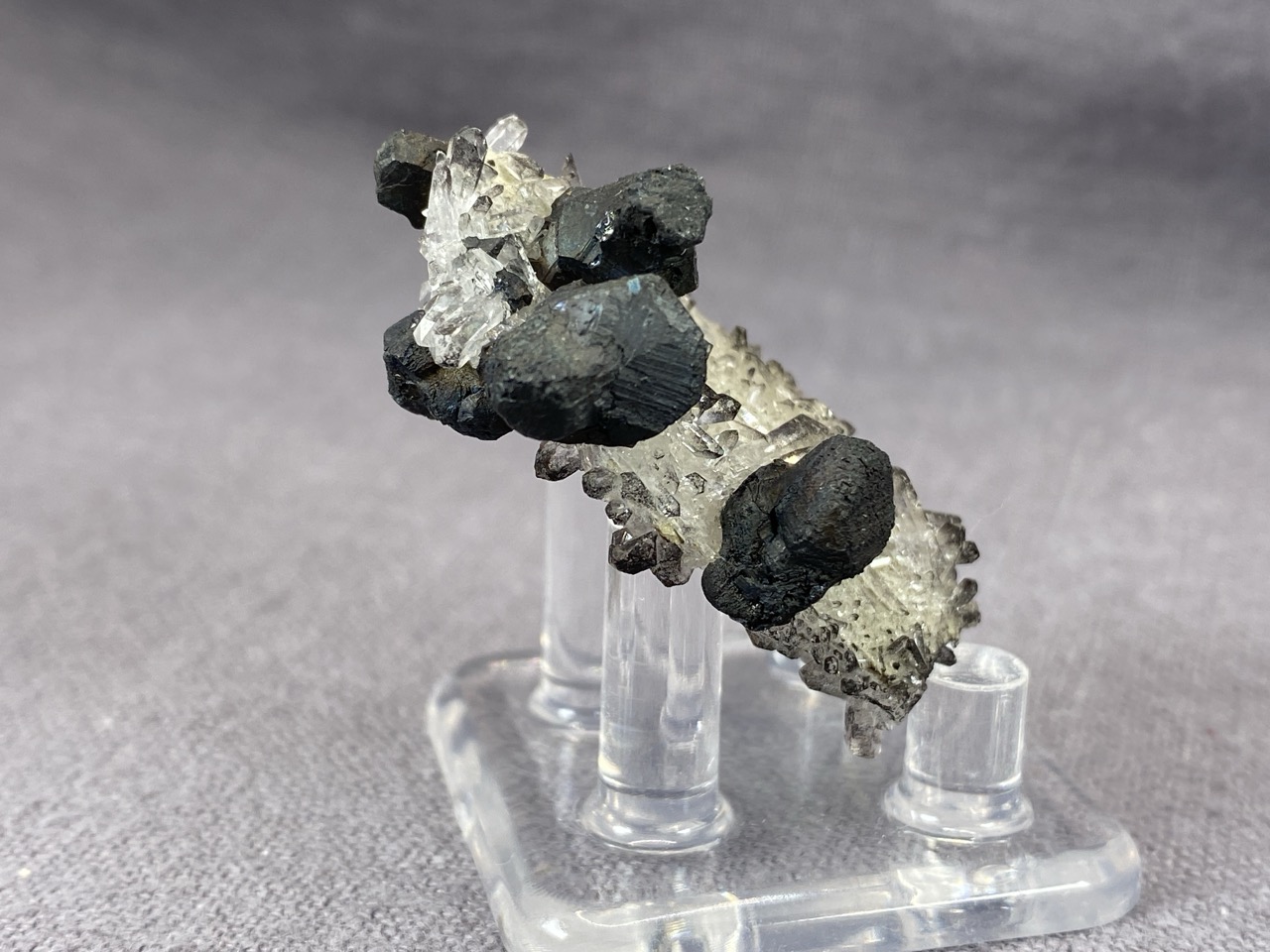 Tyto typické krystaly chalkozínu na malých průzračných krystalech křemene představují klasickou ukázku tohoto minerálu z dnes již pozapomenuté lokality Džezkazgan v Kazachstánu. Kdysi vzkvétající naleziště, které v devadesátých letech hojně obohacovalo sběratelský trh mimořádně atraktivními vzorky měděných minerálů, dnes uvadá. Tento malý vzorek je dnes již zřídka vídanou malou vzpomínkou na džezkazganské staré dobré časy.