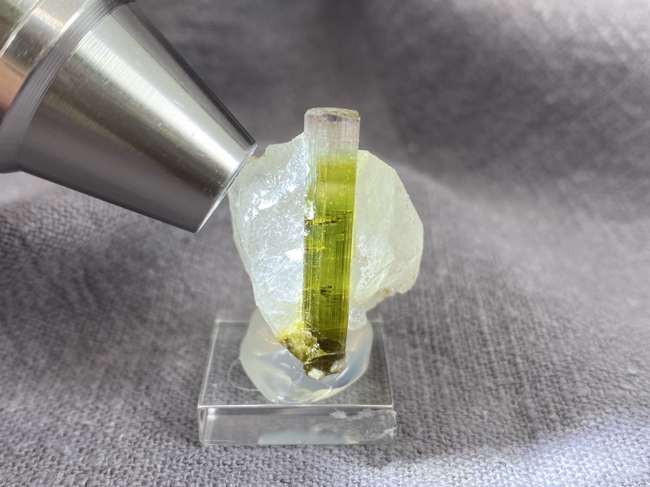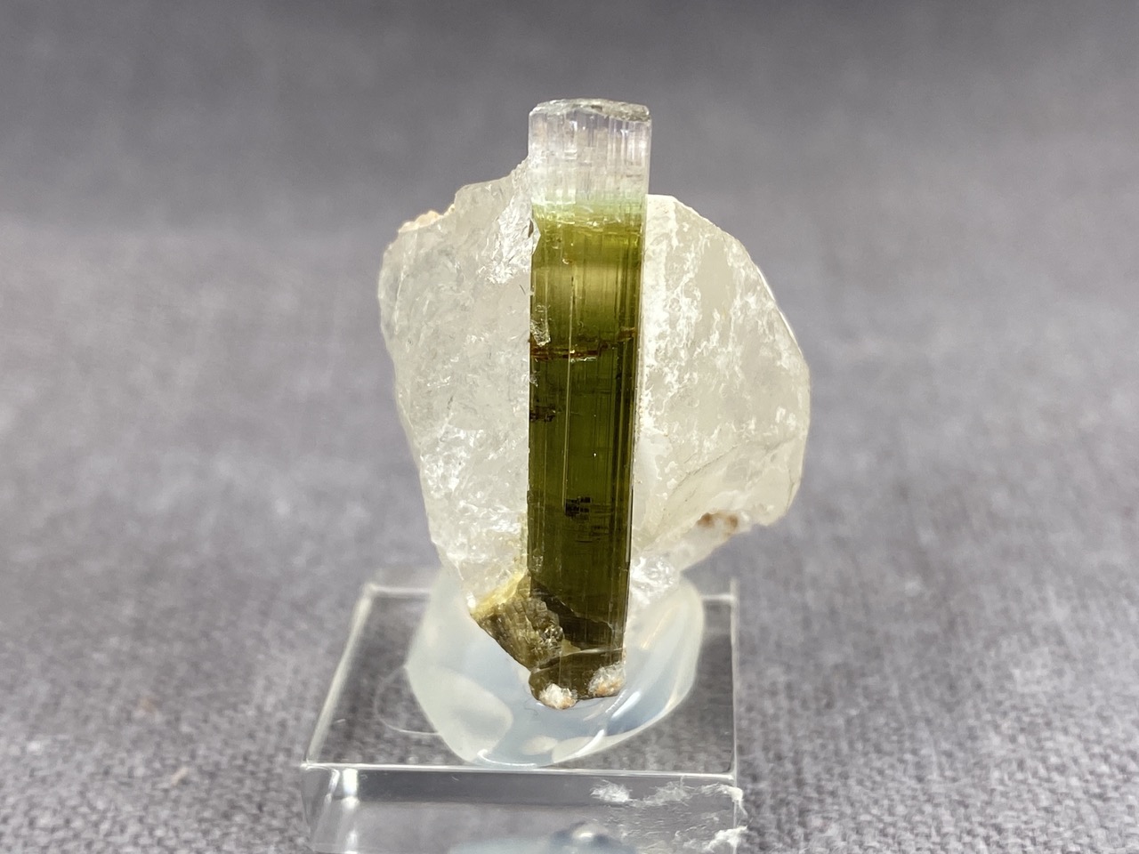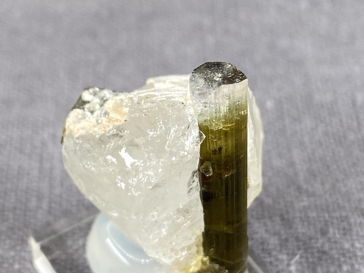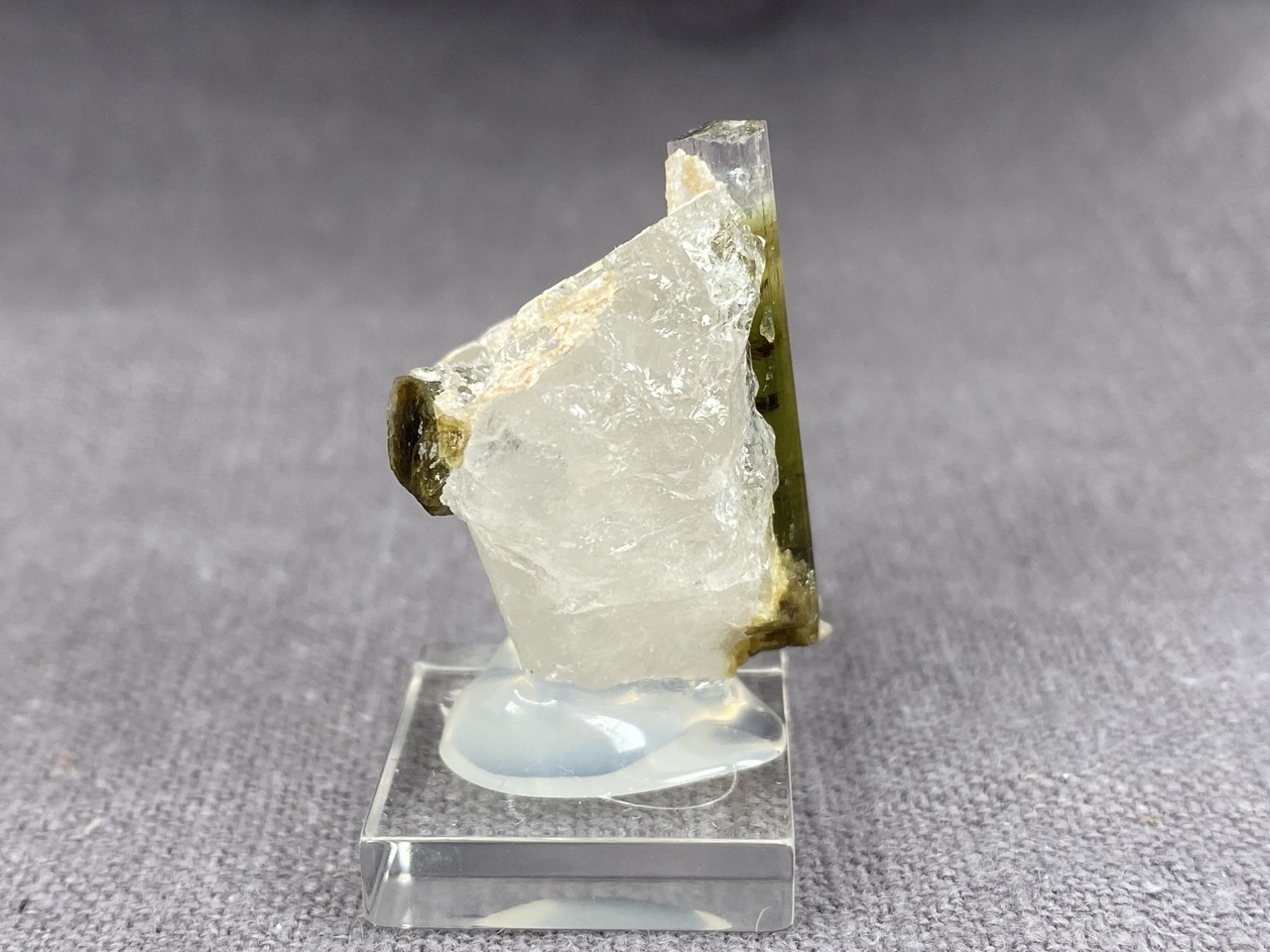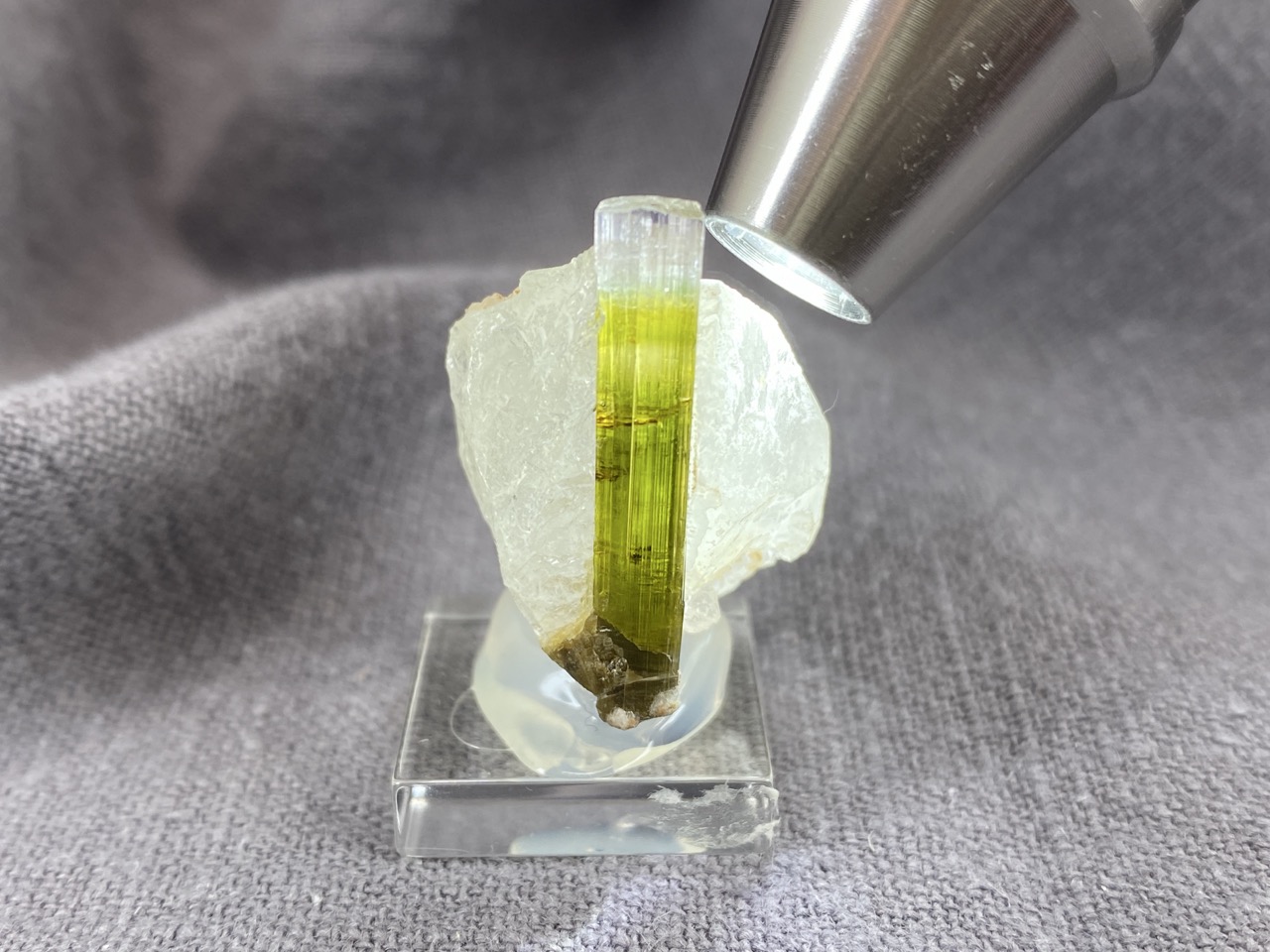 Malý klenot z lokality Skardu v Pákistánu – průzračný krystal turmalínu s proměnlivou barevností na křemenném krystalu.