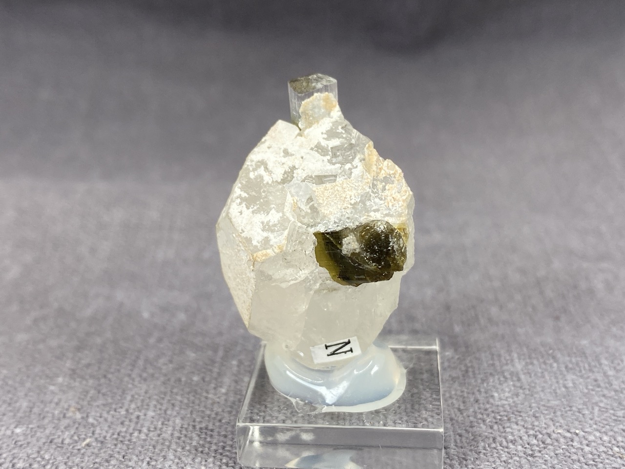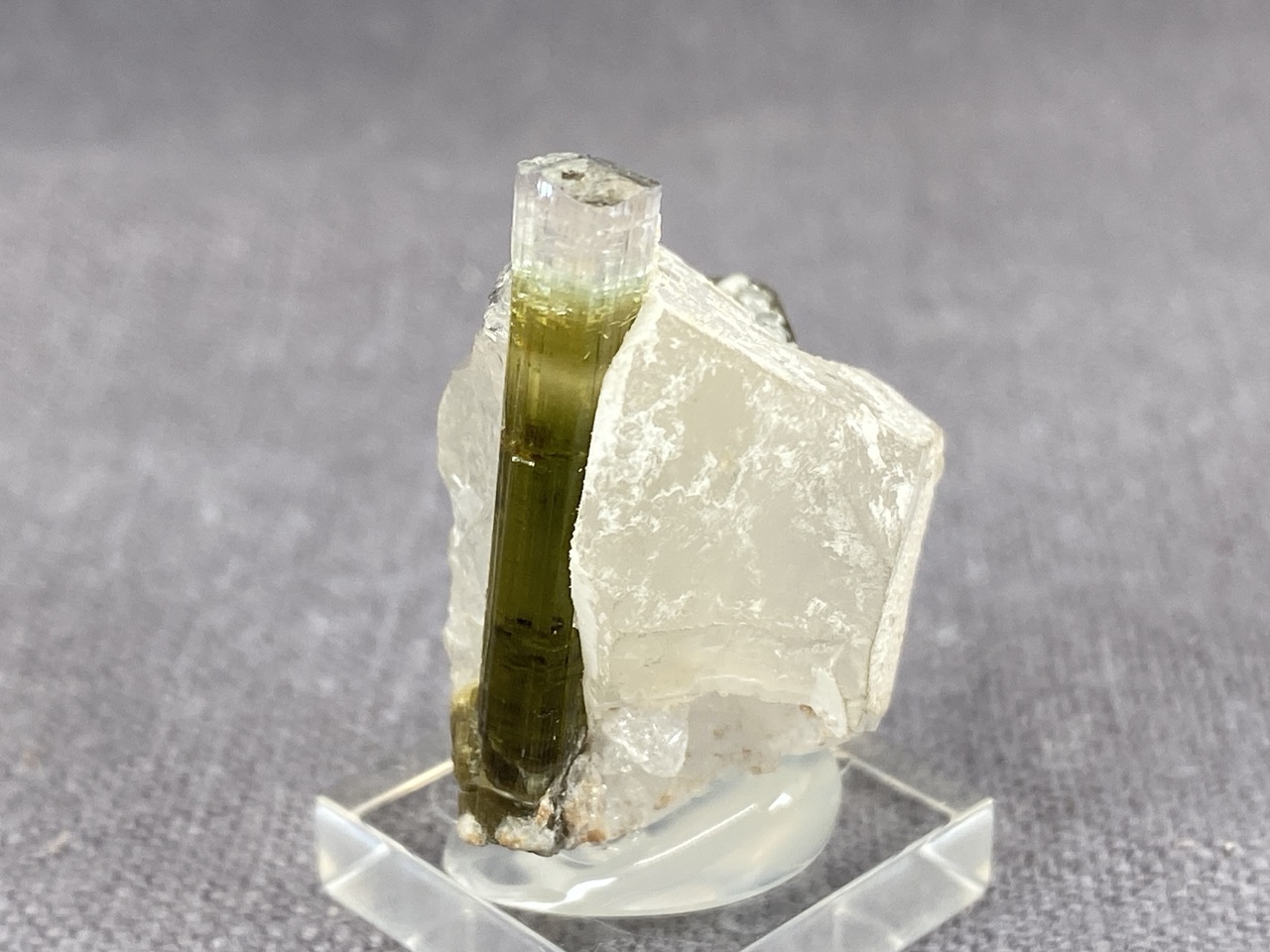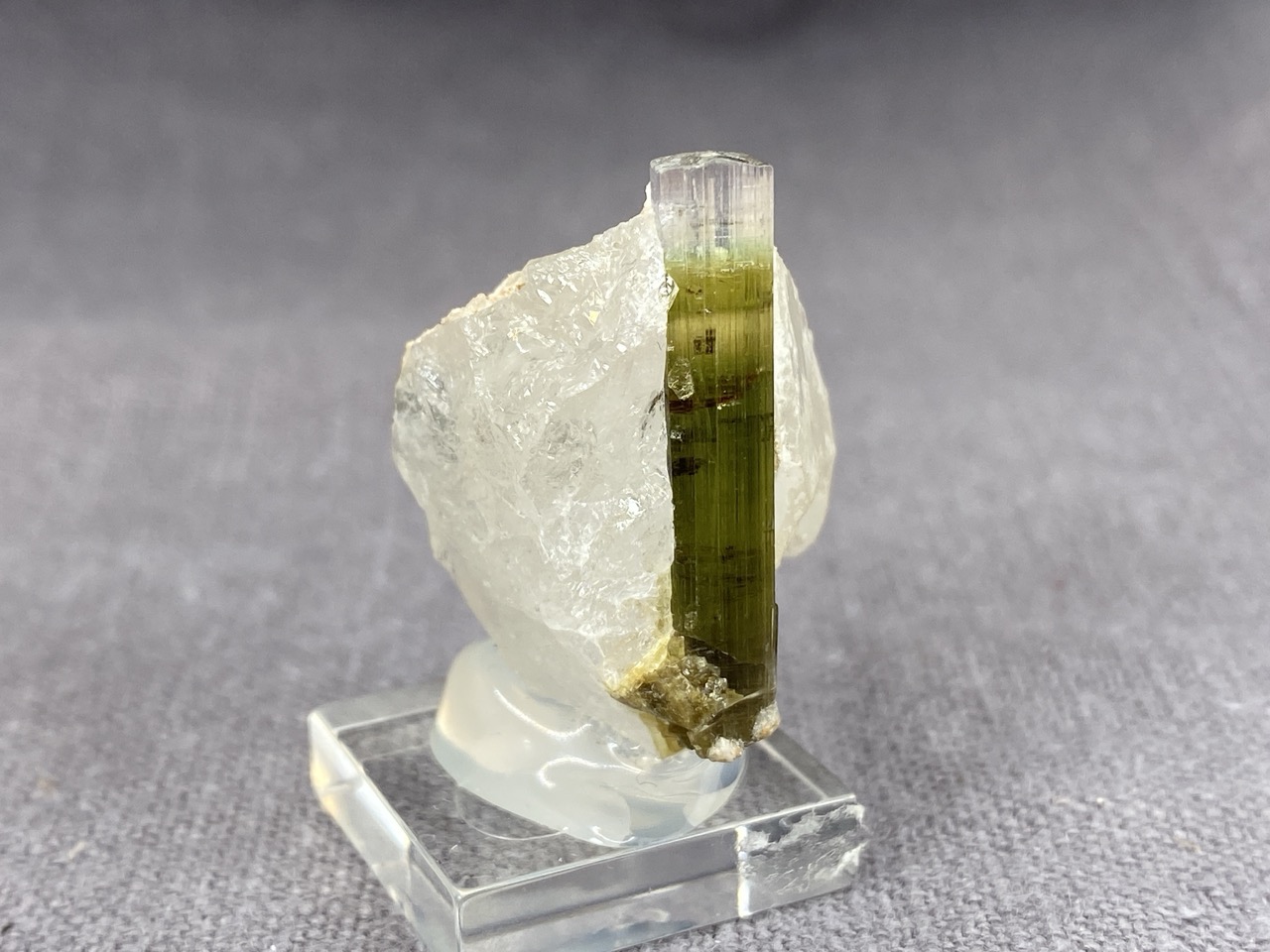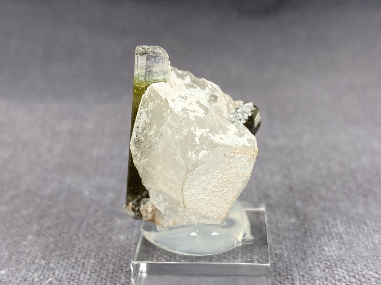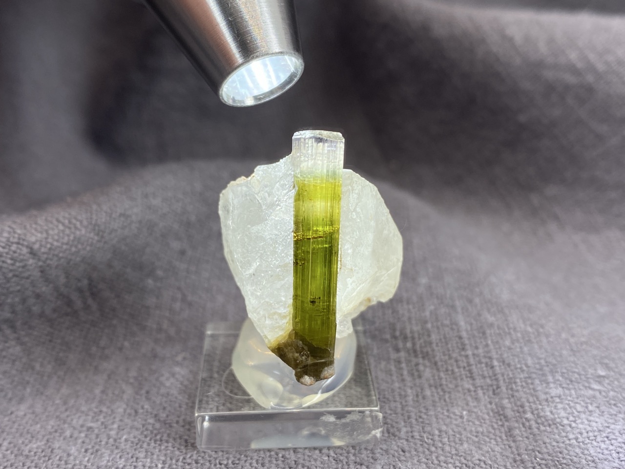 Malý klenot z lokality Skardu v Pákistánu – průzračný krystal turmalínu s proměnlivou barevností na křemenném krystalu.