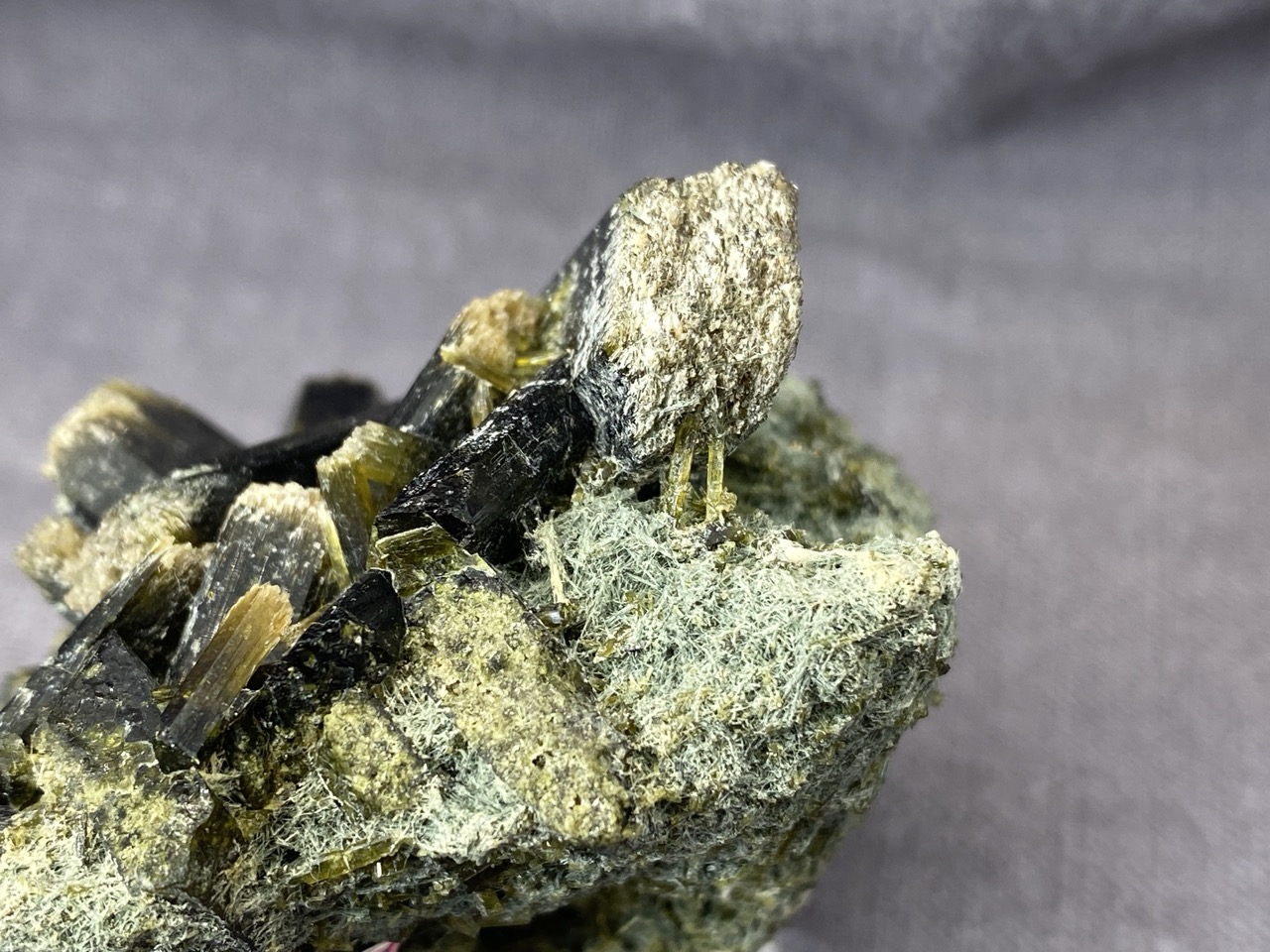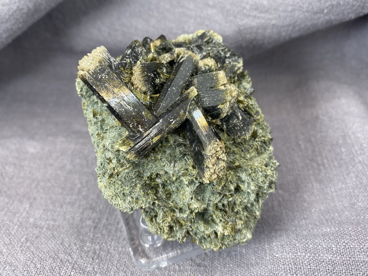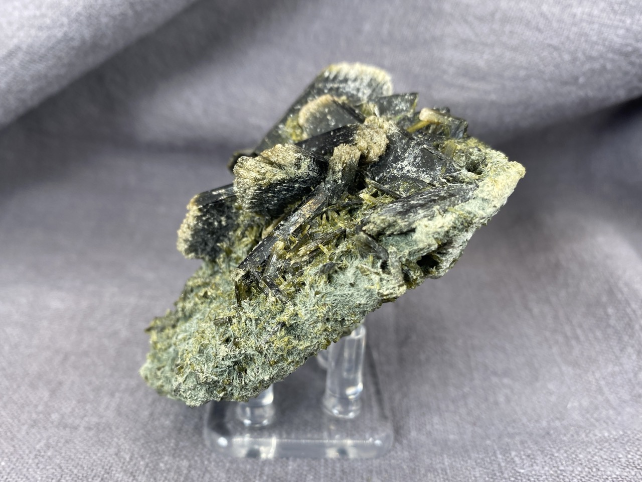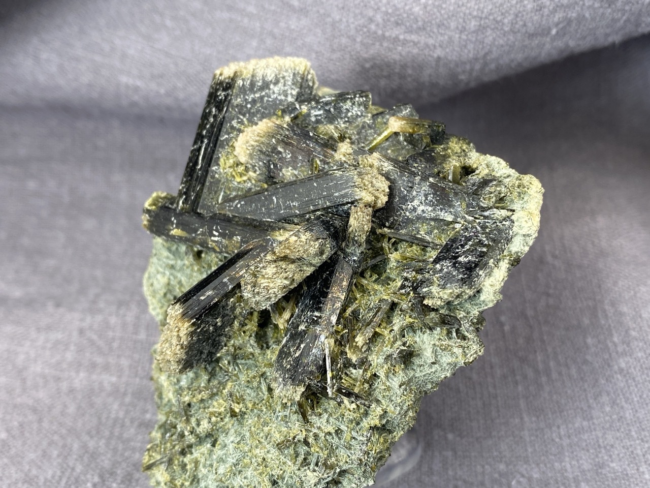Epidot z lokality Hashobay, Shigar, Pákistán – něžné lesklé krystaly leží na podkladové hornině v působivé kompozici.