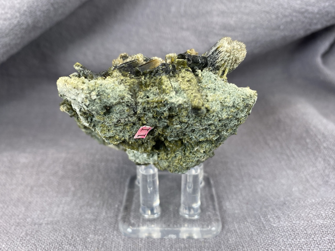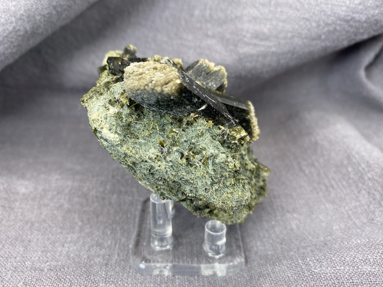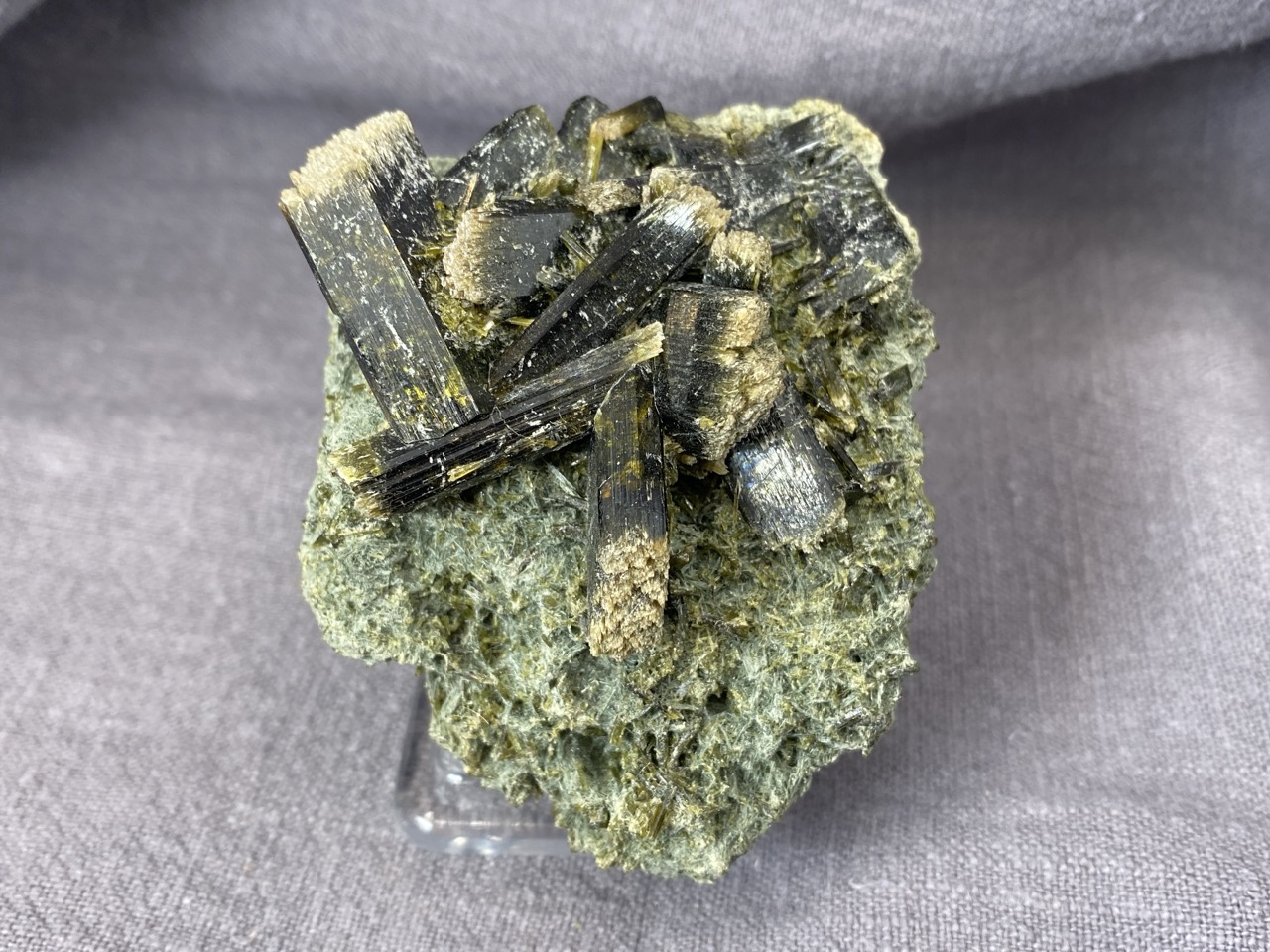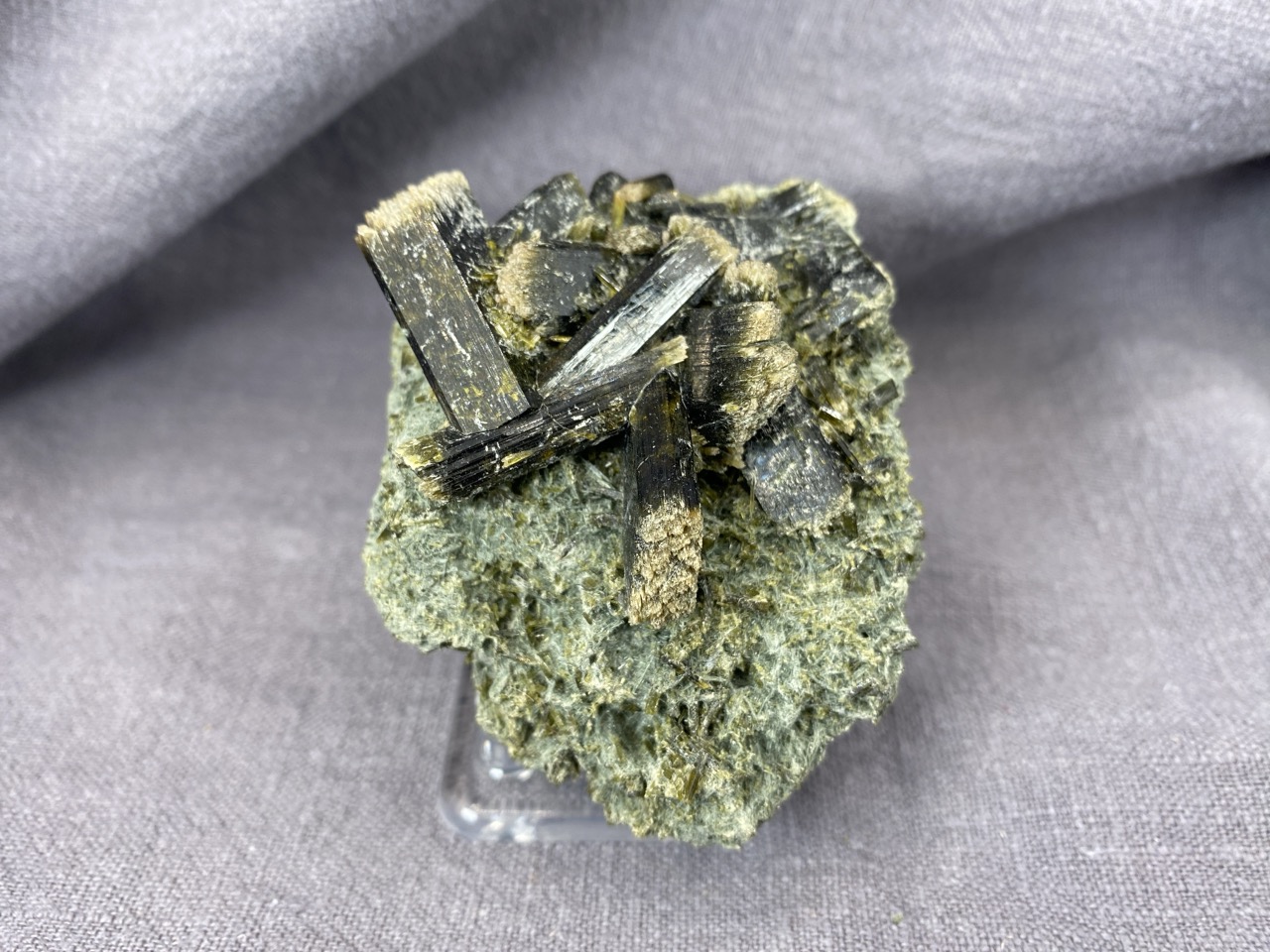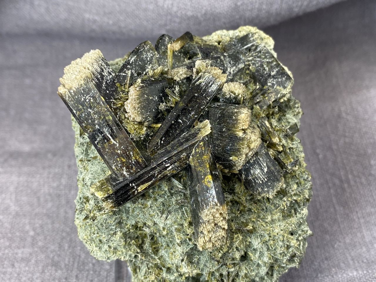 Epidot z lokality Hashobay, Shigar, Pákistán – něžné lesklé krystaly leží na podkladové hornině v působivé kompozici.