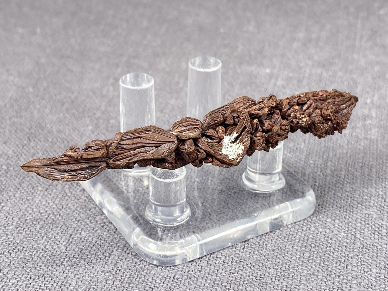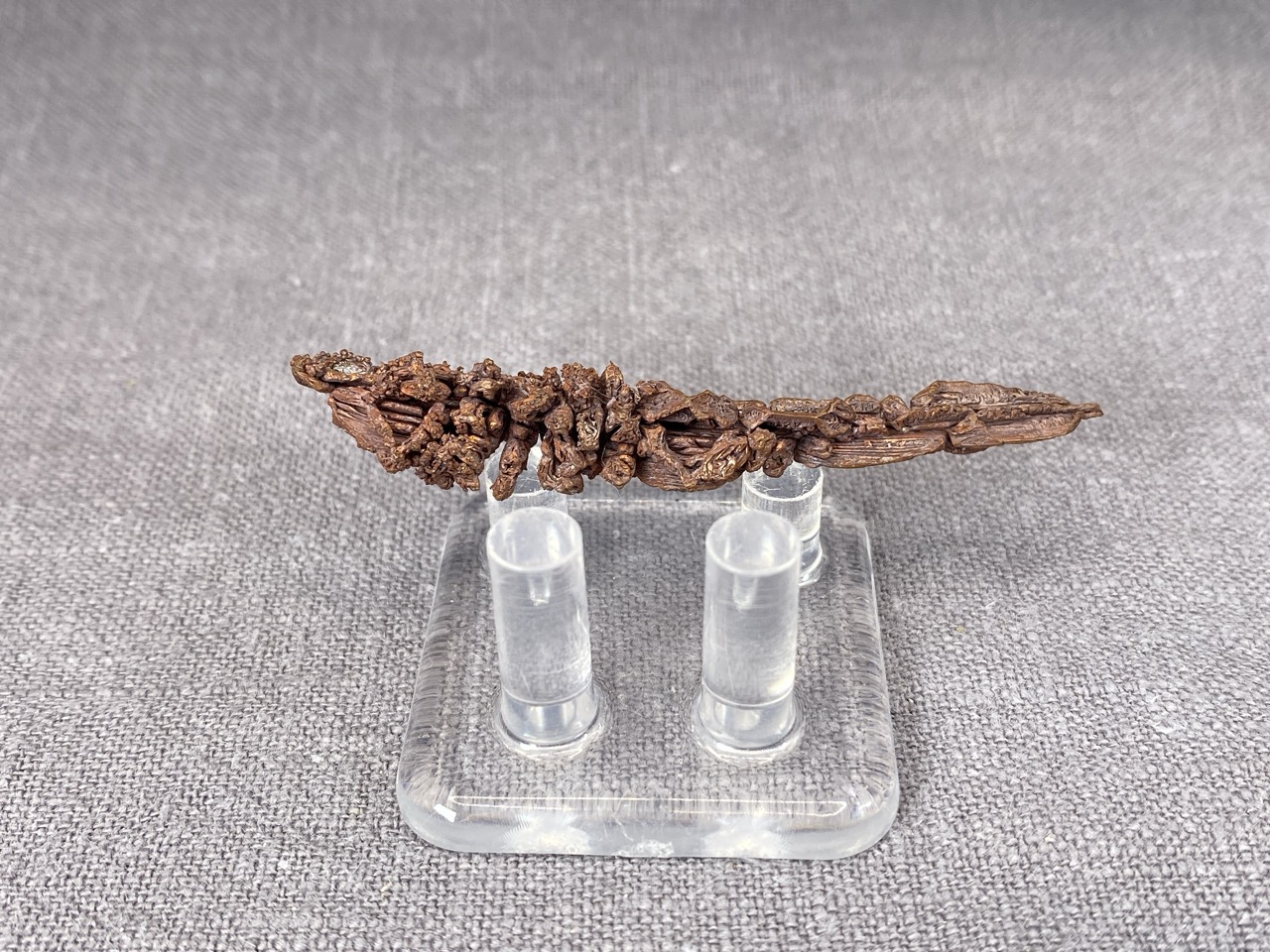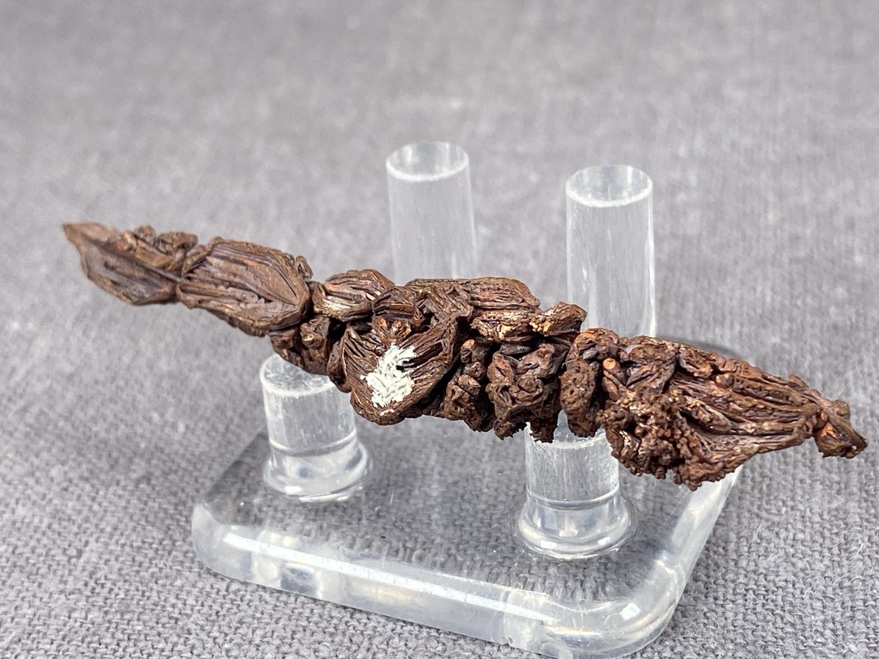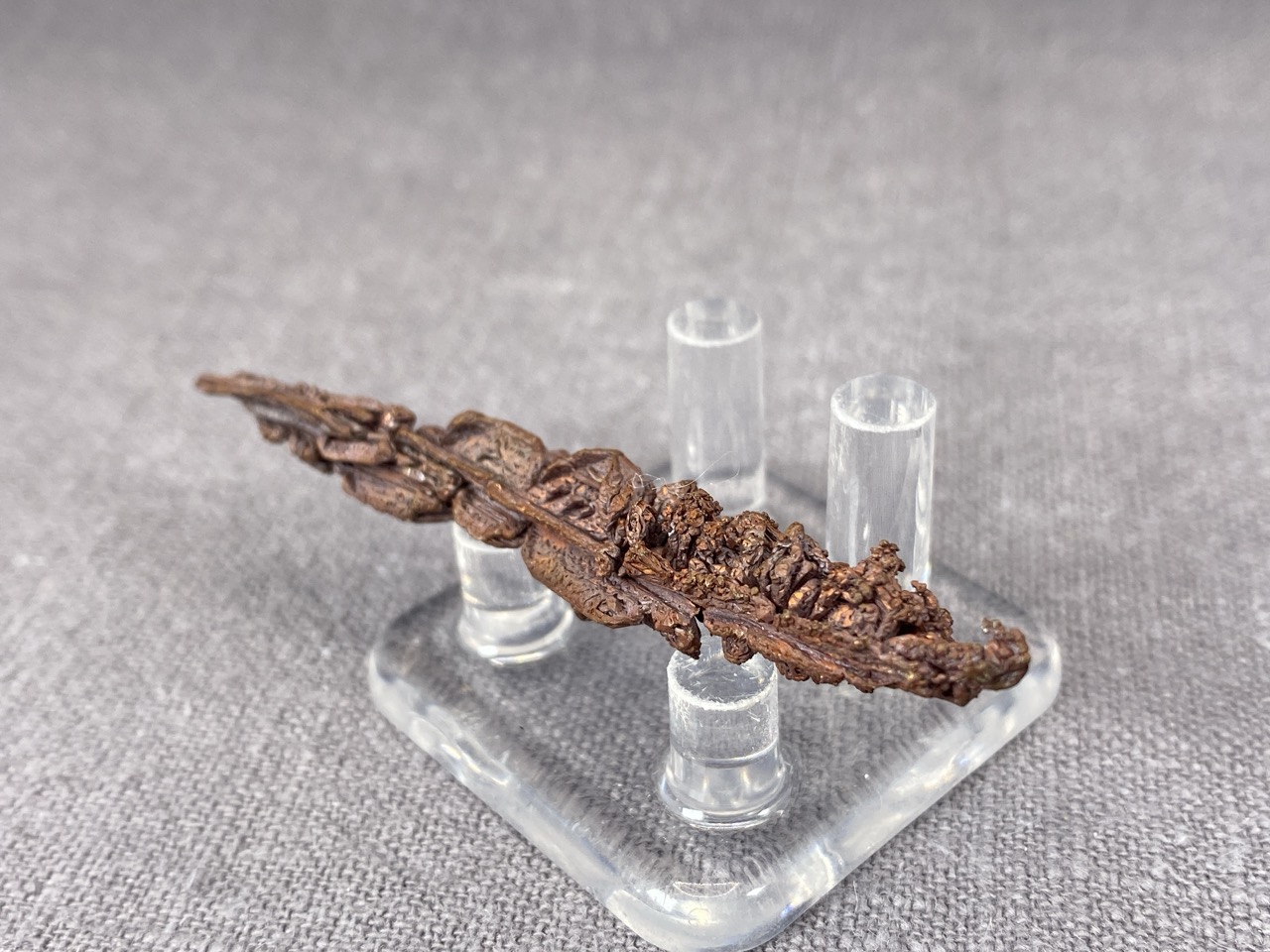 Pozoruhodný krystal ryzí mědi z dolu Itauz v kazašském Džezkazganu. Jedná se o typický dvojčatný srůst podobný světoznámým vzorkům z arizonské lokality Bisbee. Kdysi hojně se vyskytující materiál je dnes stále vzácnější, poslední nález sběratelsky atraktivních vzorků na této lokalitě je datován roku 2014. Při bližším pohledu vzorek svými detaily pozorovatele zcela okouzlí.