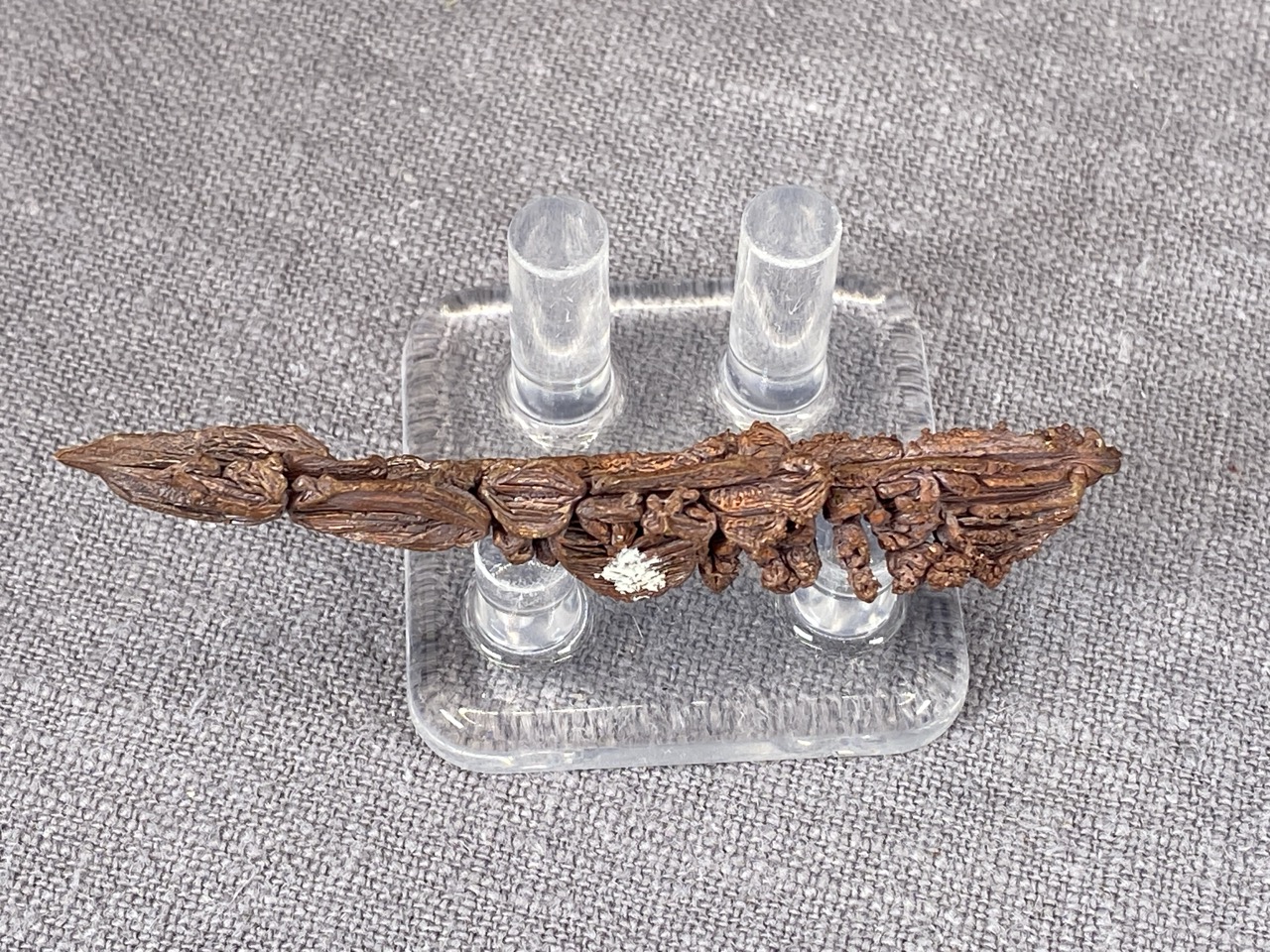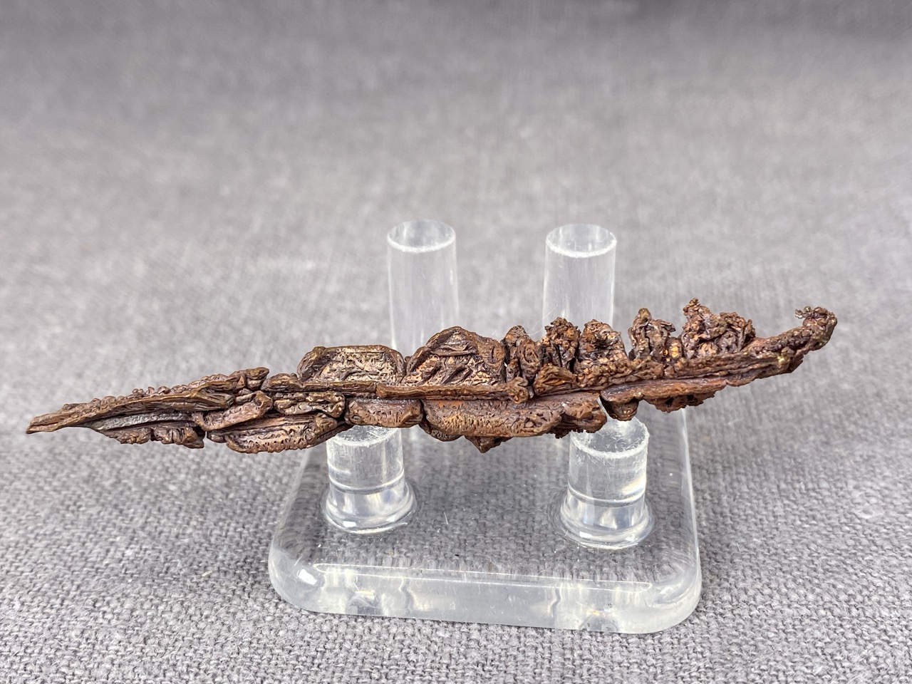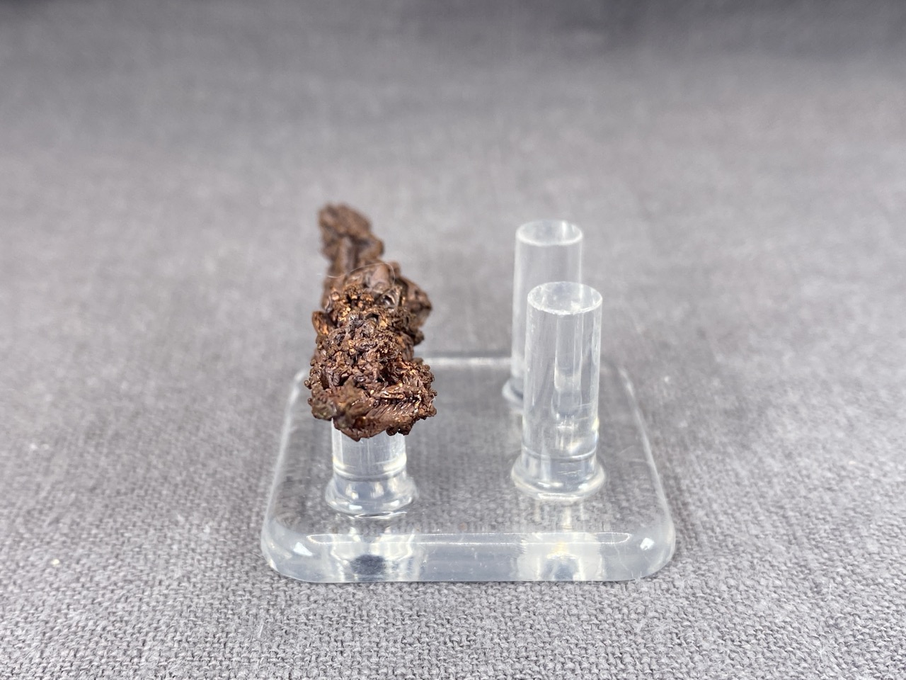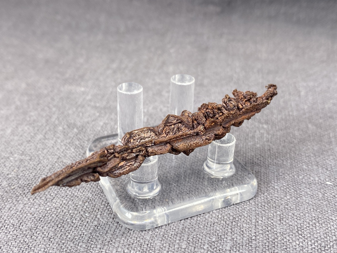 Pozoruhodný krystal ryzí mědi z dolu Itauz v kazašském Džezkazganu. Jedná se o typický dvojčatný srůst podobný světoznámým vzorkům z arizonské lokality Bisbee. Kdysi hojně se vyskytující materiál je dnes stále vzácnější, poslední nález sběratelsky atraktivních vzorků na této lokalitě je datován roku 2014. Při bližším pohledu vzorek svými detaily pozorovatele zcela okouzlí.