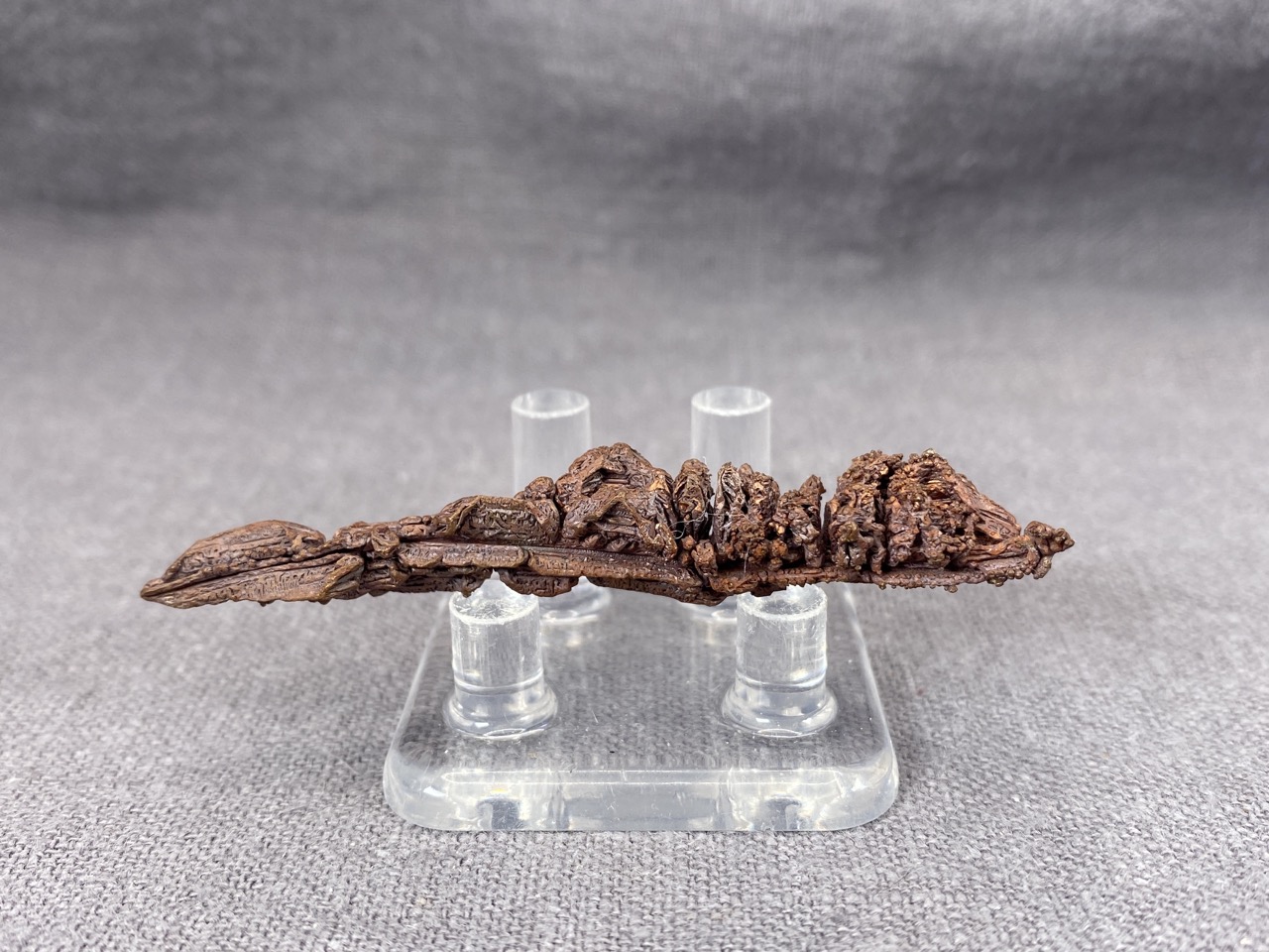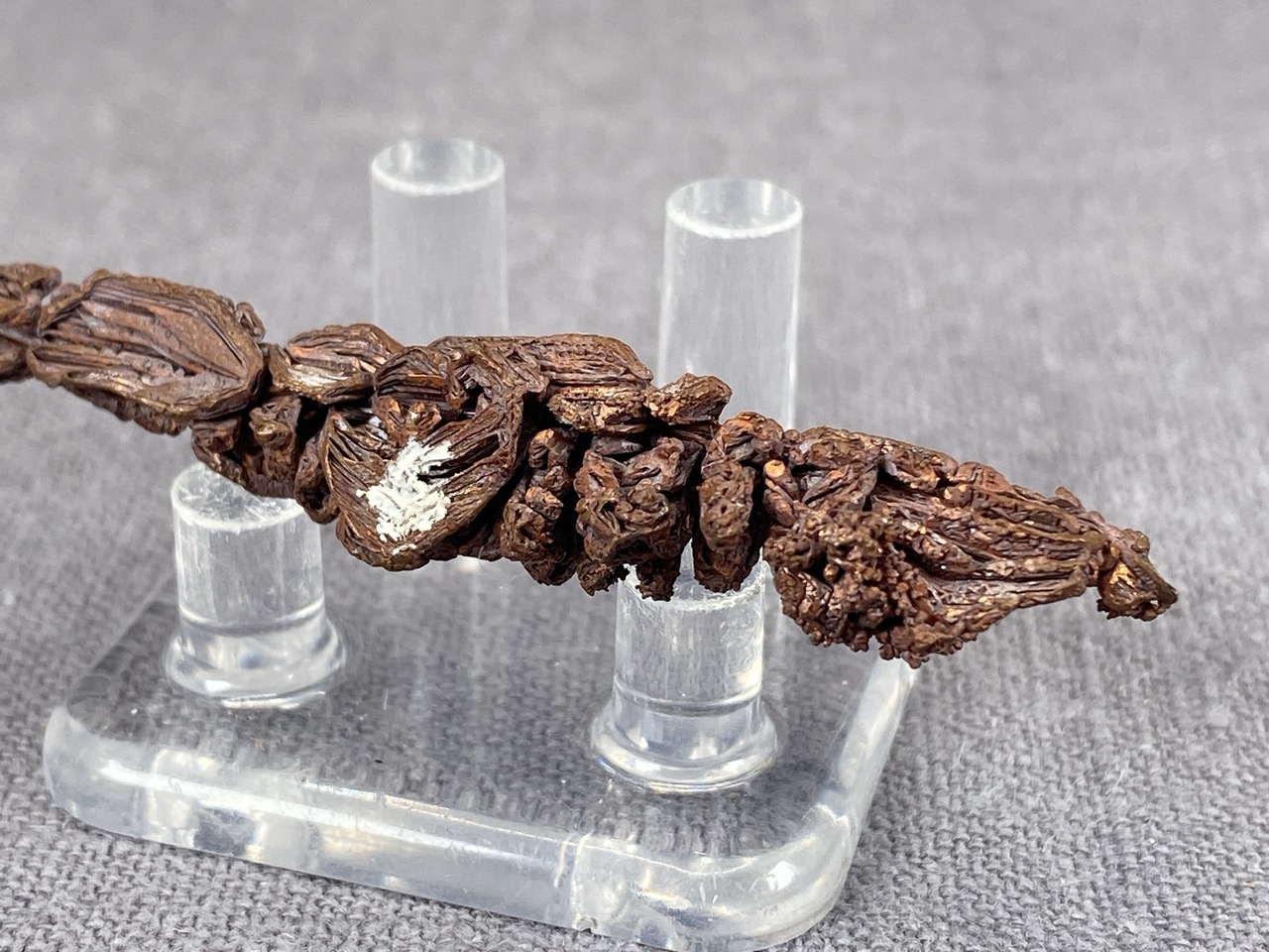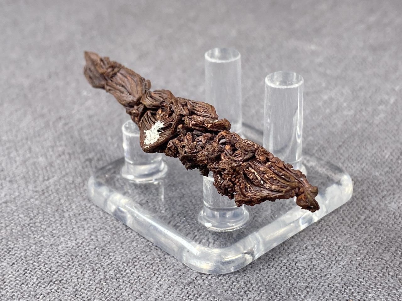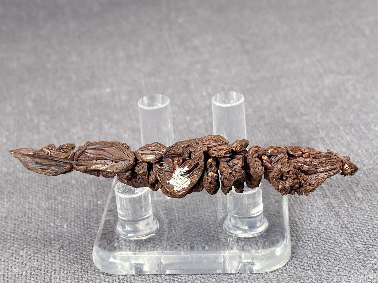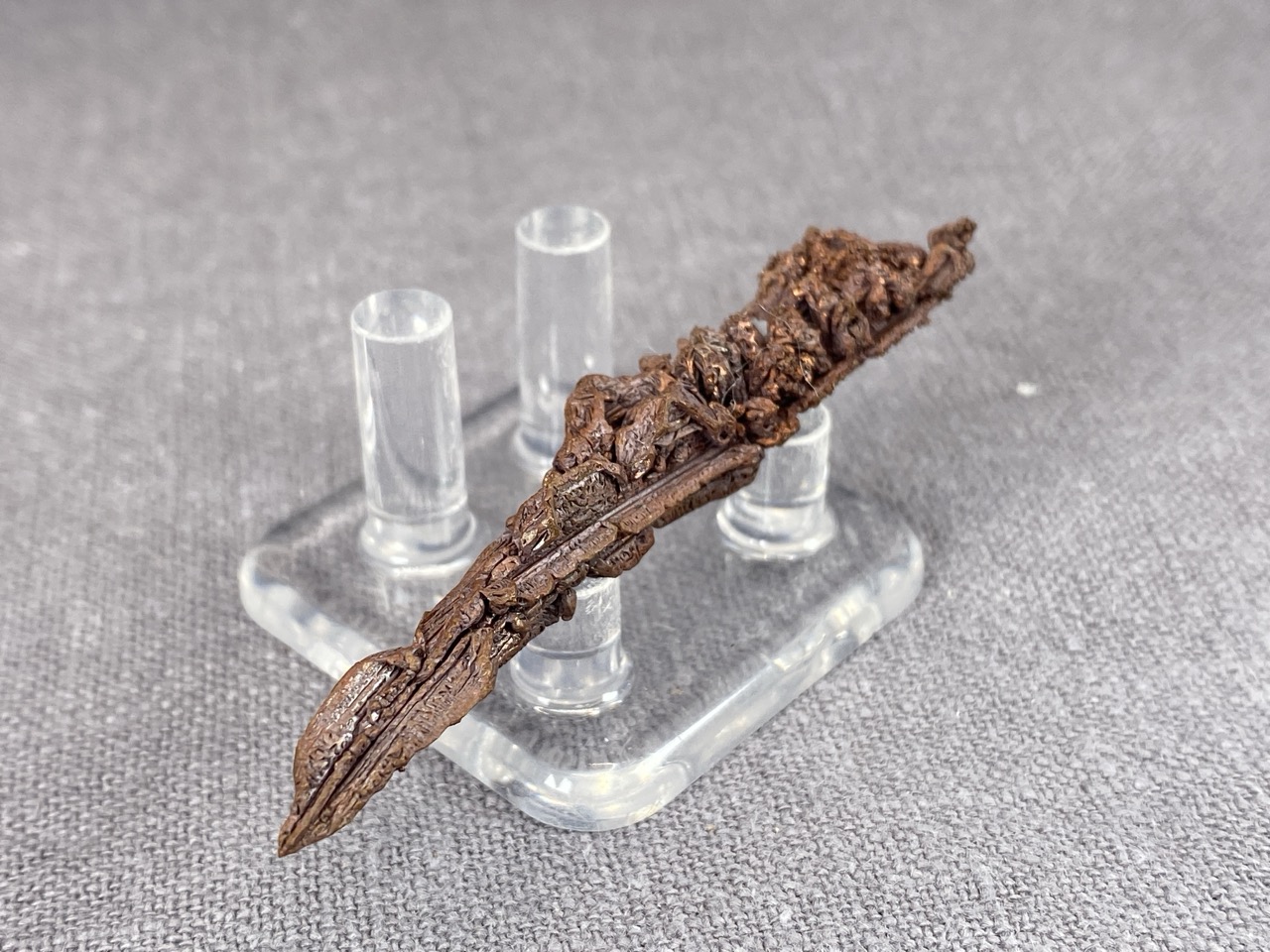 Pozoruhodný krystal ryzí mědi z dolu Itauz v kazašském Džezkazganu. Jedná se o typický dvojčatný srůst podobný světoznámým vzorkům z arizonské lokality Bisbee. Kdysi hojně se vyskytující materiál je dnes stále vzácnější, poslední nález sběratelsky atraktivních vzorků na této lokalitě je datován roku 2014. Při bližším pohledu vzorek svými detaily pozorovatele zcela okouzlí.