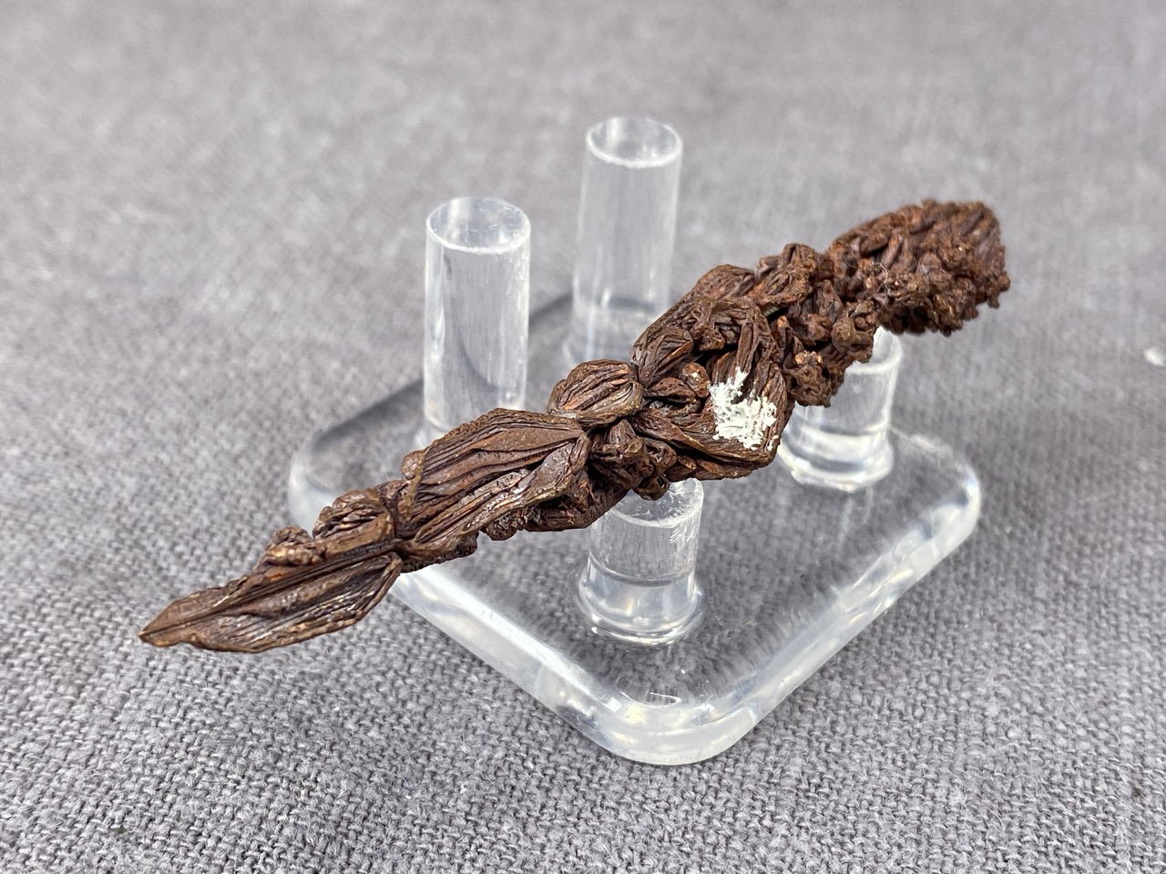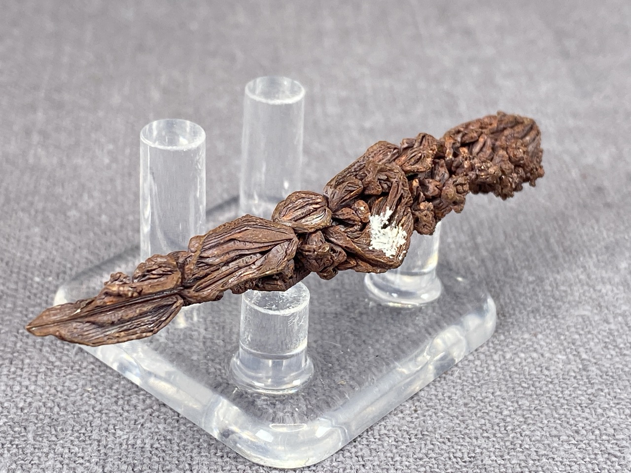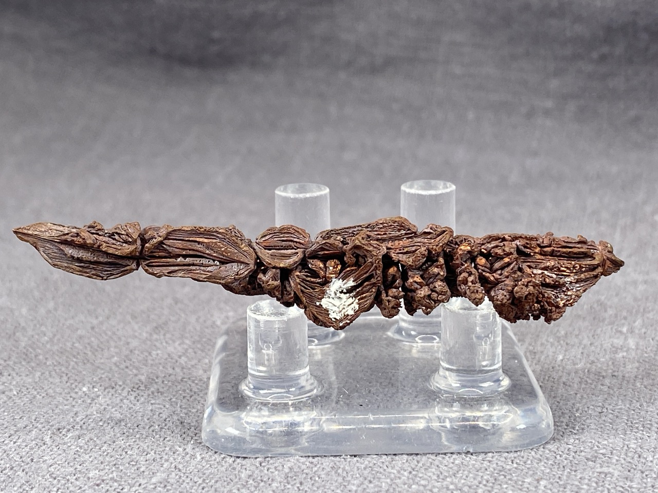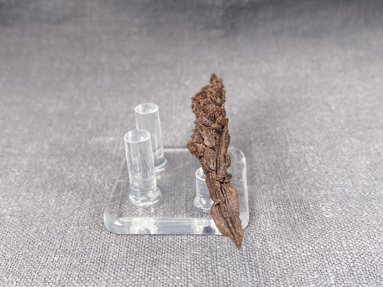 Pozoruhodný krystal ryzí mědi z dolu Itauz v kazašském Džezkazganu. Jedná se o typický dvojčatný srůst podobný světoznámým vzorkům z arizonské lokality Bisbee. Kdysi hojně se vyskytující materiál je dnes stále vzácnější, poslední nález sběratelsky atraktivních vzorků na této lokalitě je datován roku 2014. Při bližším pohledu vzorek svými detaily pozorovatele zcela okouzlí.