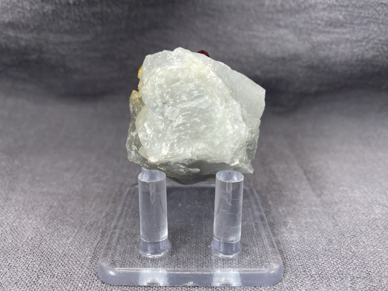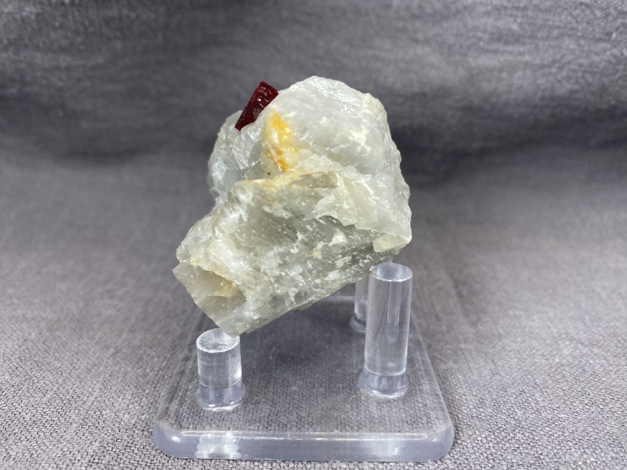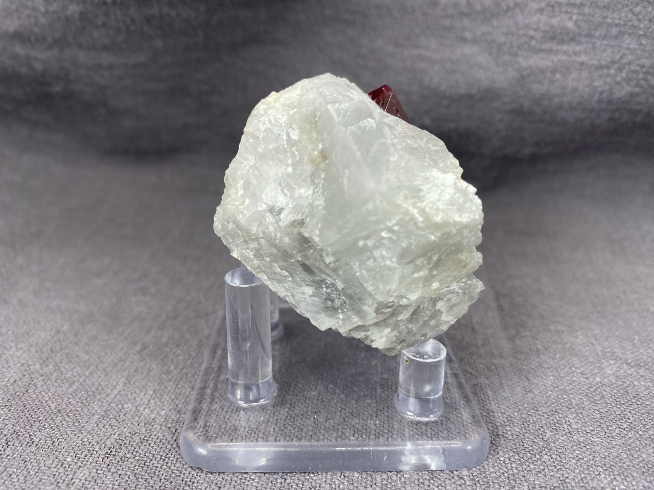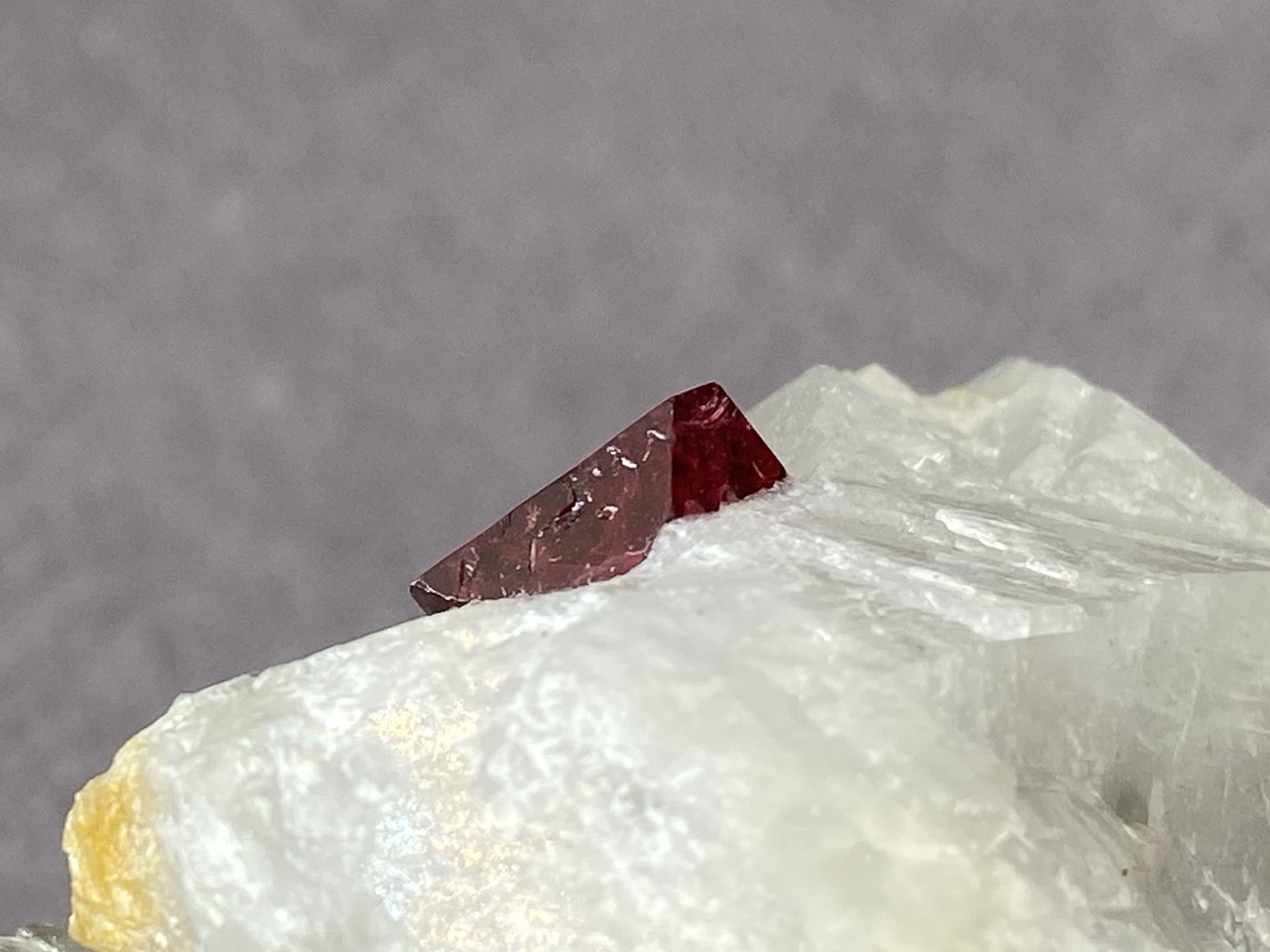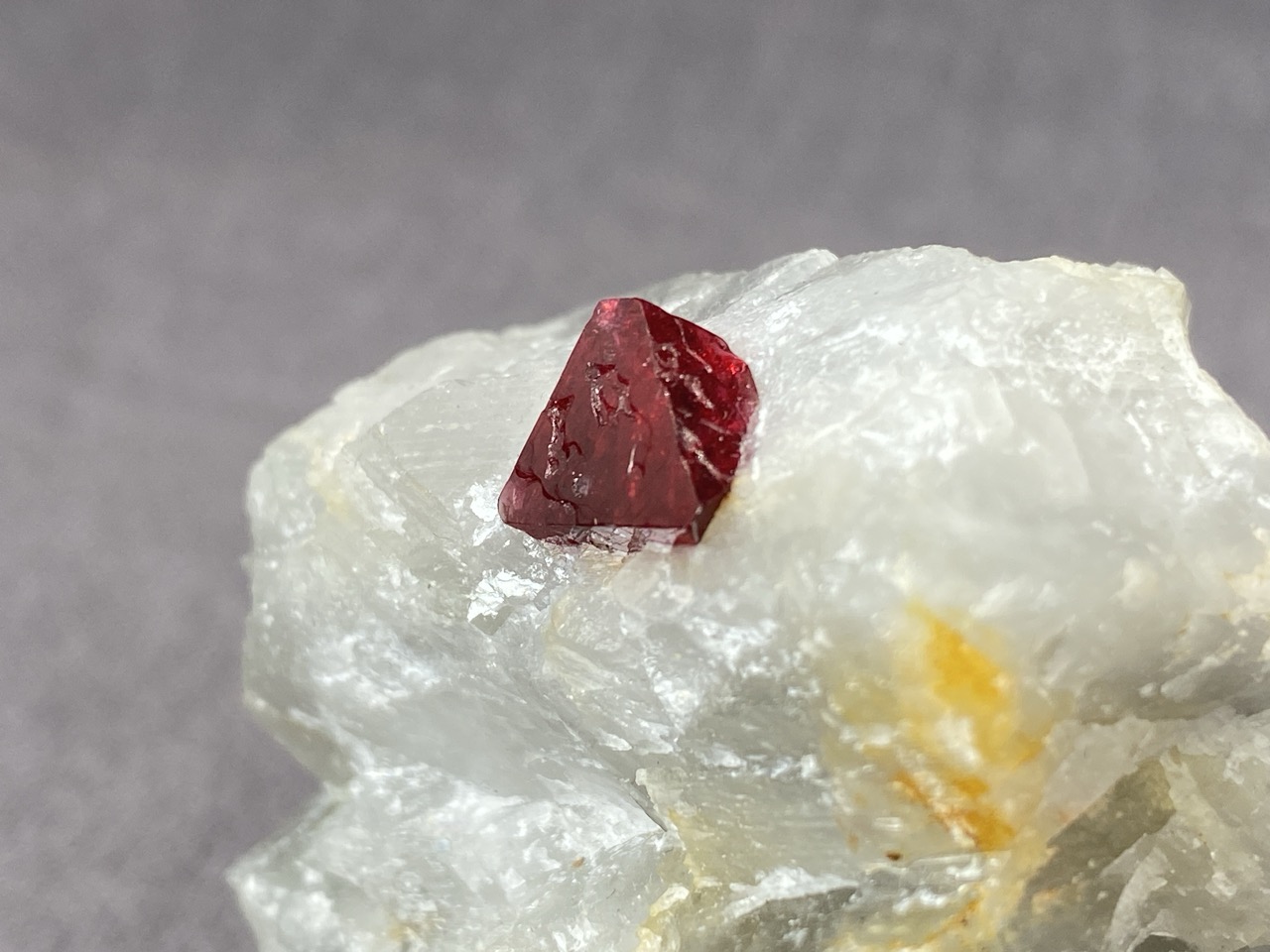 Klasická ukázka spinelu ze světoznámé lokality Mogok v Barmě. Sytě červeně zbarvený osmistěn s vysokým leskem na typické podložce tvořené bílým mramorem.