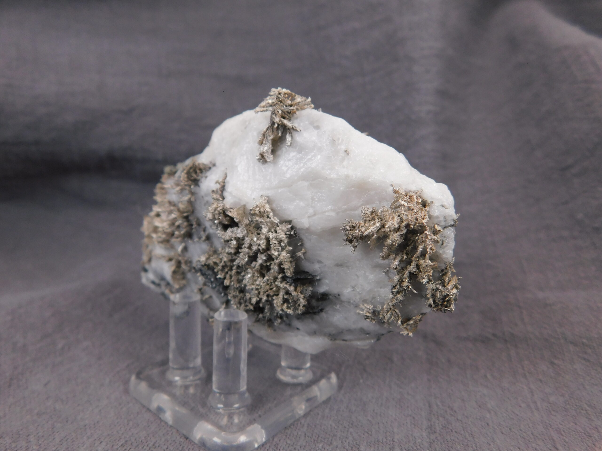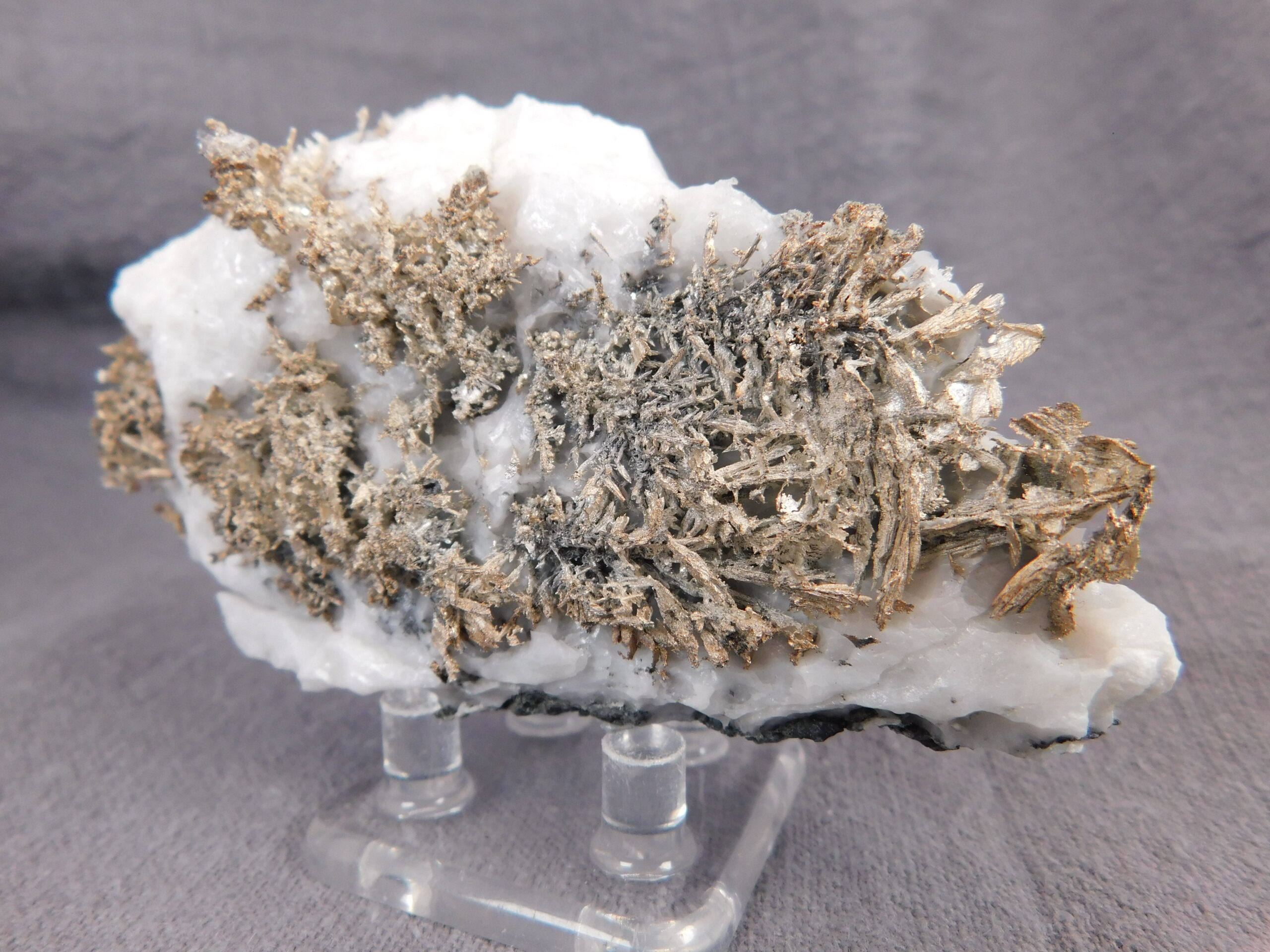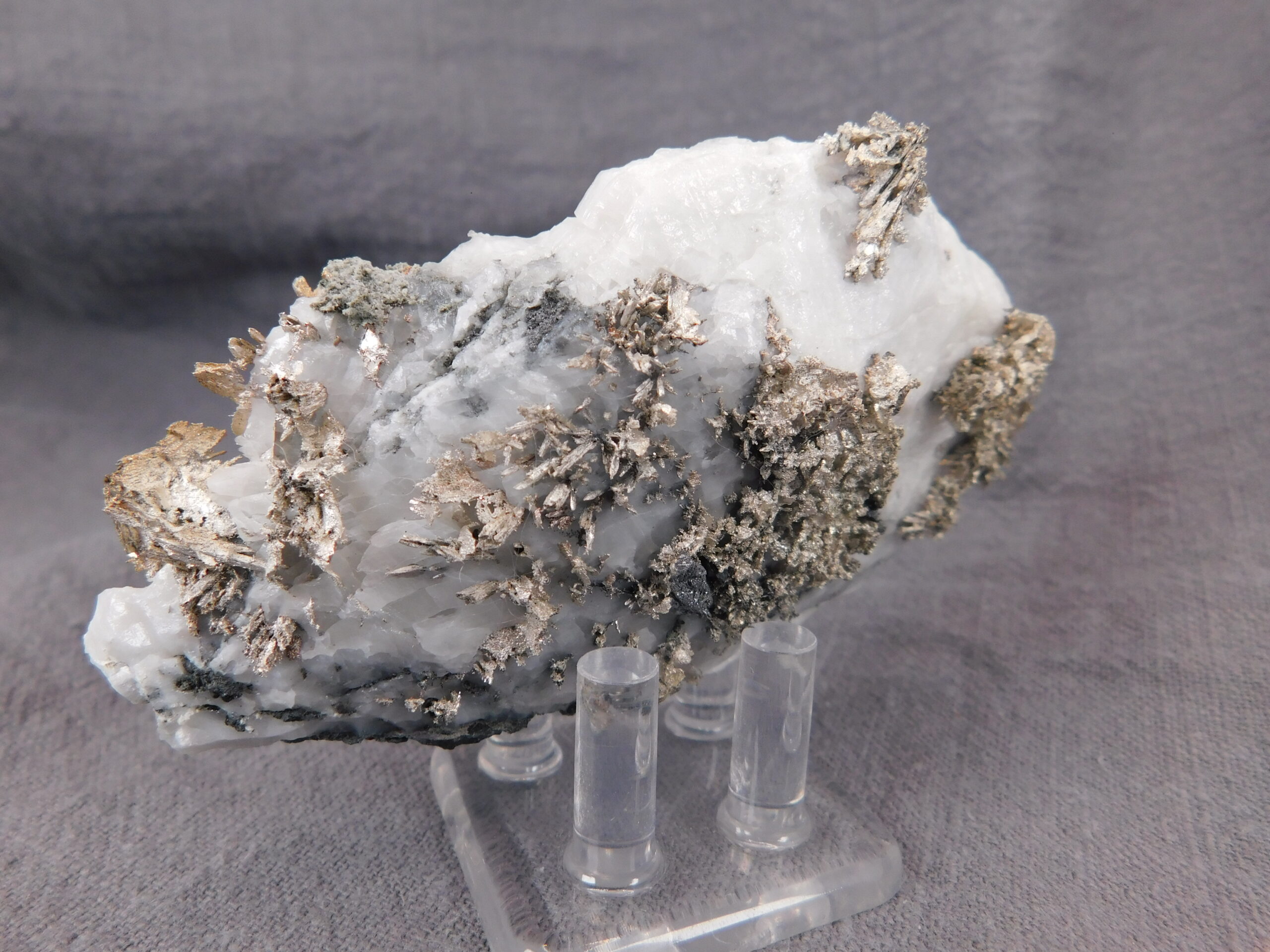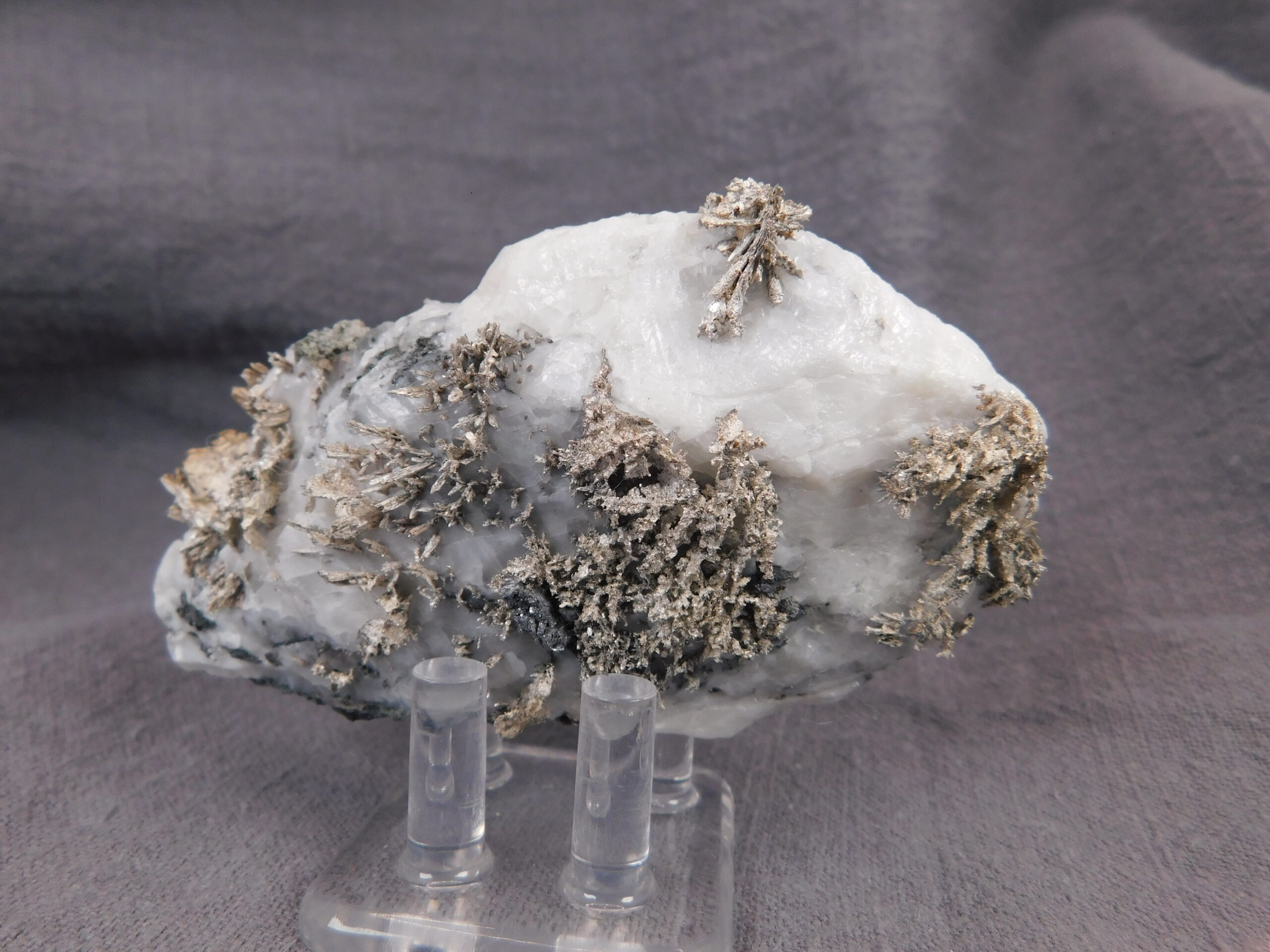 Vzorek krystalovaného ryzího stříbra v bílém kalcitu z marocké lokality Bou Azzer. Nádherně vyvinuté protažené krystaly stříbra byly z kalcitu velmi citlivě vyleptány a na bílém pozadí se působivě vyjímají. Jedná se o vysoce spektakulární ukázku přírodního vývinu tohoto drahého kovu, který potěší každého milovníka stříbronosných minerálů.