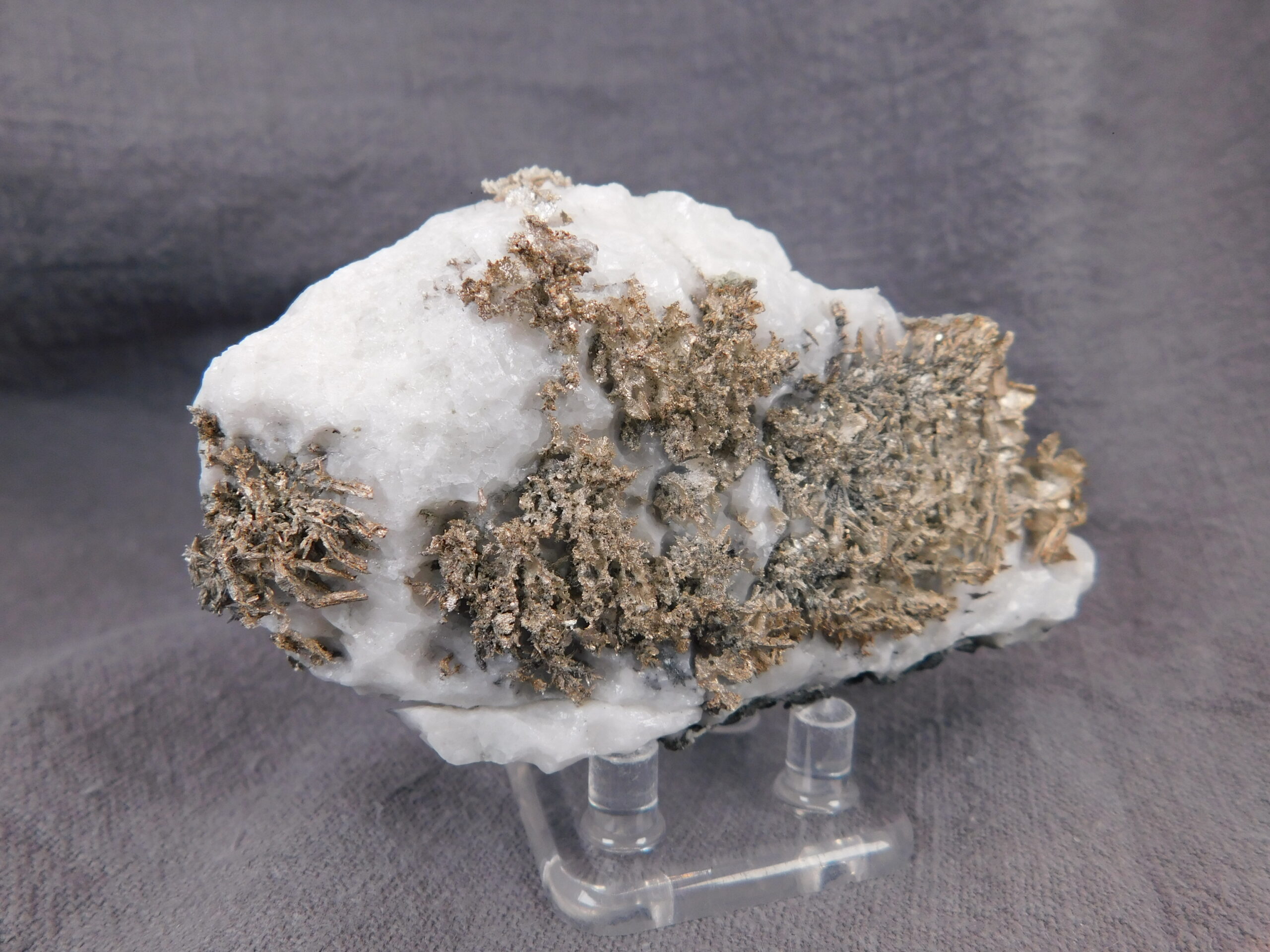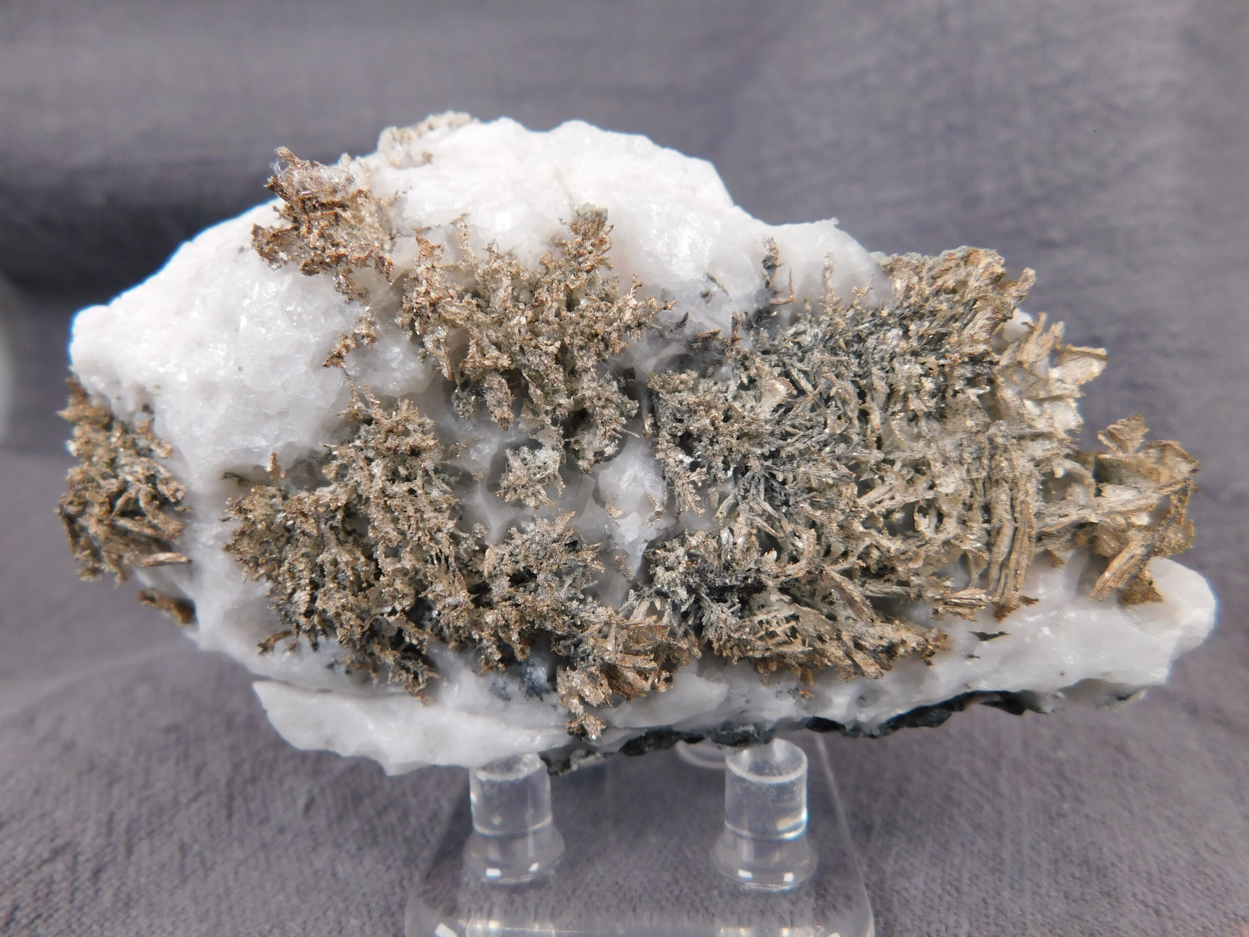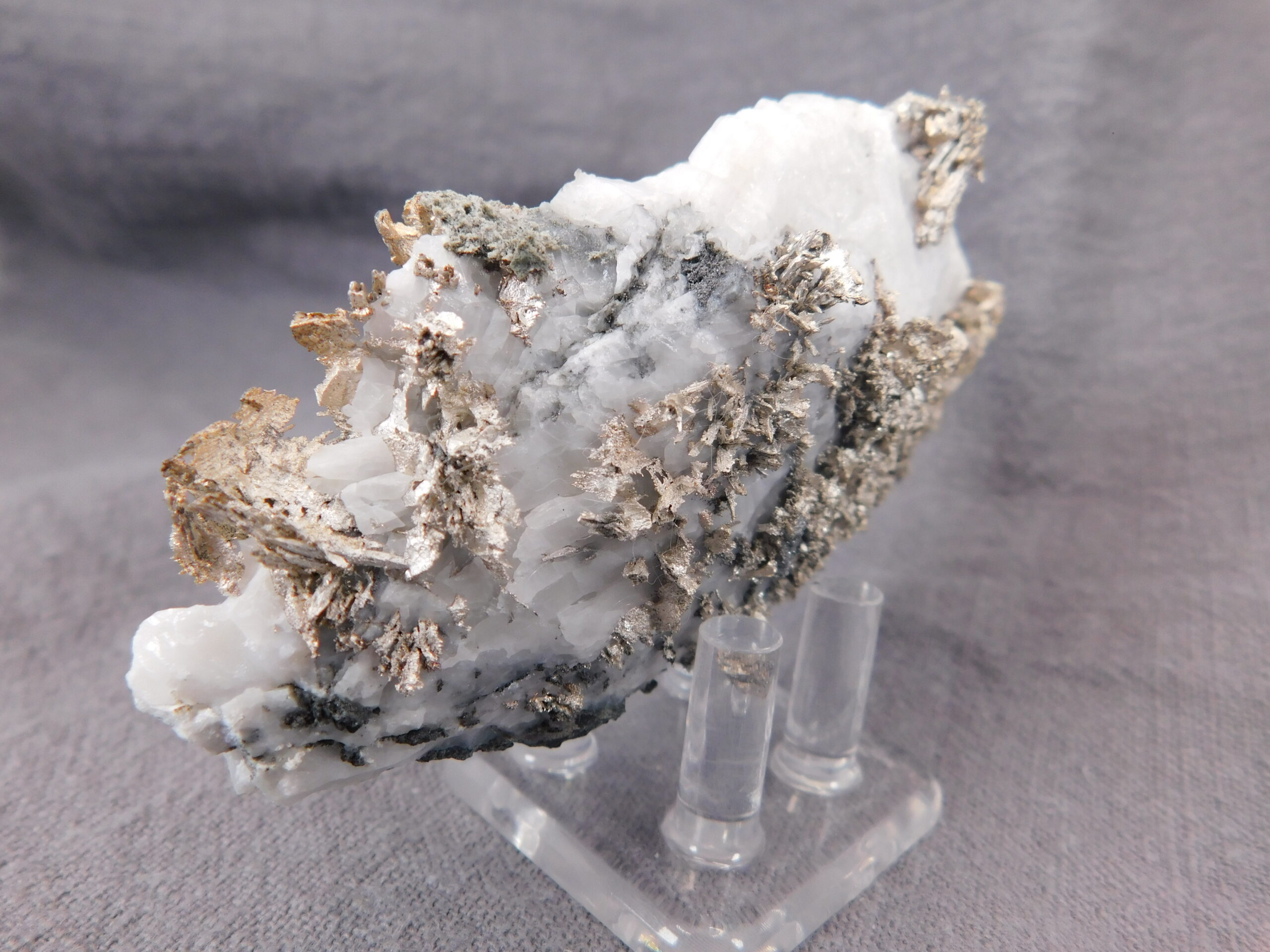 Vzorek krystalovaného ryzího stříbra v bílém kalcitu z marocké lokality Bou Azzer. Nádherně vyvinuté protažené krystaly stříbra byly z kalcitu velmi citlivě vyleptány a na bílém pozadí se působivě vyjímají. Jedná se o vysoce spektakulární ukázku přírodního vývinu tohoto drahého kovu, který potěší každého milovníka stříbronosných minerálů.