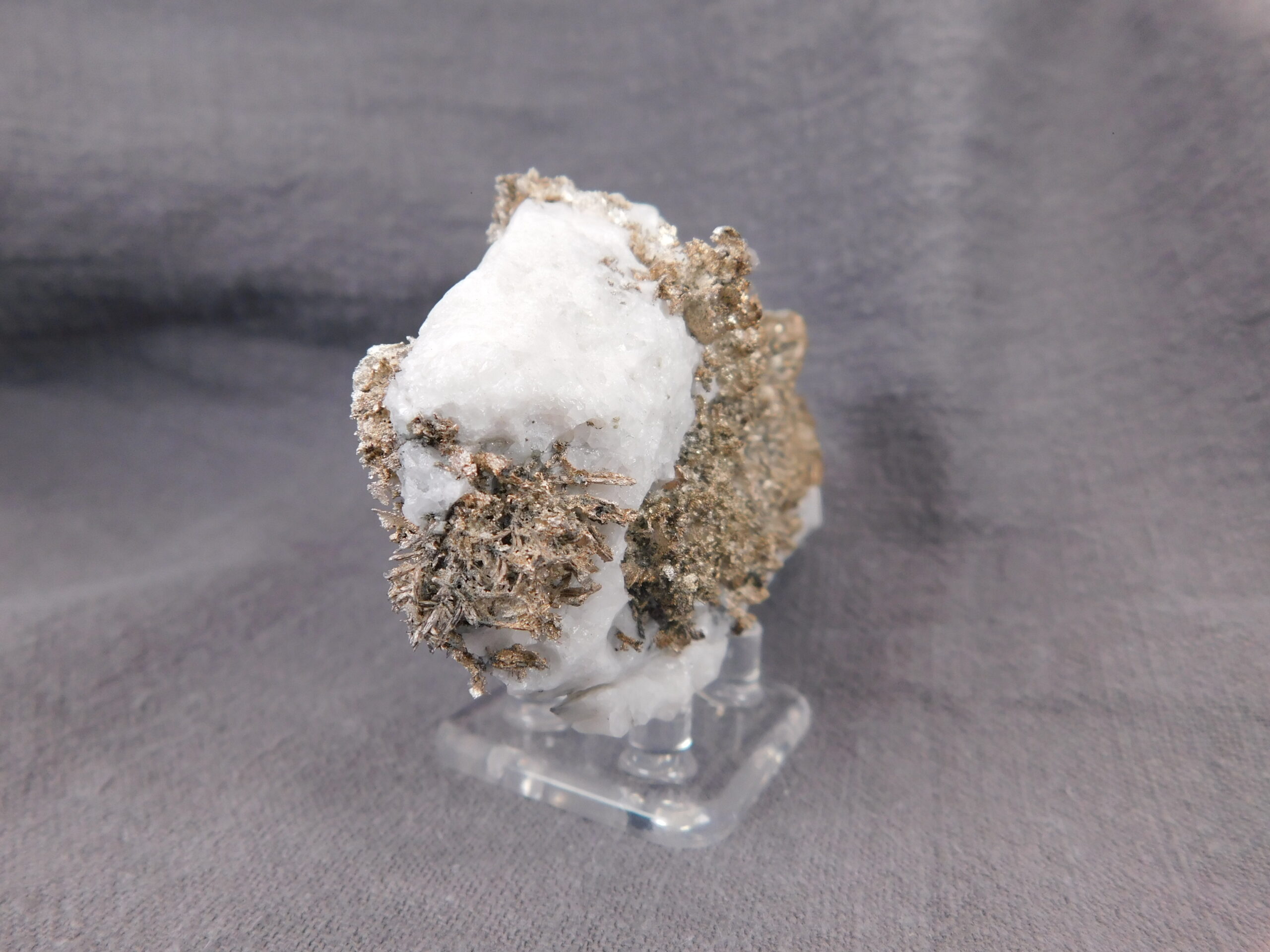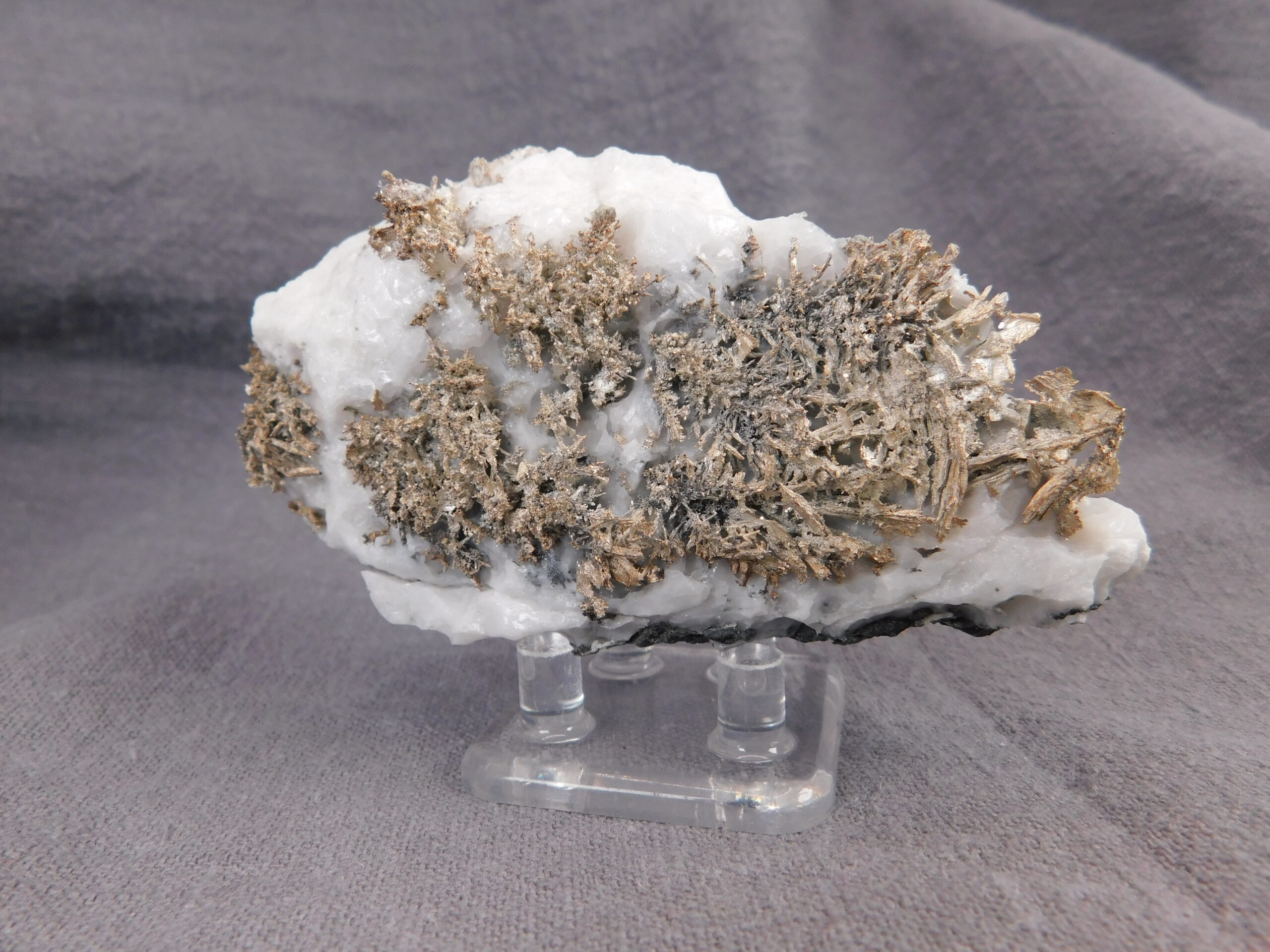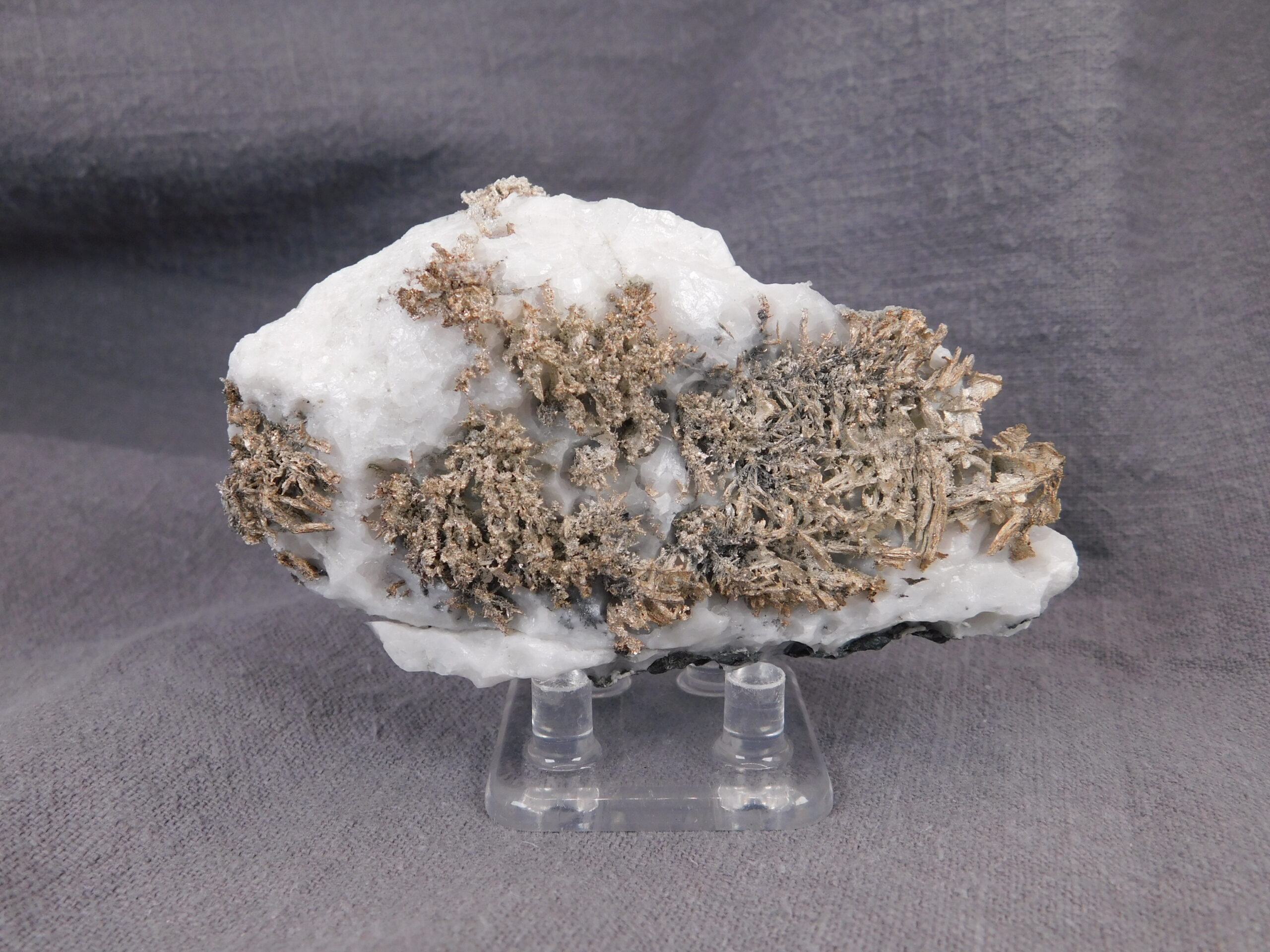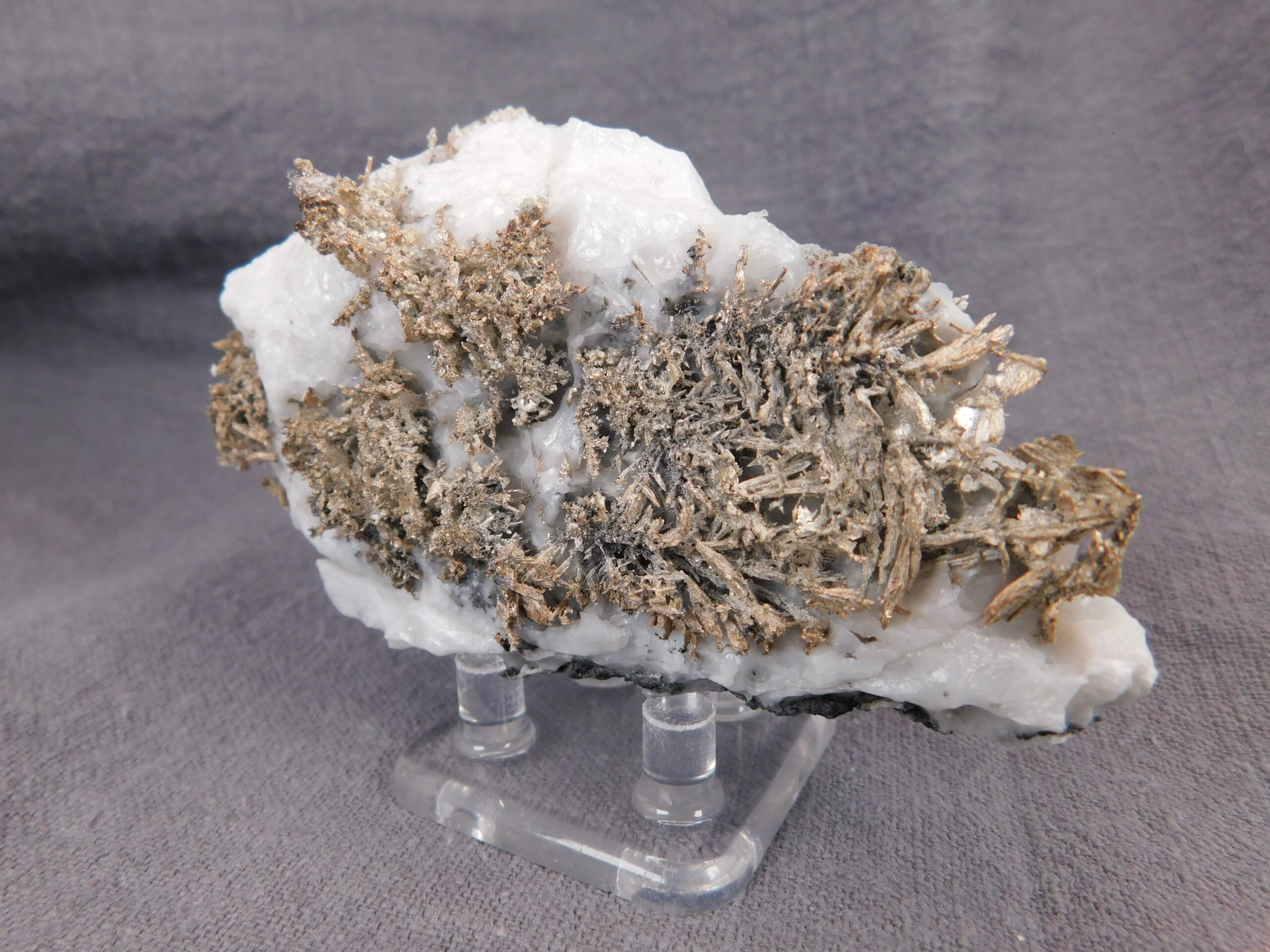 Vzorek krystalovaného ryzího stříbra v bílém kalcitu z marocké lokality Bou Azzer. Nádherně vyvinuté protažené krystaly stříbra byly z kalcitu velmi citlivě vyleptány a na bílém pozadí se působivě vyjímají. Jedná se o vysoce spektakulární ukázku přírodního vývinu tohoto drahého kovu, který potěší každého milovníka stříbronosných minerálů.