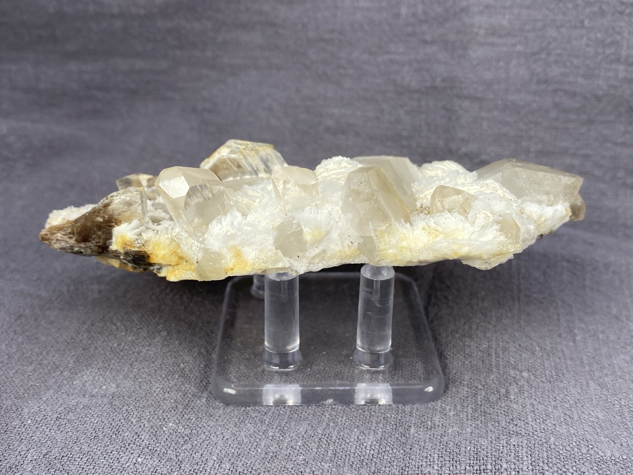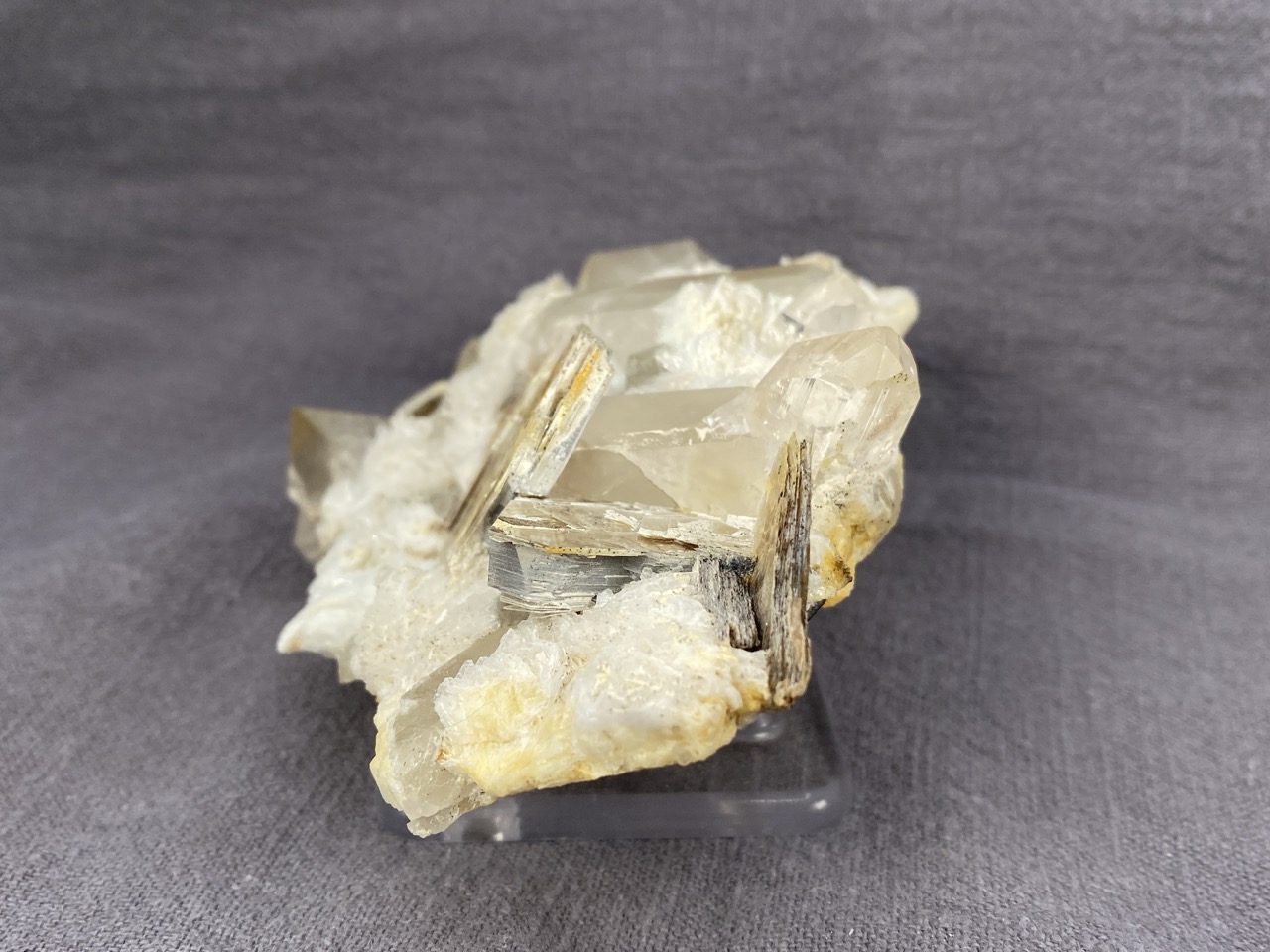Typická ukázka topazu z proslavených pegmatitových žil z Pantaw nedaleko Mogoku. Lesklé krystaly topazu v bohaté asociaci s biotitem, křemenem a albitem.