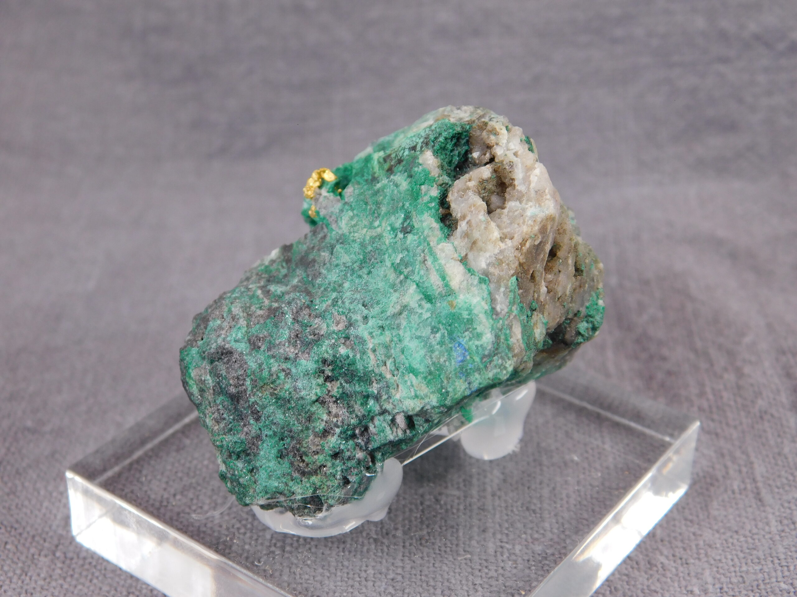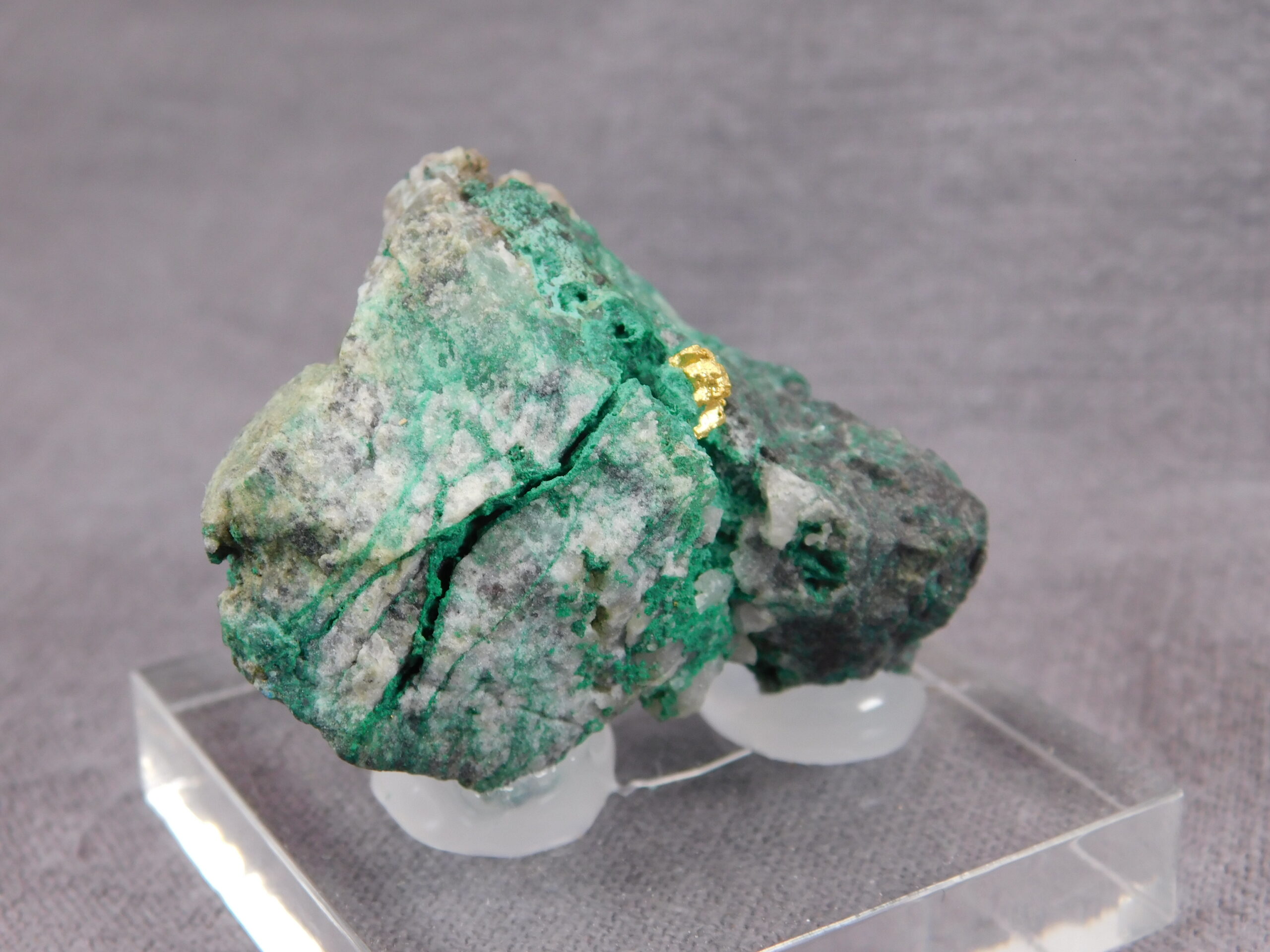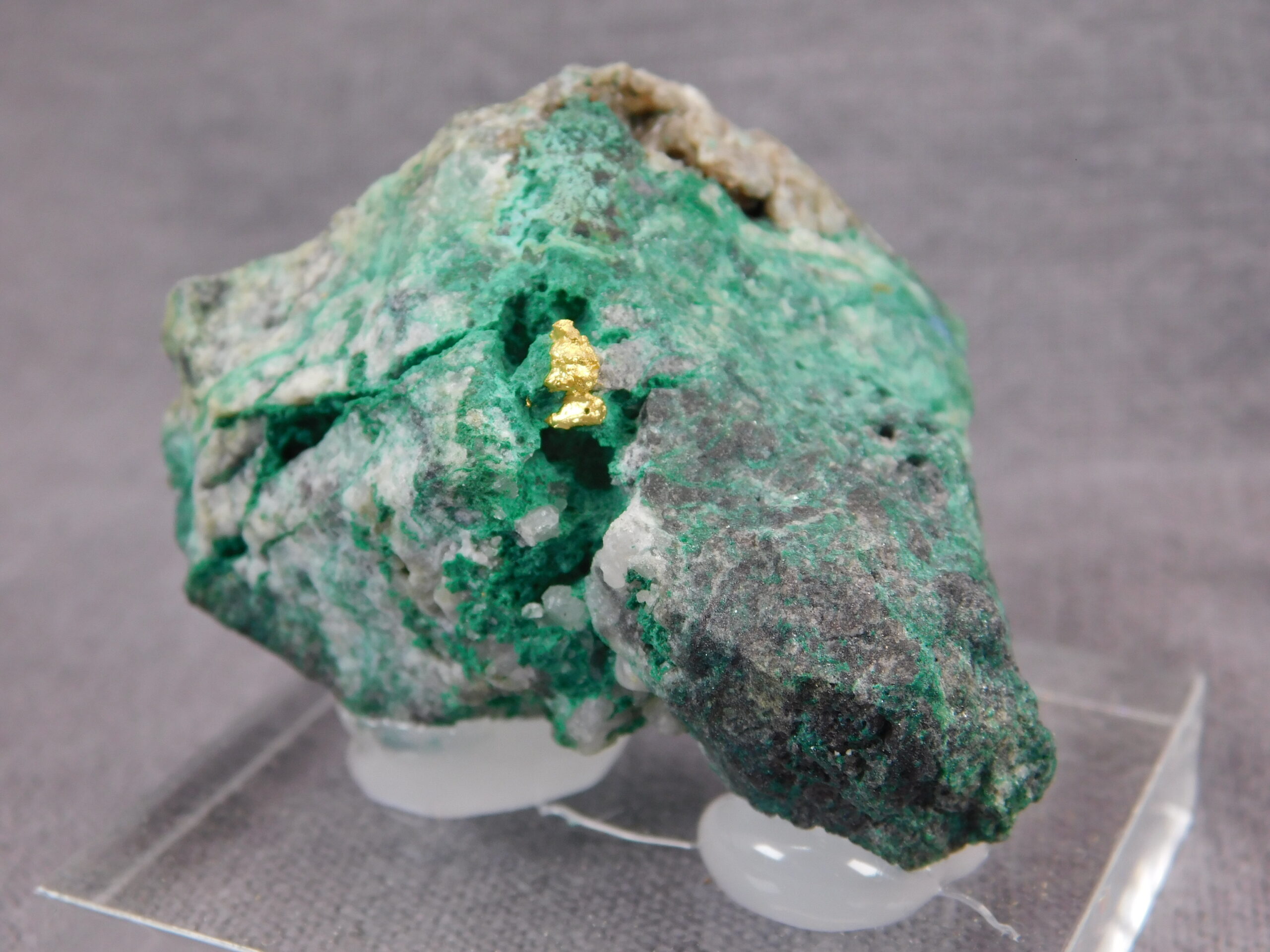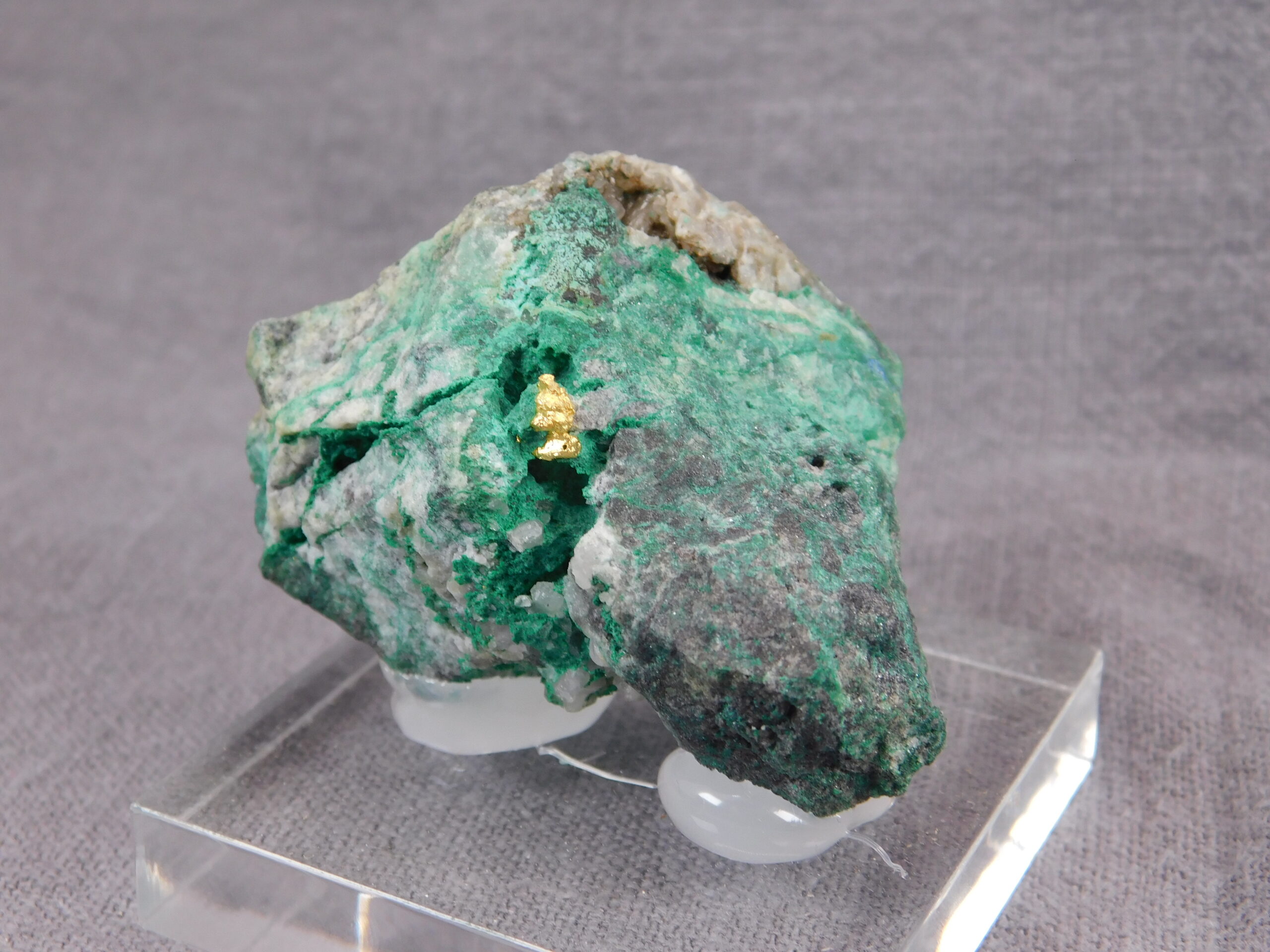 Ačkoli o mineralogické vzorky zlata rozhodně není na trhu nouze, tento vzorek nabízí díky své barevné kombinaci něco mimořádného. Keříčkovité agregáty zlata narůstají na zelené podložce prosycené malachitem a vytvářejí tak mimořádně atraktivní vzorek. Ukázka byla nalezena během našeho projektu zaměřeného na těžbu mědi v namibijské provincii Kunene. Vytěžené vzorky díky své estetické výjimečnosti vzbudily mimořádný ohlas sběratelské obce a již po několik let patří k bestsellerům firmy KARP.