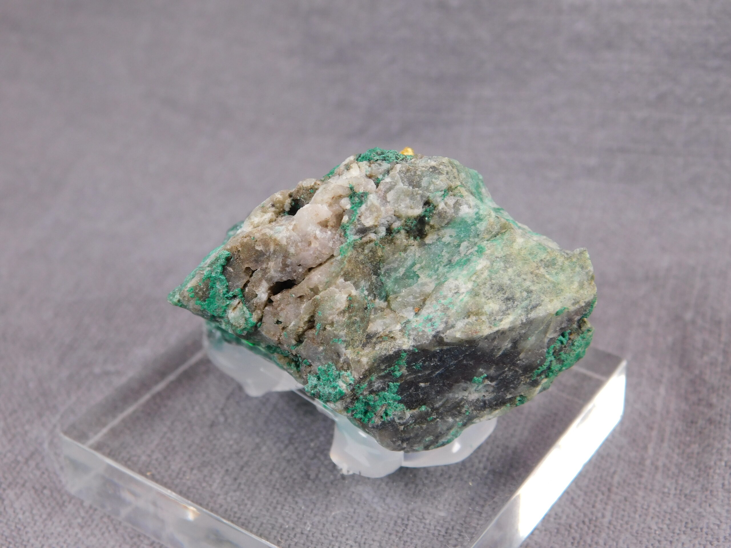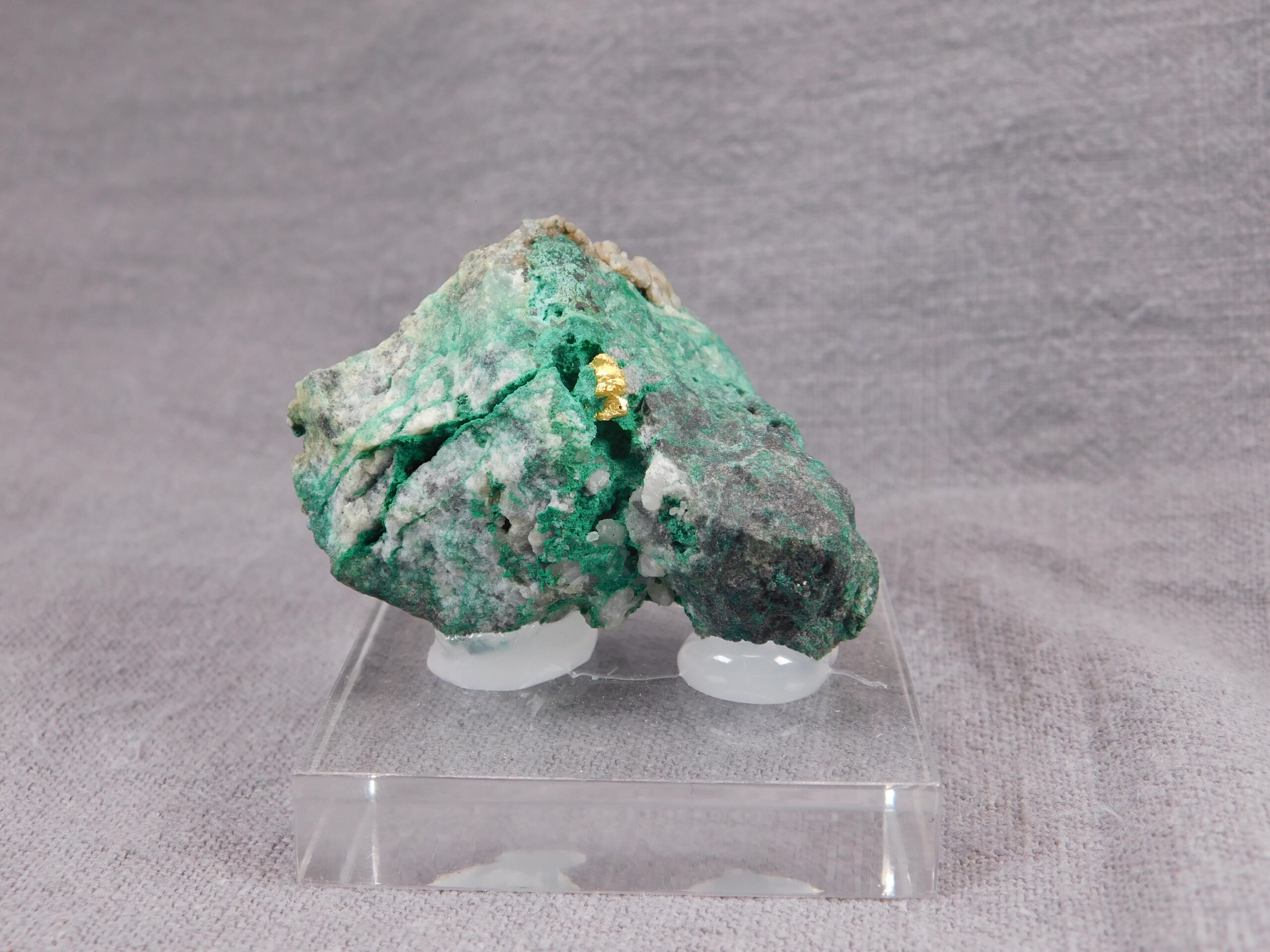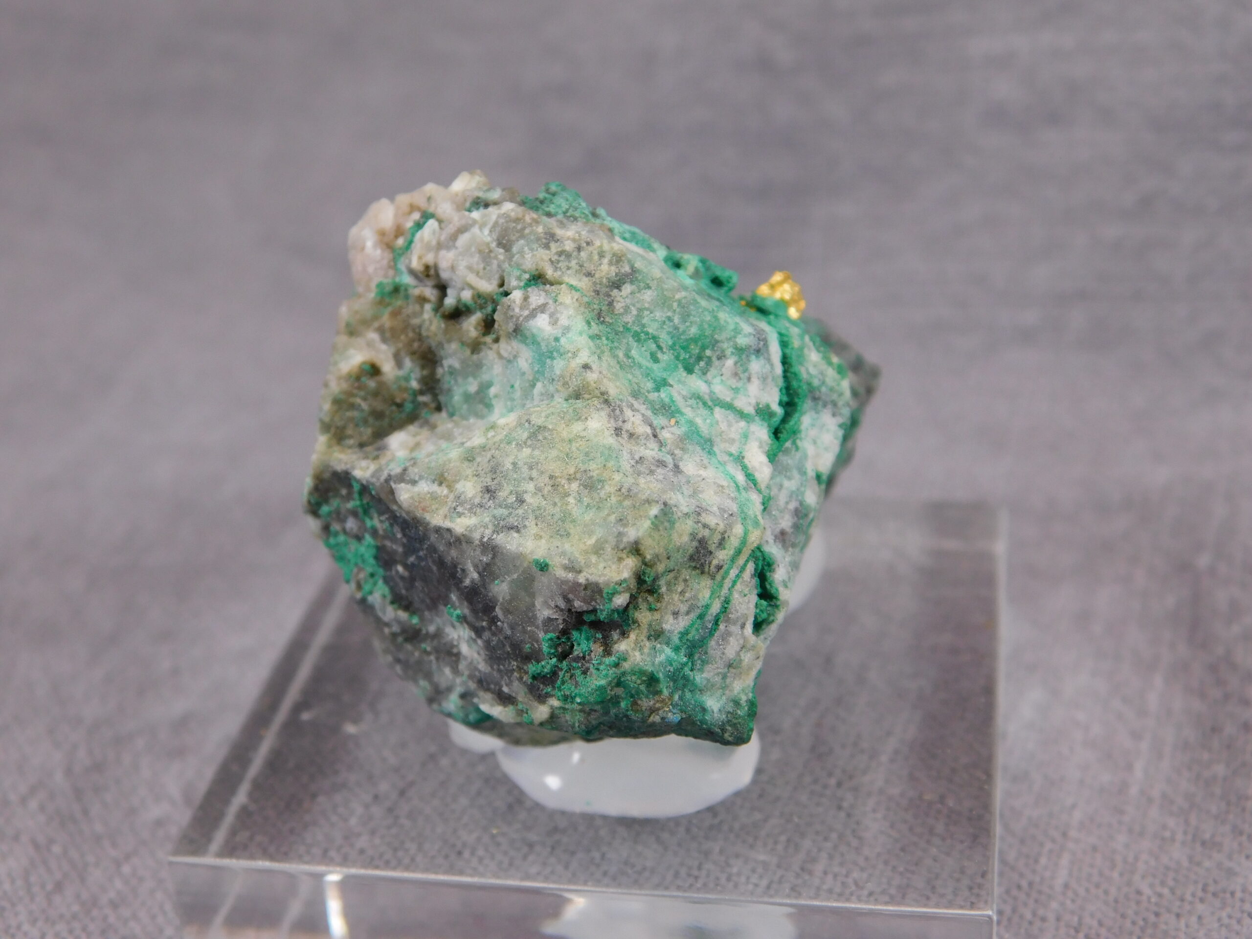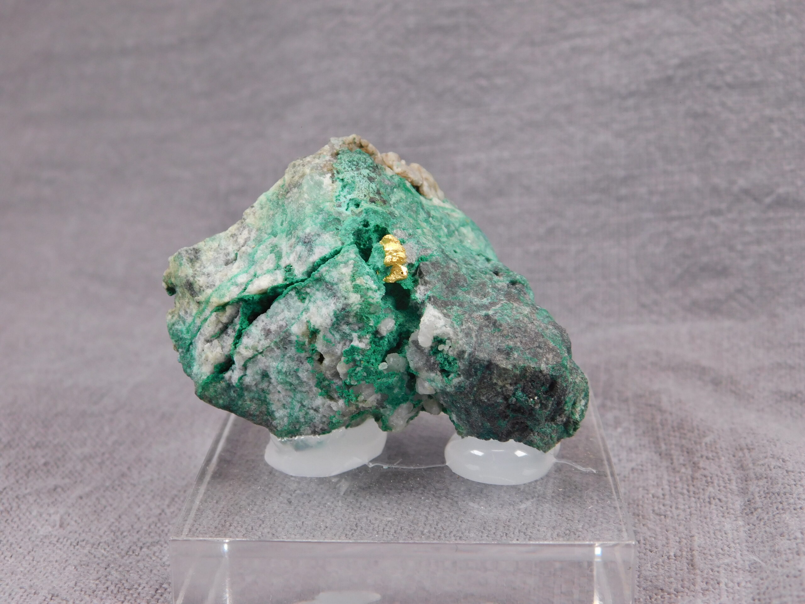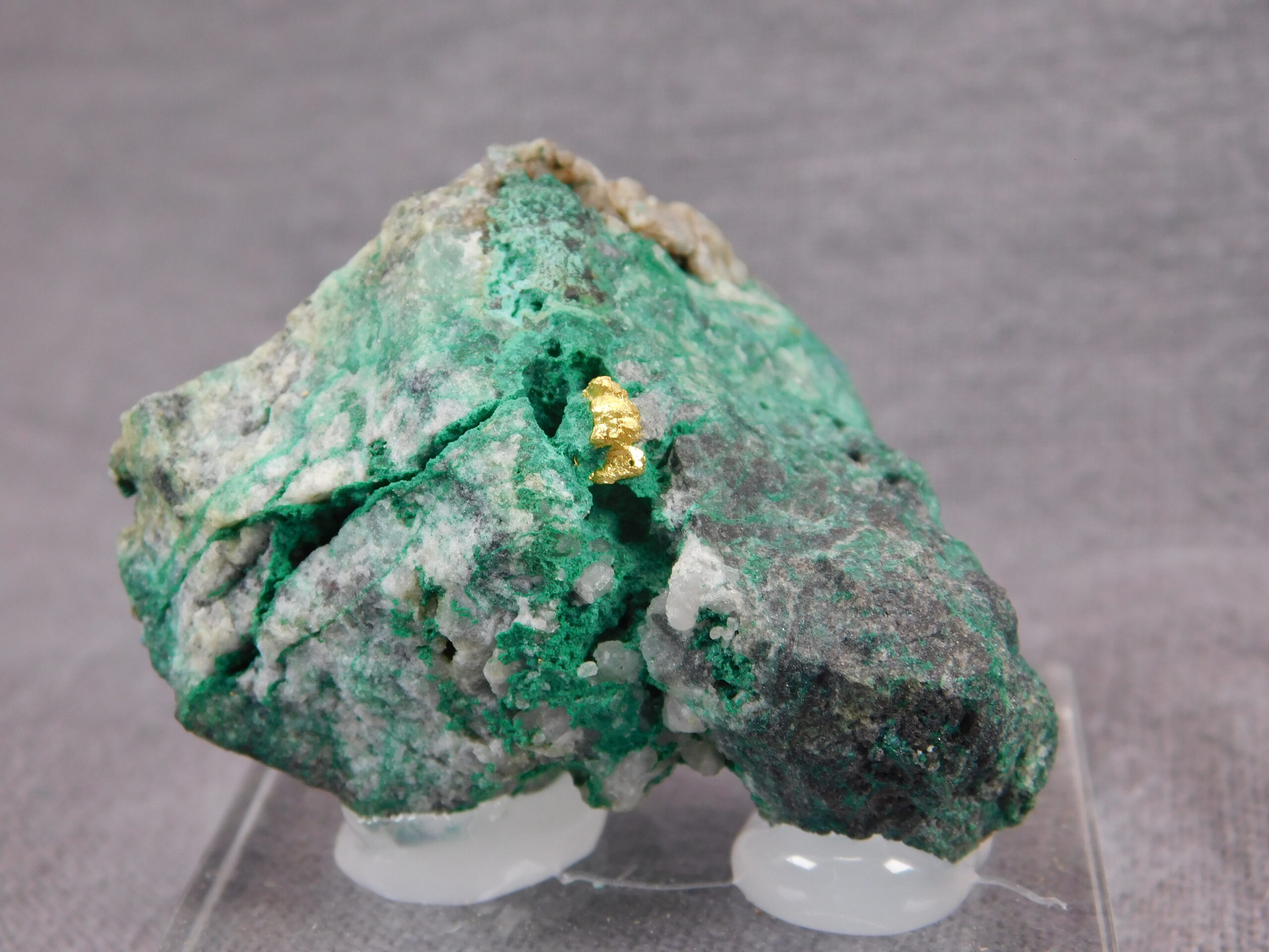 Ačkoli o mineralogické vzorky zlata rozhodně není na trhu nouze, tento vzorek nabízí díky své barevné kombinaci něco mimořádného. Keříčkovité agregáty zlata narůstají na zelené podložce prosycené malachitem a vytvářejí tak mimořádně atraktivní vzorek. Ukázka byla nalezena během našeho projektu zaměřeného na těžbu mědi v namibijské provincii Kunene. Vytěžené vzorky díky své estetické výjimečnosti vzbudily mimořádný ohlas sběratelské obce a již po několik let patří k bestsellerům firmy KARP.