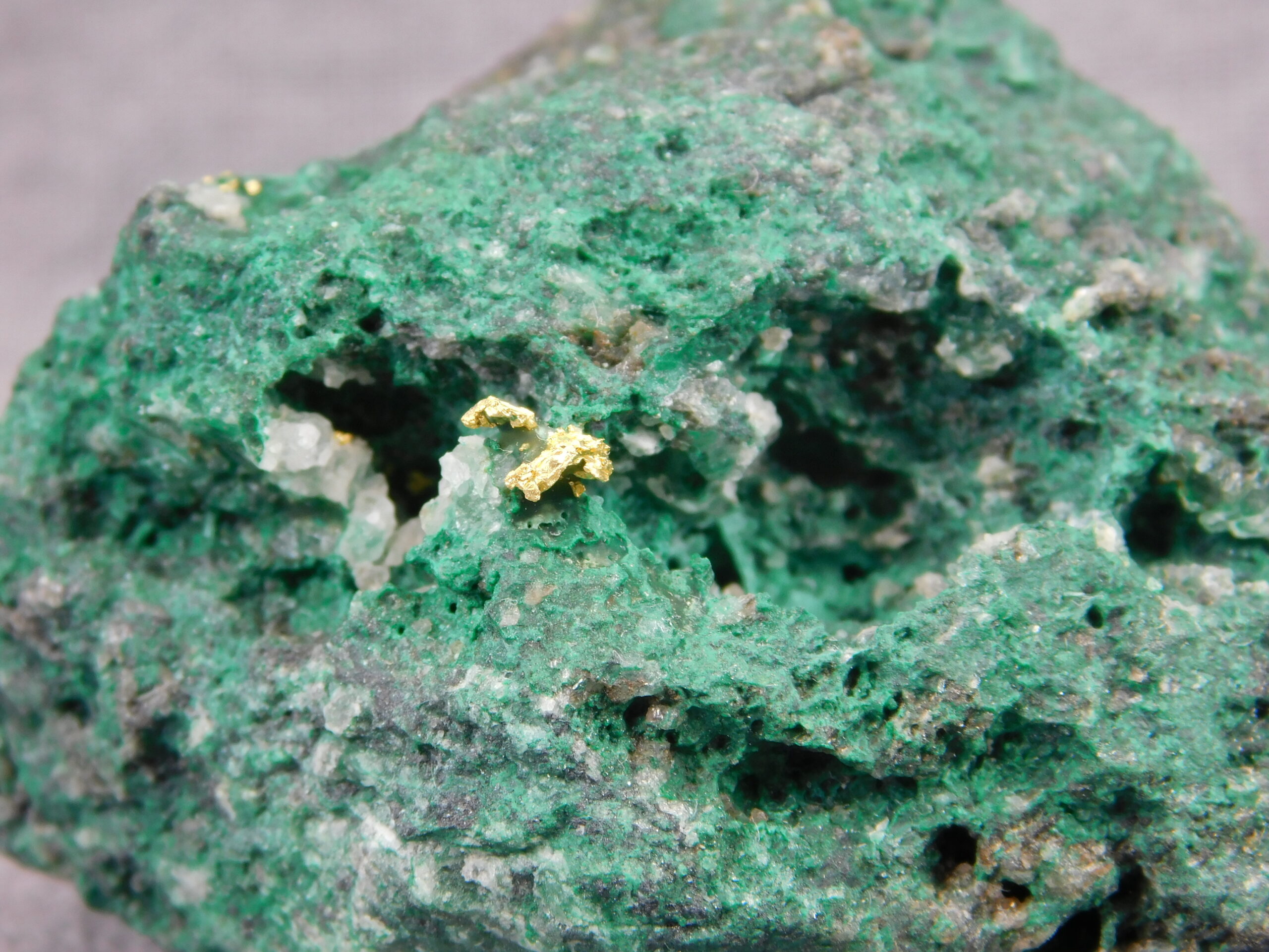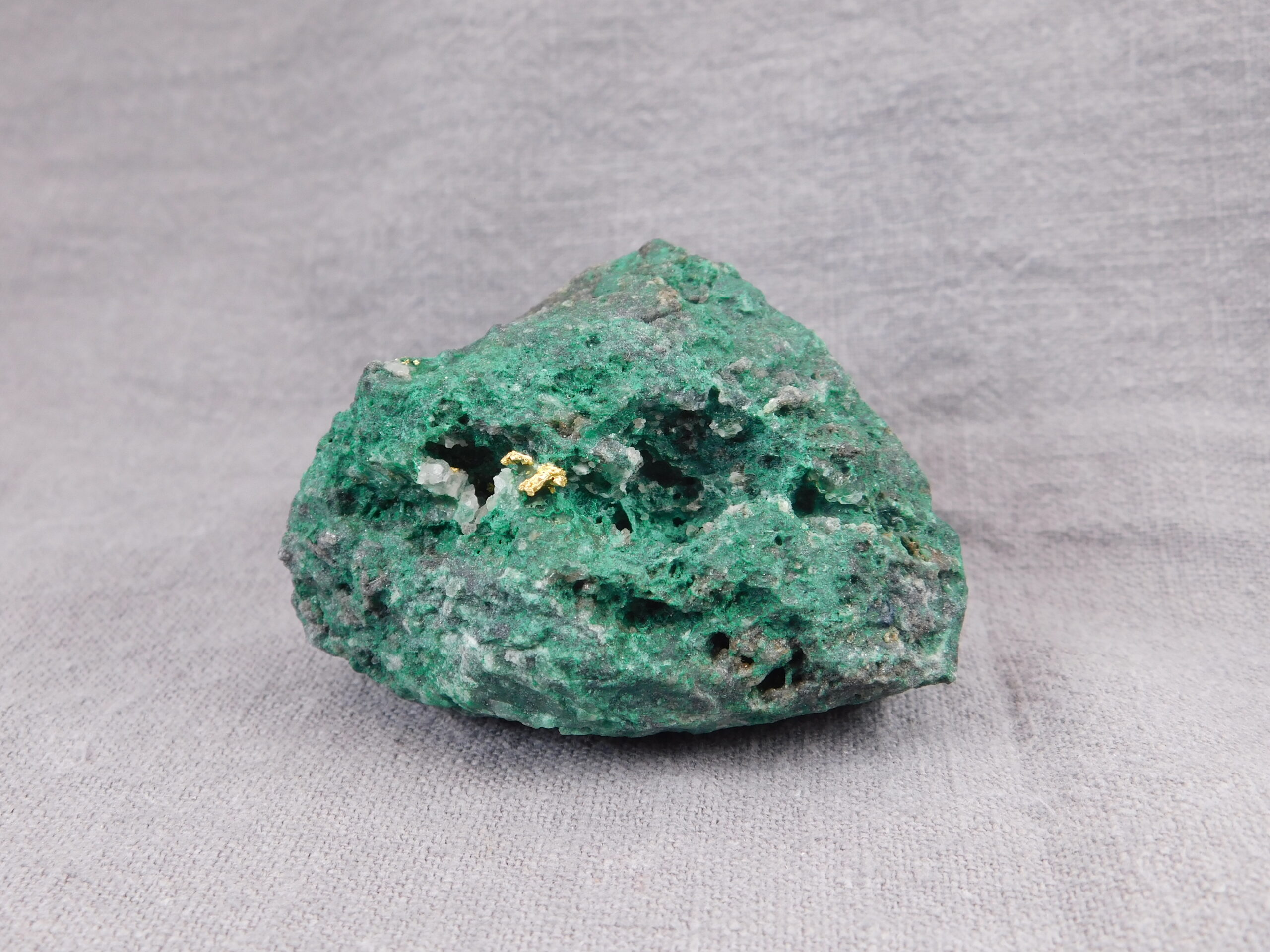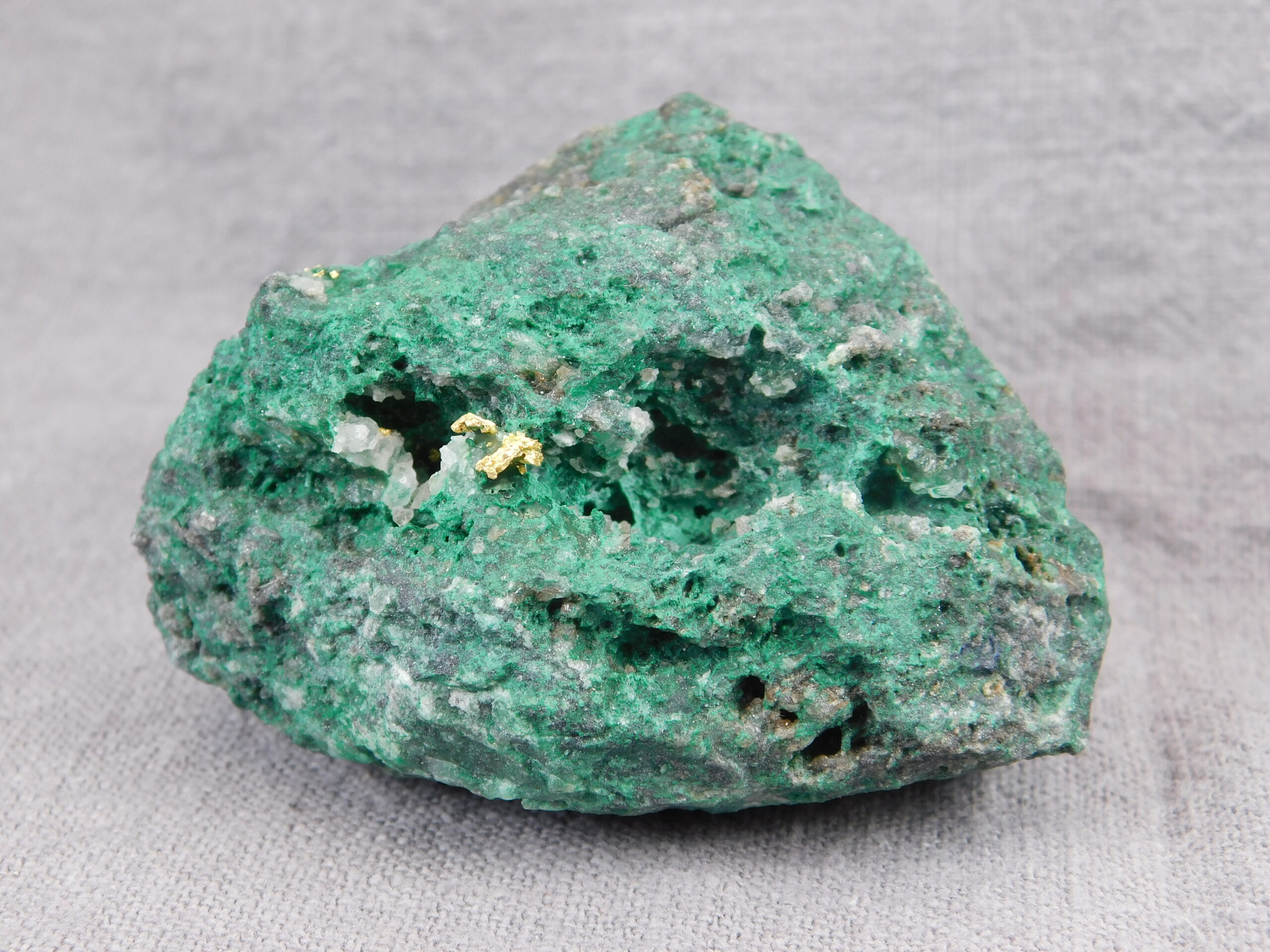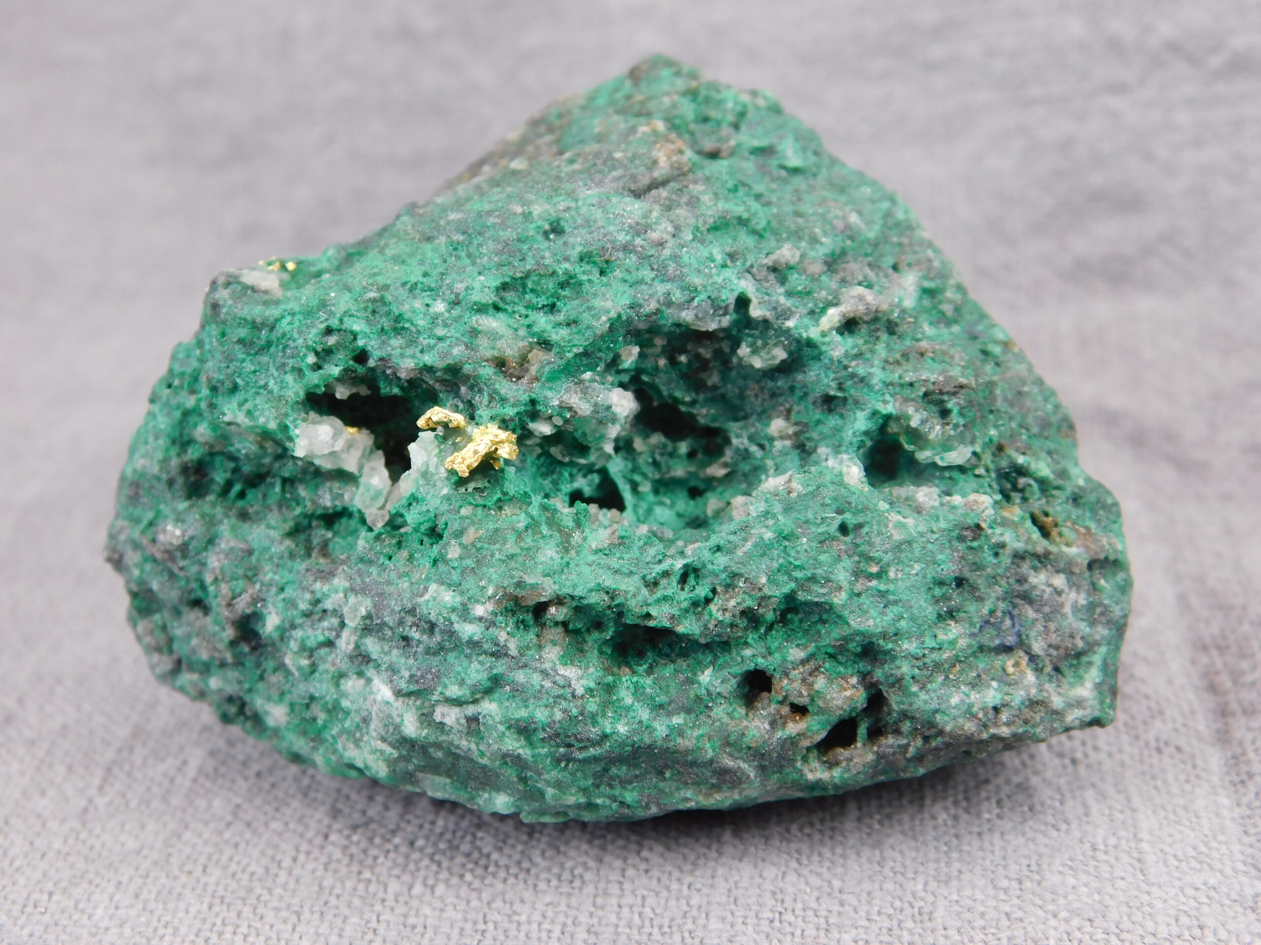 Ačkoli o mineralogické vzorky zlata rozhodně není na trhu nouze, tento vzorek nabízí díky své barevné kombinaci něco mimořádného. Keříčkovité agregáty zlata narůstají na zelené podložce prosycené malachitem a vytvářejí tak mimořádně atraktivní vzorek. Ukázka byla nalezena během našeho projektu zaměřeného na těžbu mědi v namibijské provincii Kunene. Vytěžené vzorky díky své estetické výjimečnosti vzbudily mimořádný ohlas sběratelské obce a již po několik let patří k bestsellerům firmy KARP.