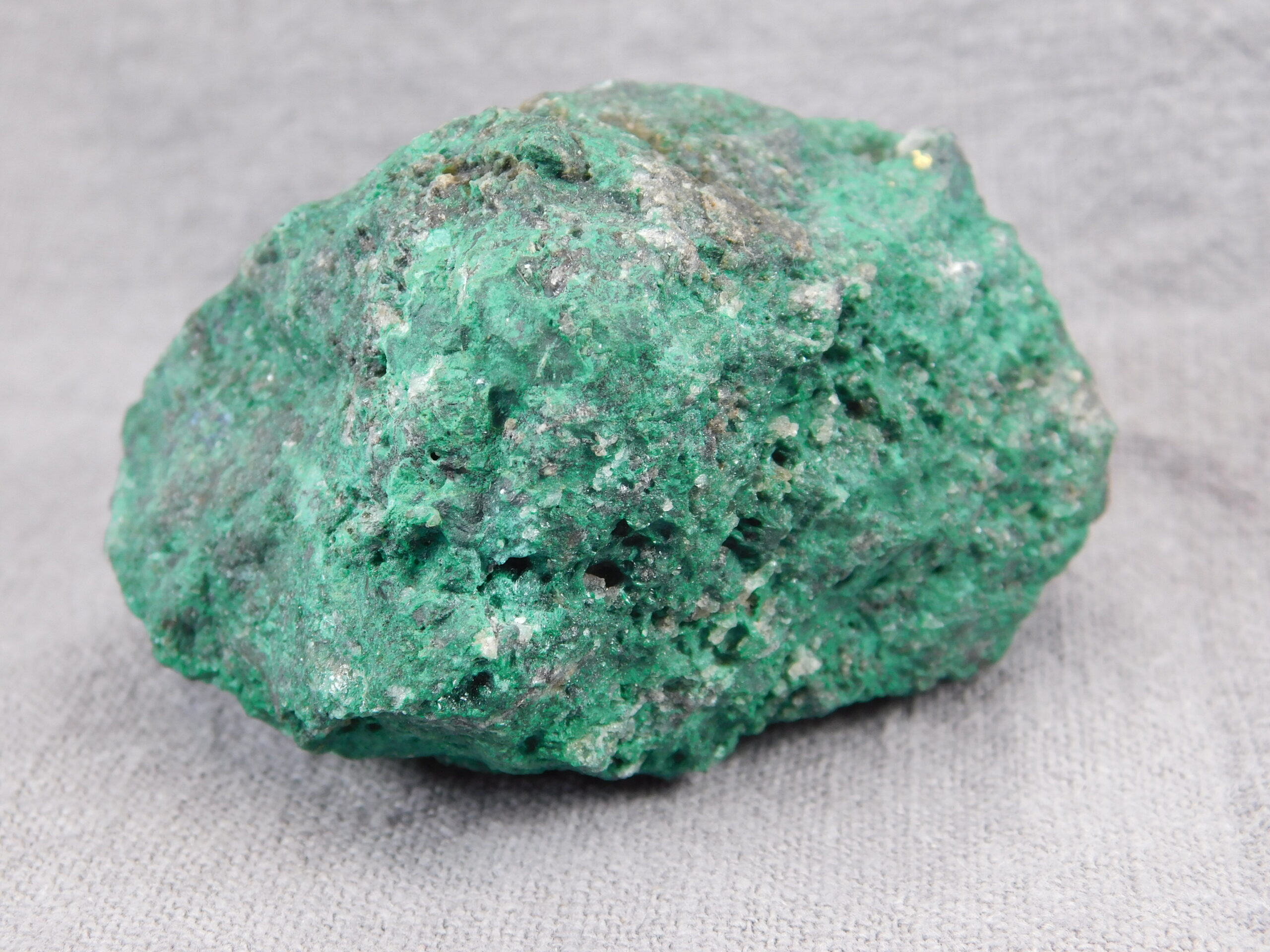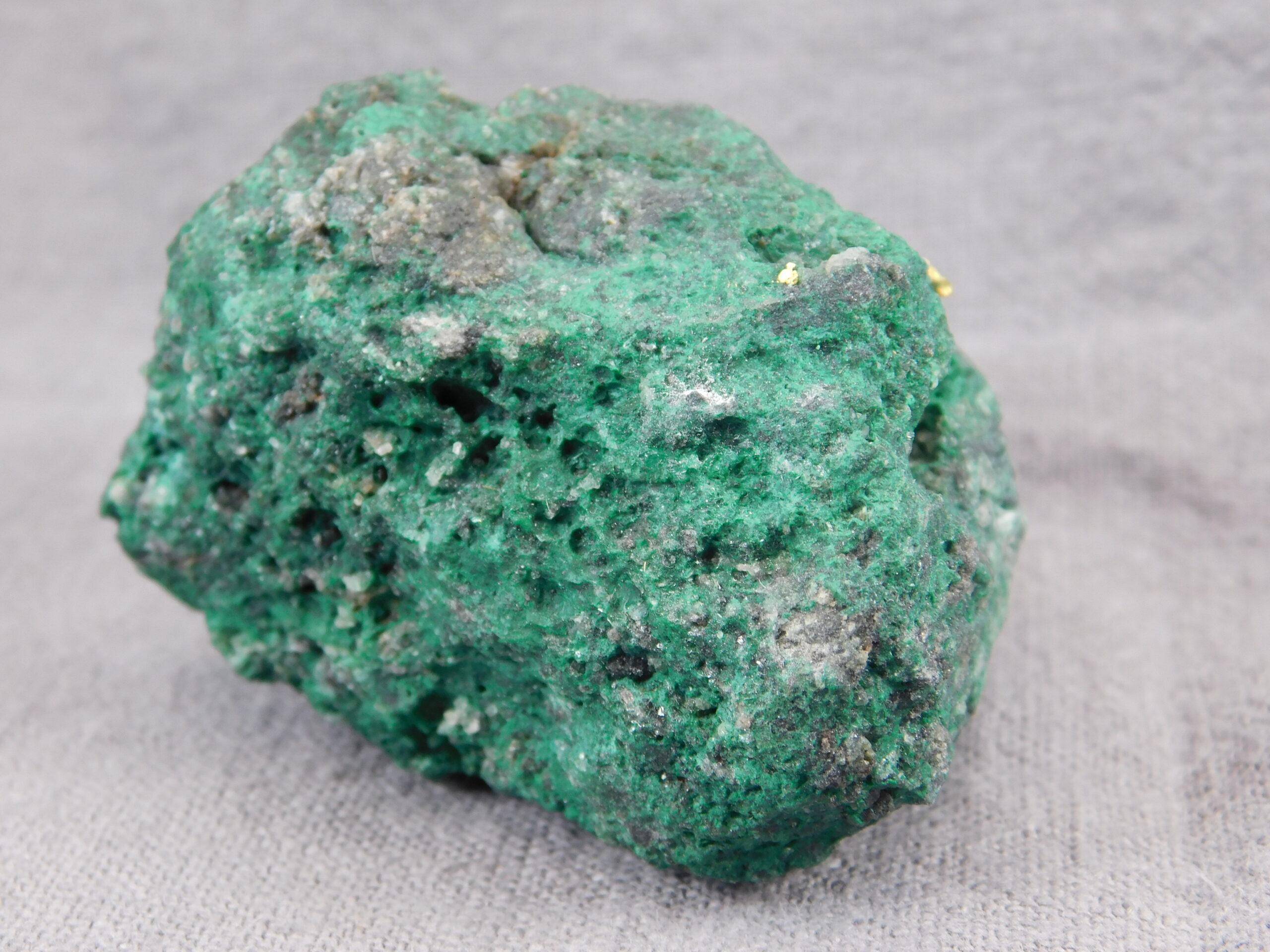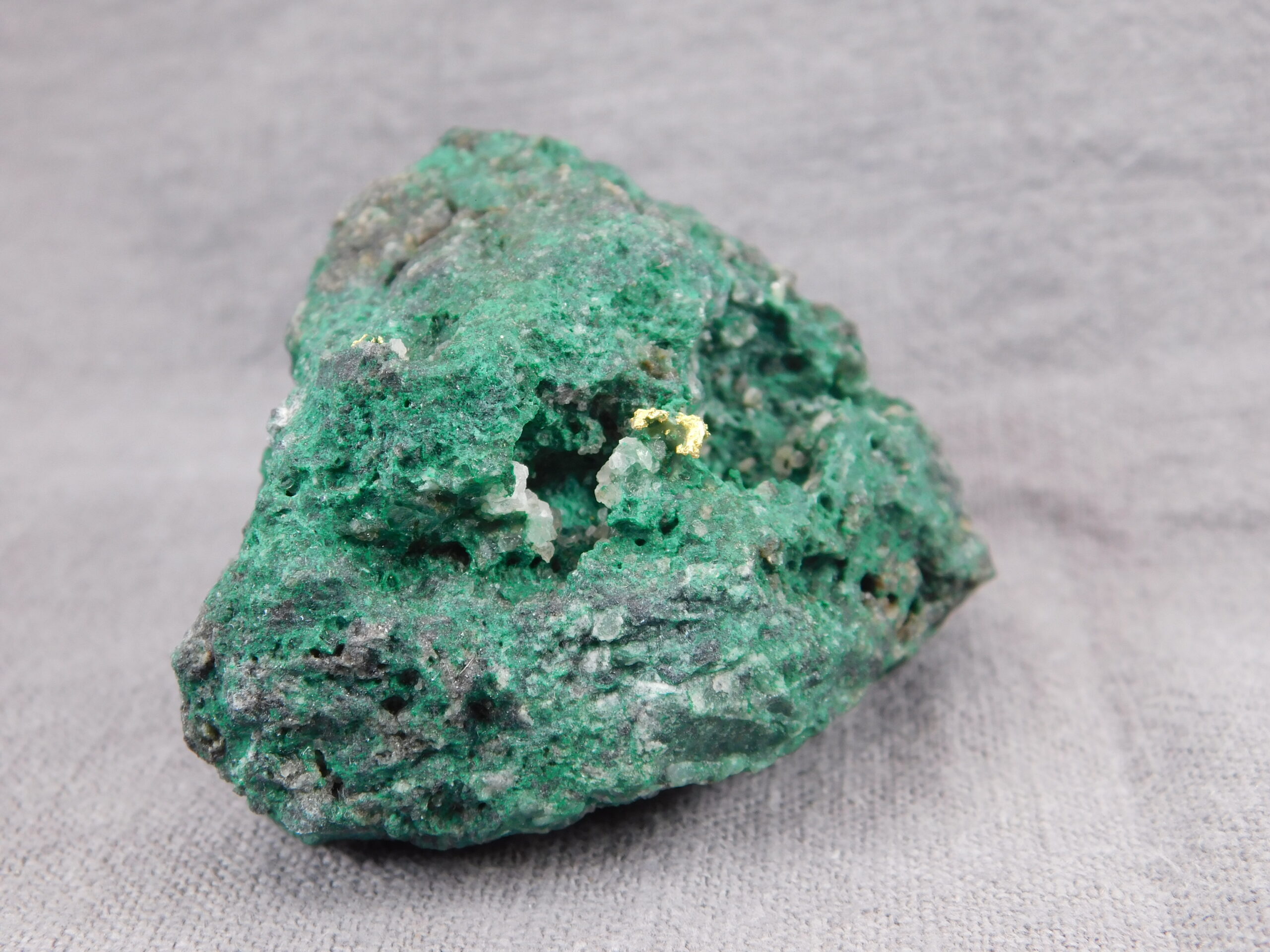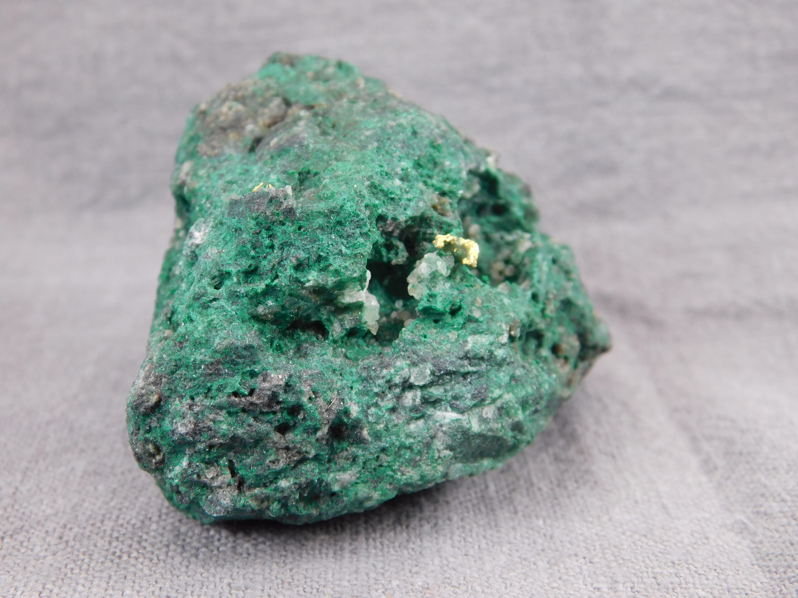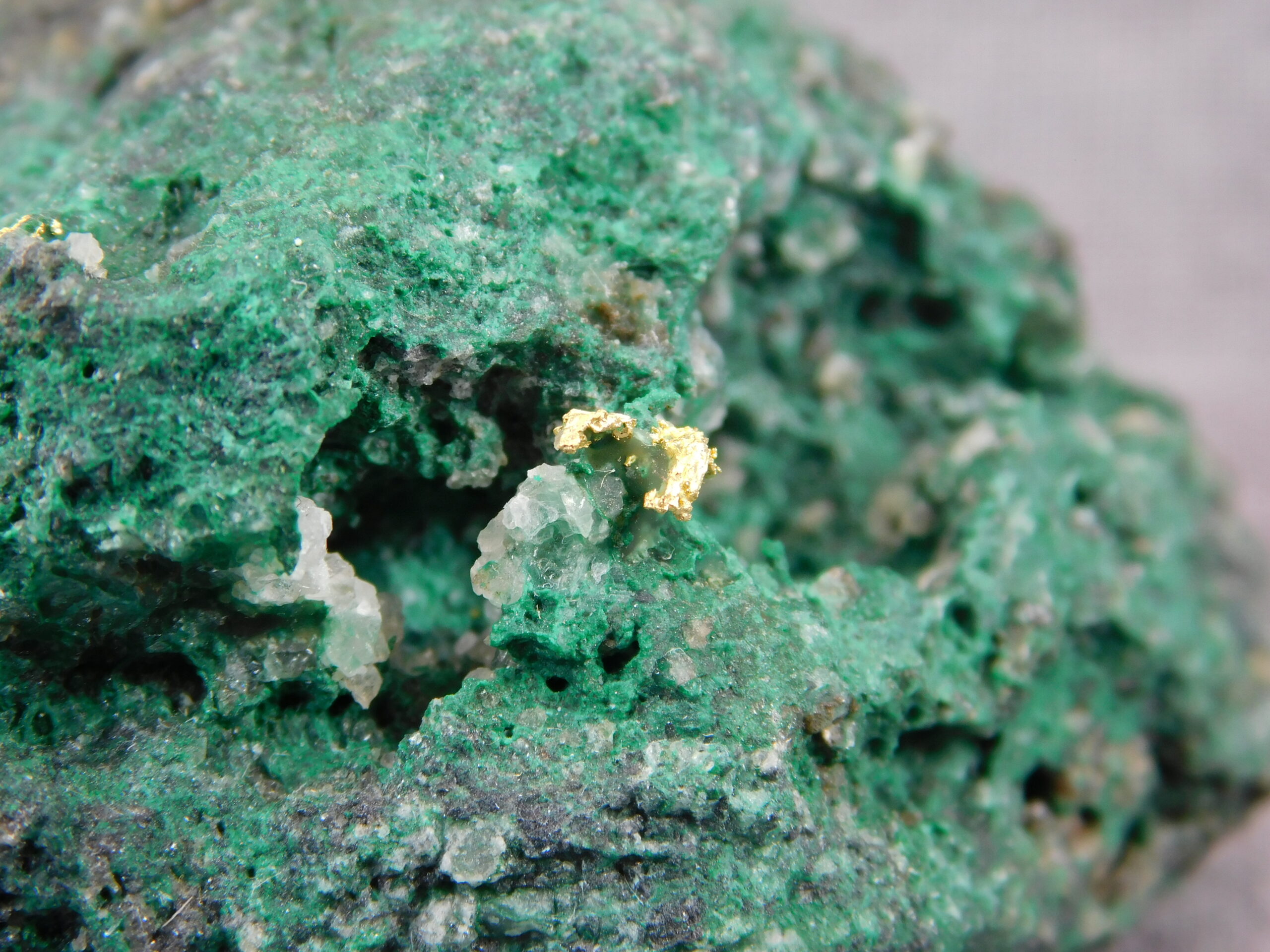 Ačkoli o mineralogické vzorky zlata rozhodně není na trhu nouze, tento vzorek nabízí díky své barevné kombinaci něco mimořádného. Keříčkovité agregáty zlata narůstají na zelené podložce prosycené malachitem a vytvářejí tak mimořádně atraktivní vzorek. Ukázka byla nalezena během našeho projektu zaměřeného na těžbu mědi v namibijské provincii Kunene. Vytěžené vzorky díky své estetické výjimečnosti vzbudily mimořádný ohlas sběratelské obce a již po několik let patří k bestsellerům firmy KARP.